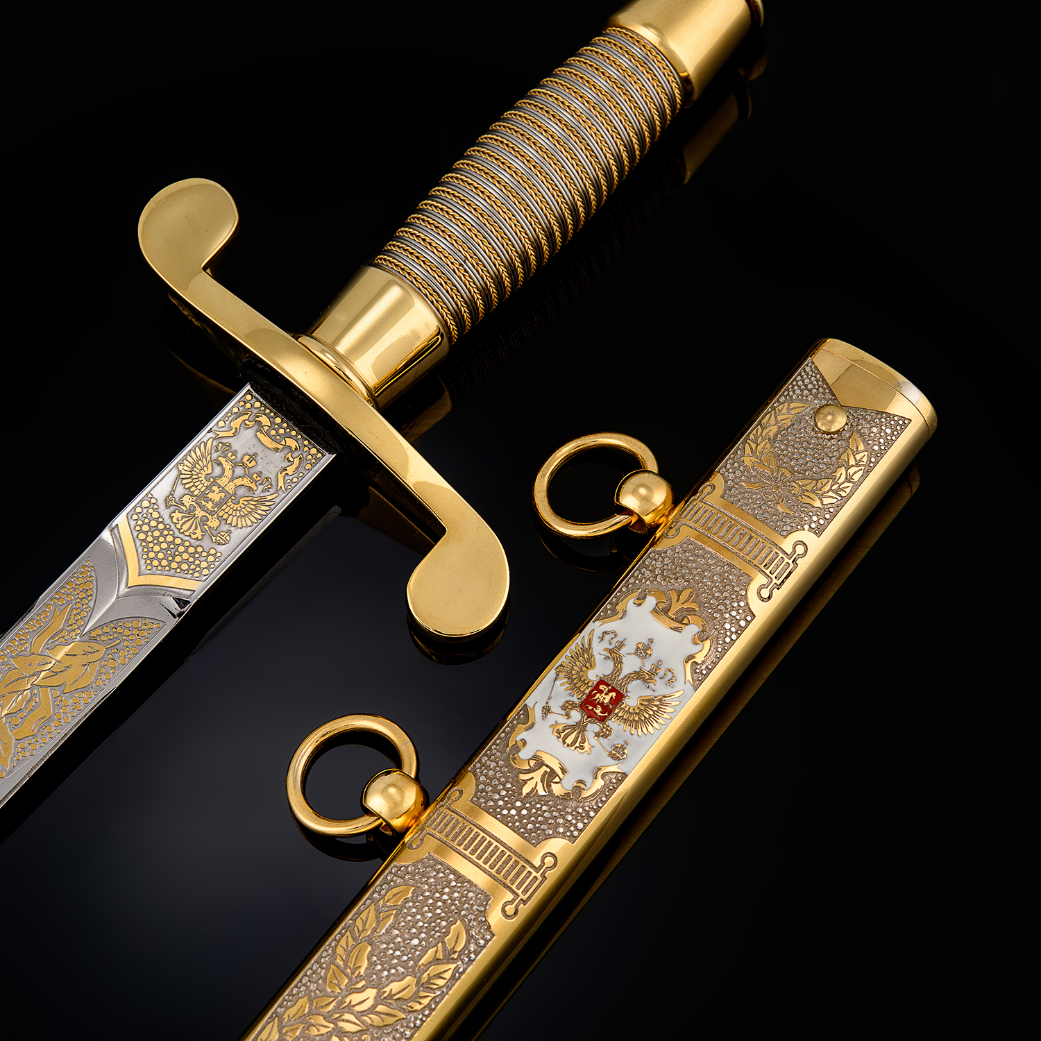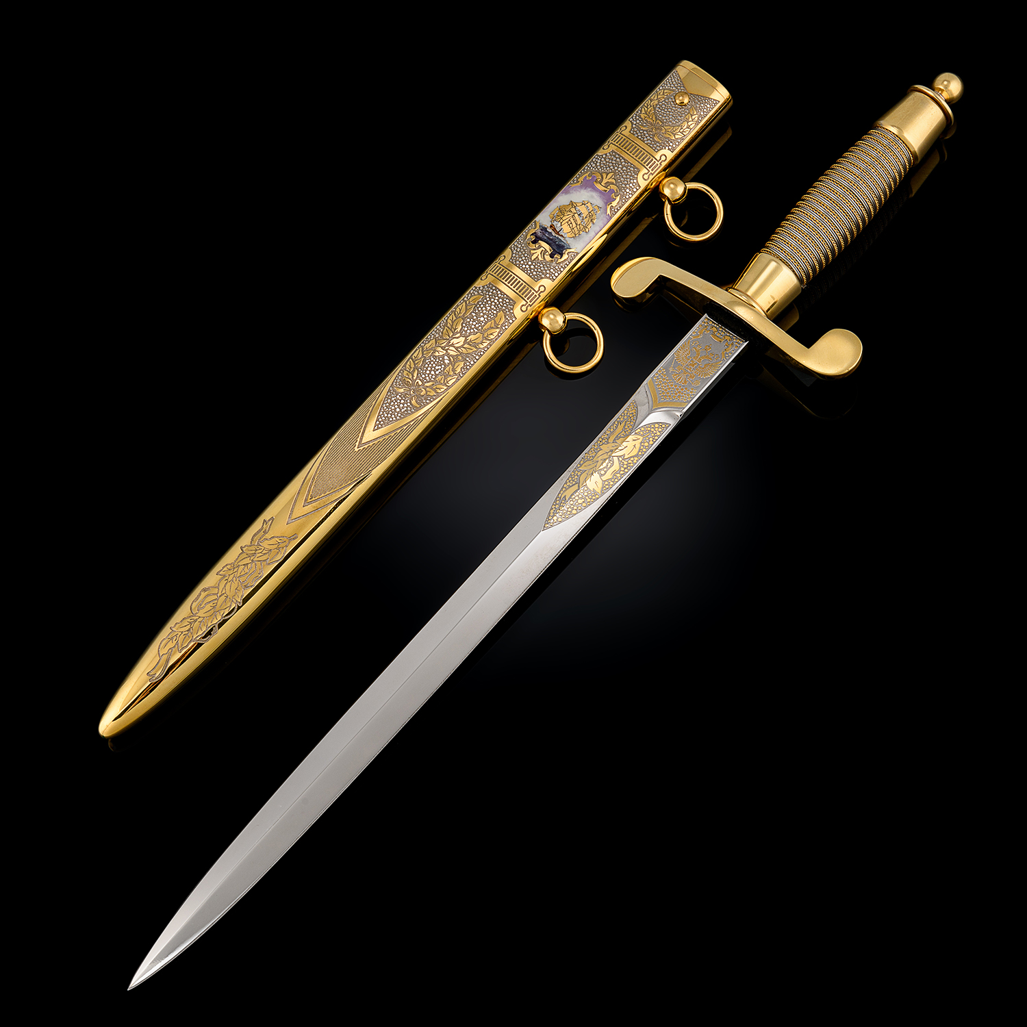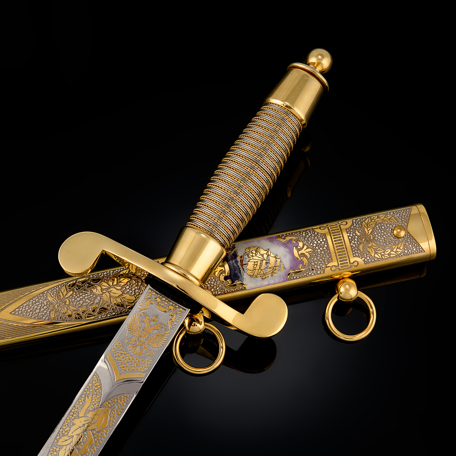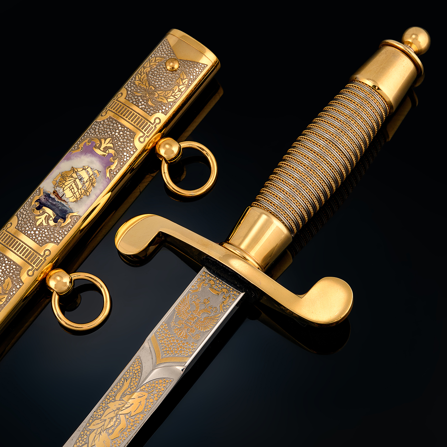 Кортик сувенирный "Морской". Златоуст.Материалы: сталь ЭИ-107 (40Х10С2М), латунь, никель, золото 999,9*, эмаль.