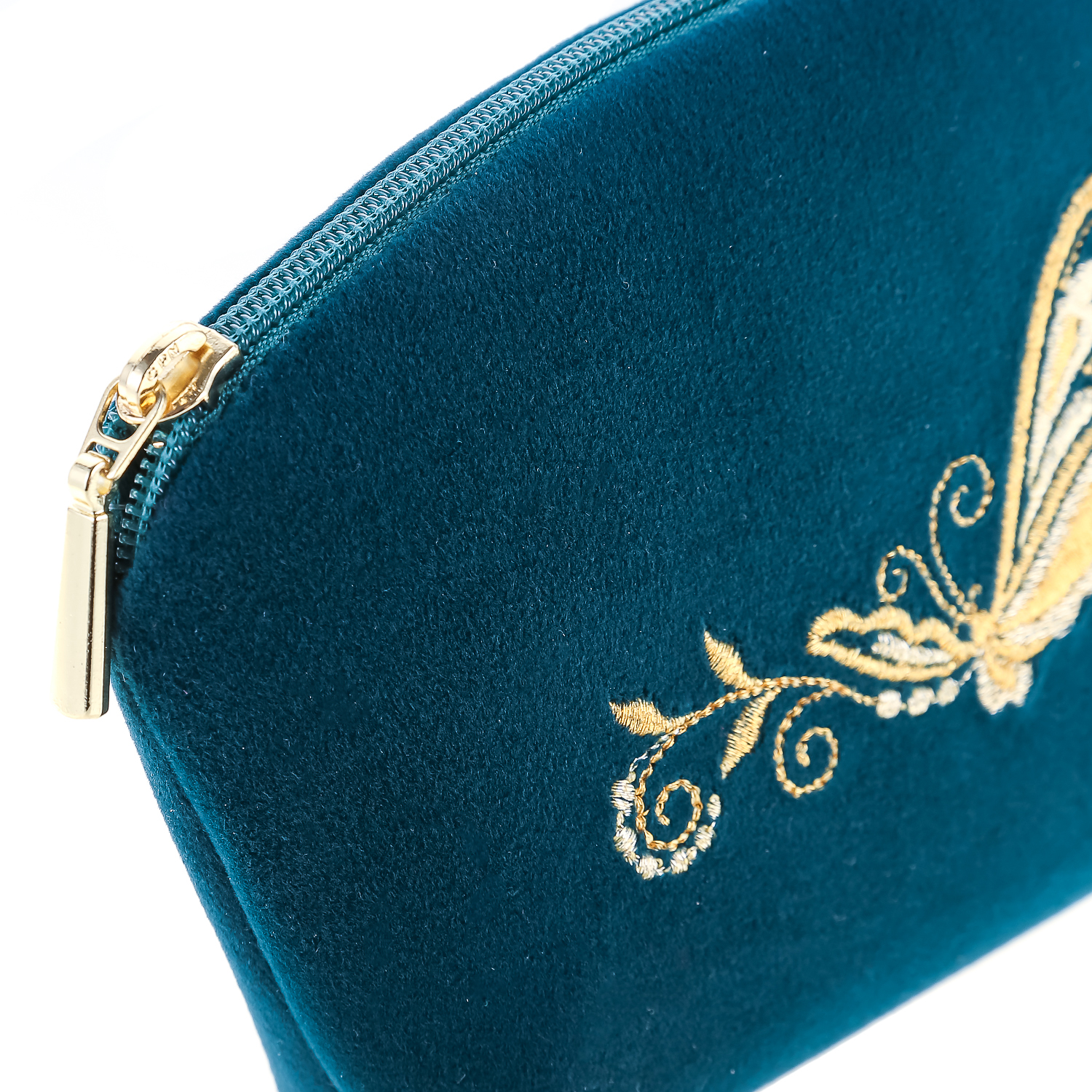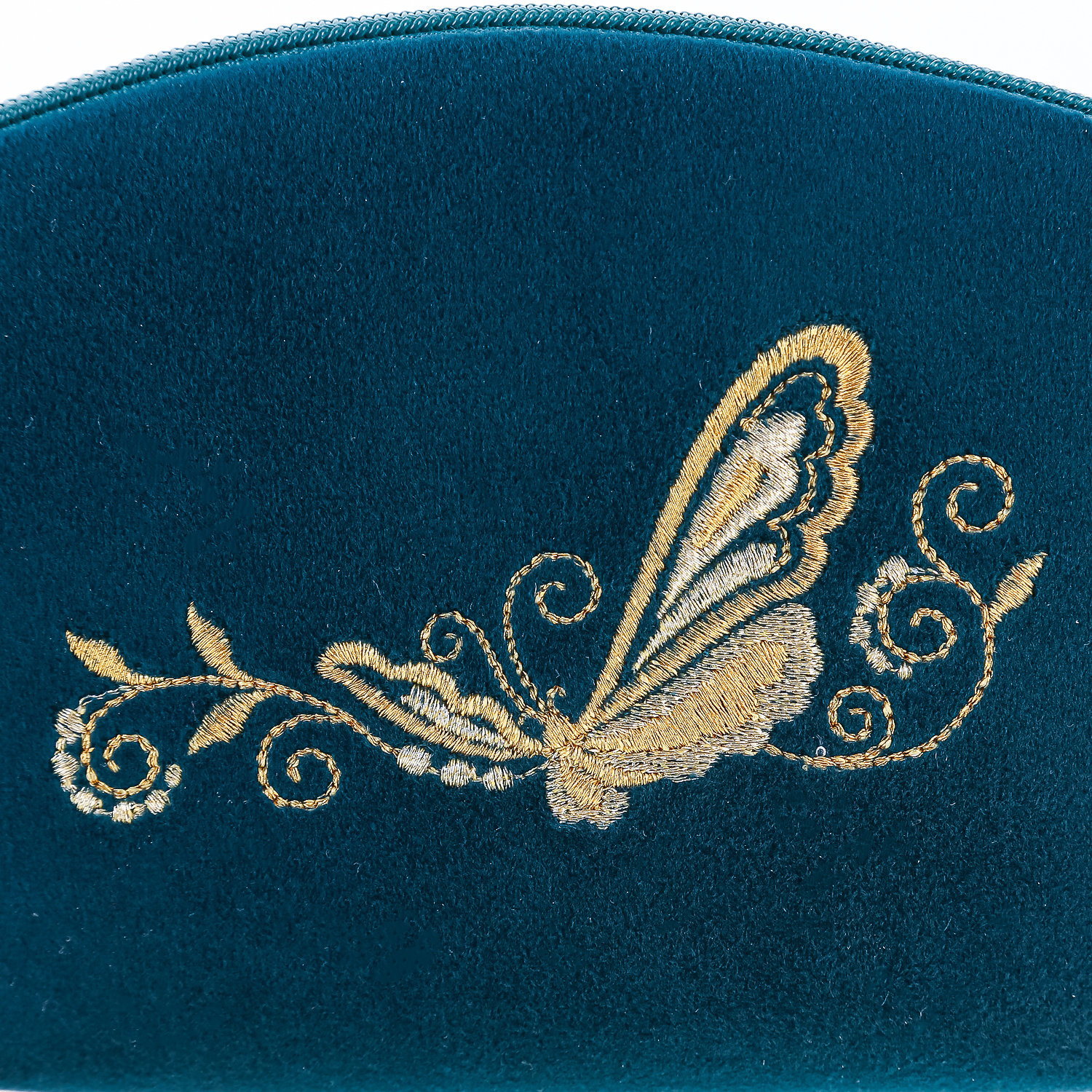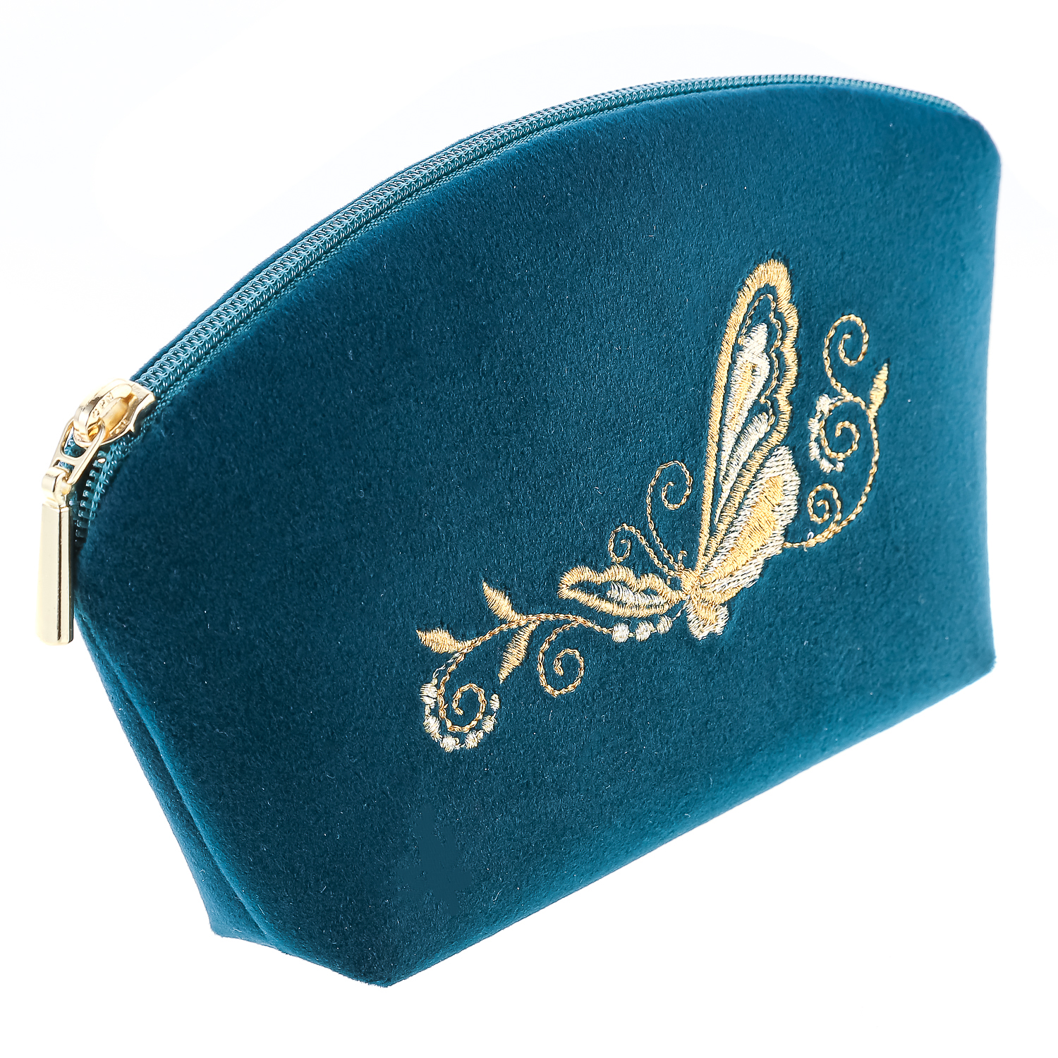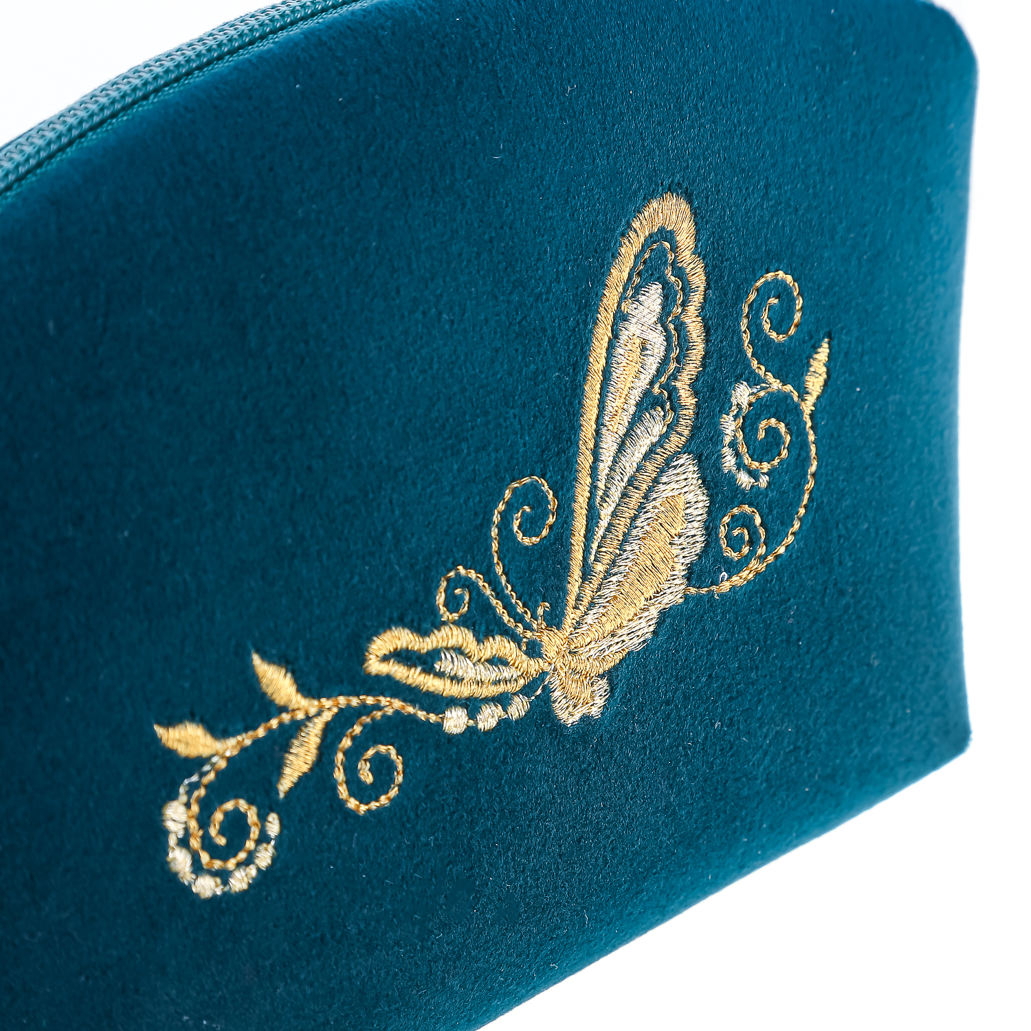 Косметичка бархатная "Бабочка". Морская волна с золотой вышивкой