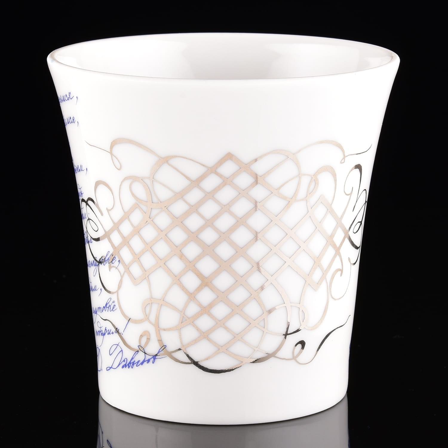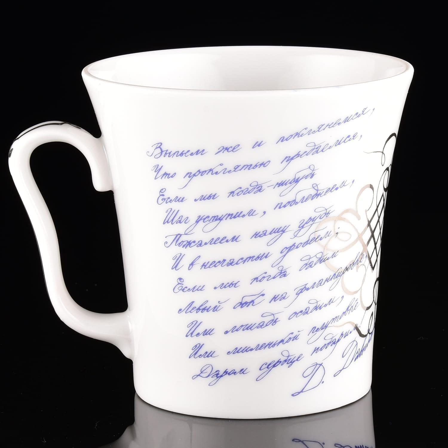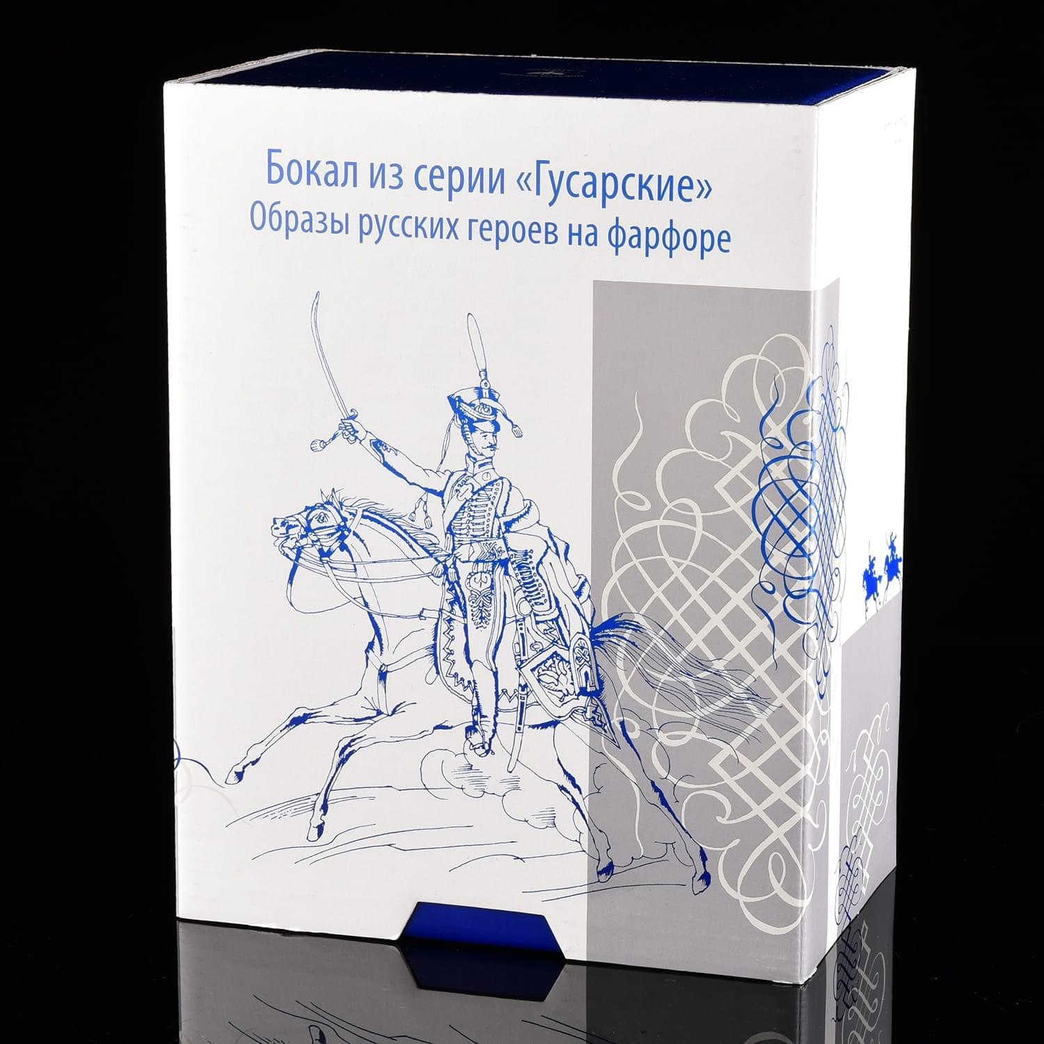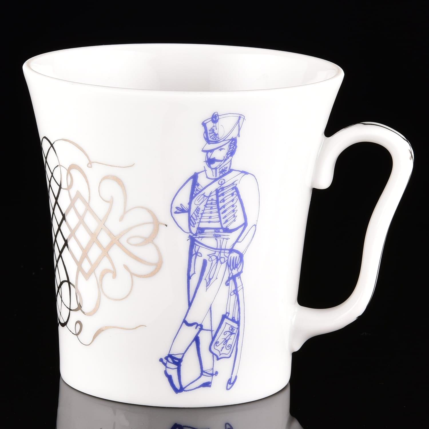 Этот образец авторской посуды украшен художественной композицией с образом русского гусара в экипировке, стоящего в вальяжной позе, и авторским текстом. Оригинальная работа мастеров Императорского фарфорового завода создаст бодрое настроение за едой и всегда напомнит о дарителе.Для изготовления бокала использована форма "Ленинградский". Его корпус оформлен вручную из твердого, не пористого фарфора, который отличается глубоким, насыщенным цветом благодаря особой рецептуре. разработанной ученым Виноградовым для Елизаветинской порцелиновой мануфактуры в 18 веке.