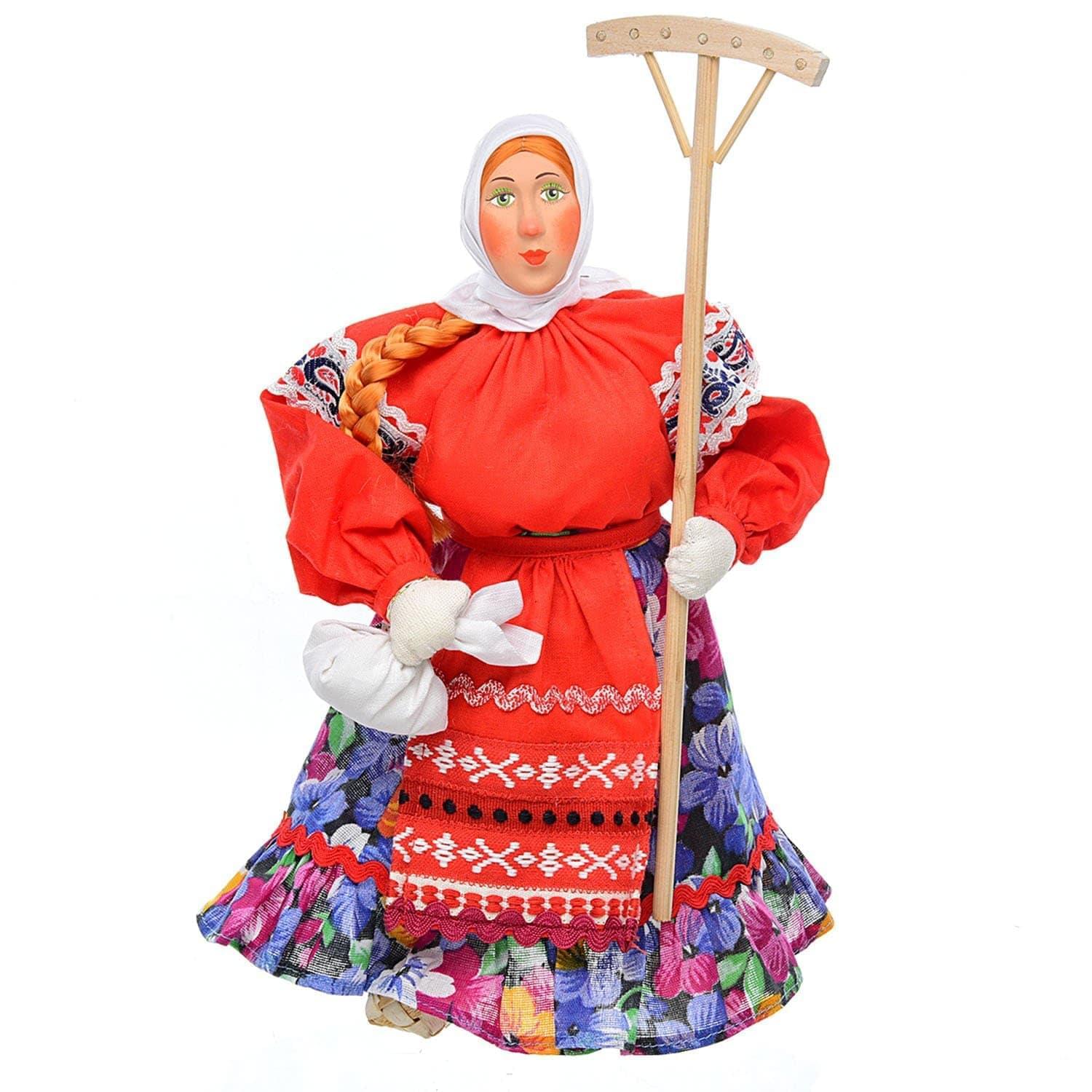 Как и многие авторские куклы, которые делались на Руси людьми, эта - изготовлена из твердого фарфора, ткани и цветных лоскутов. Личико оформлено из твердого фарфора и оформлено красками от руки. Особое внимание уделено деталям костюма: плетеные лапти и грабли, рубаха и передник с вышивками, юбочка и платок удивительно смотрятся друг с другом. Костюм для барышни сшит в соответствии с нюансами кройки и шитья русского народного костюма.