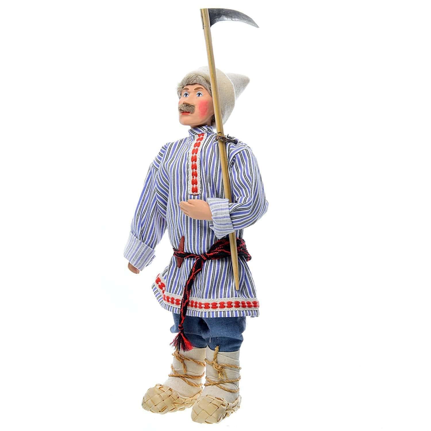 Перед Вами - образ русского мужика в крестьянском костюме, плетеных лаптях, рубахе-косоворотке с вышивкой, обернутой поясом-оберегом. Мужчина отправляется собирать траву после сенокоса. Эта кукла представляет собой особый род штучного сувенира, универсальный элемент декора для интерьера, который непременно порадует любителя небанальных образцов хэндмейда и русского фольклора.