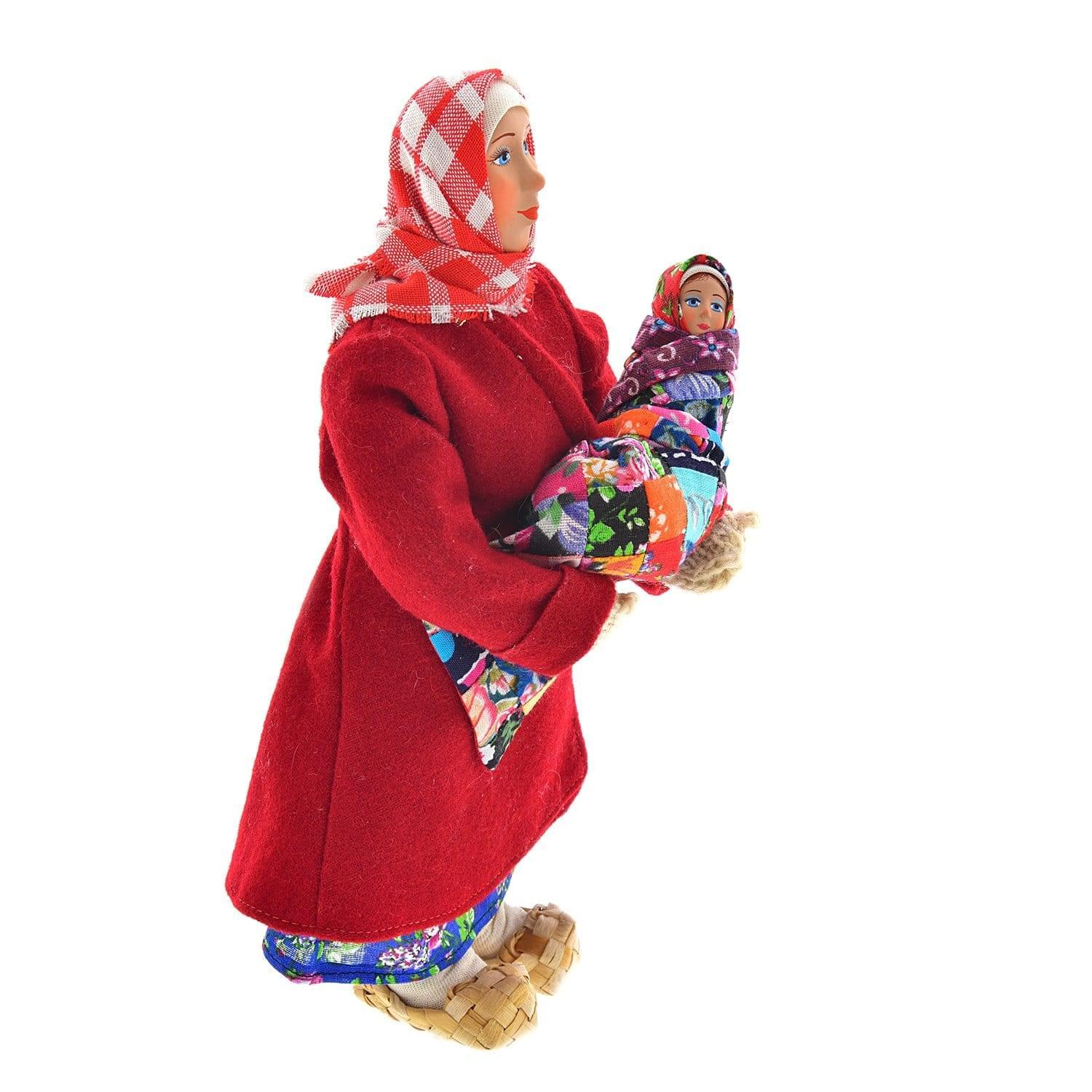 Кукла на Руси всегда была оберегом и талисманом. Ее дарили на Рождение, Свадьбу, вот почему сегодня она является ходовым сувениром. К тому же она демонстрирует красоту и своеобразие русского народного костюма.  Предлагаемая авторская кукла в образе бабы-крестьянки с младенцем на руках  сделана  из керамики и текстиля и является  ярким и запоминающимся  подарком, традиционным  элементом декора в русском стиле.