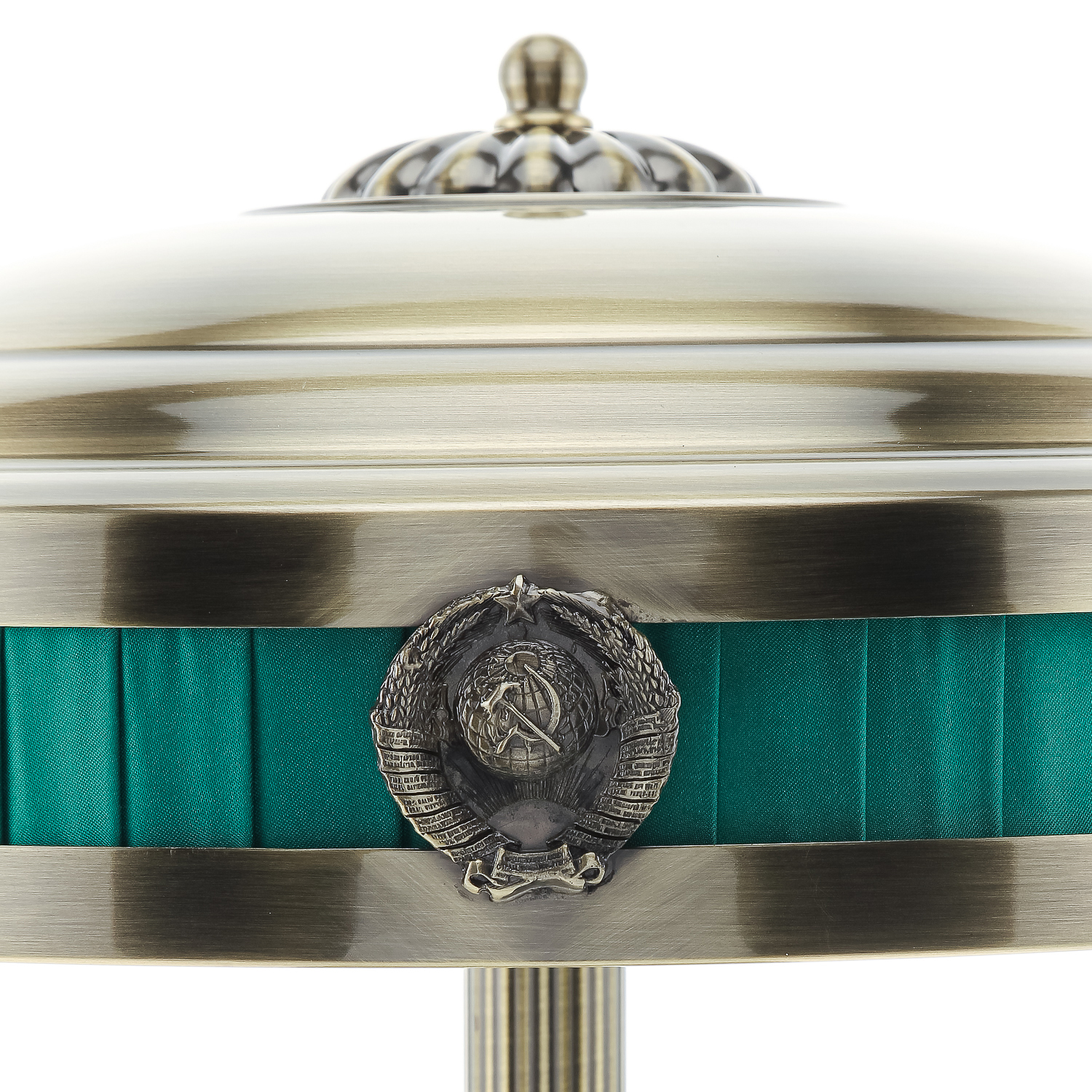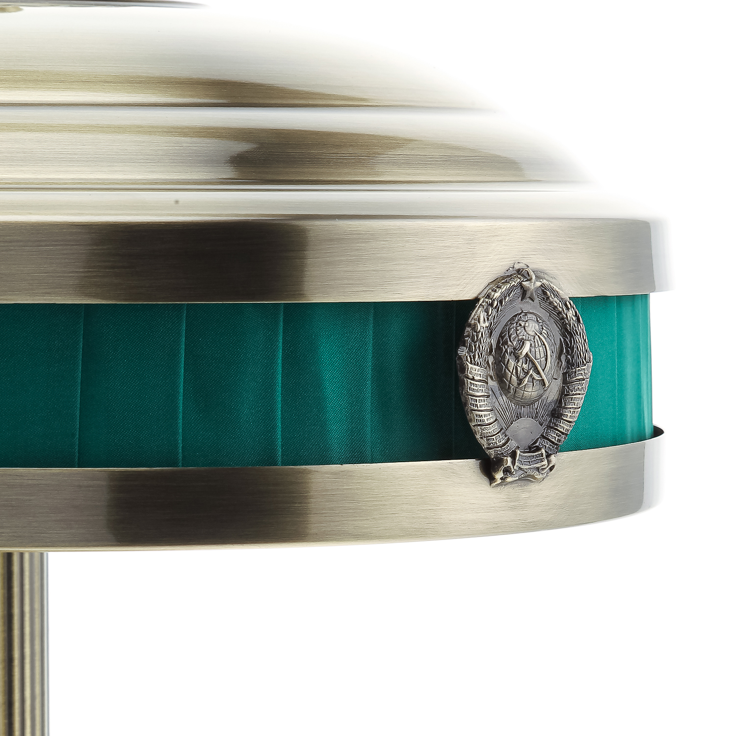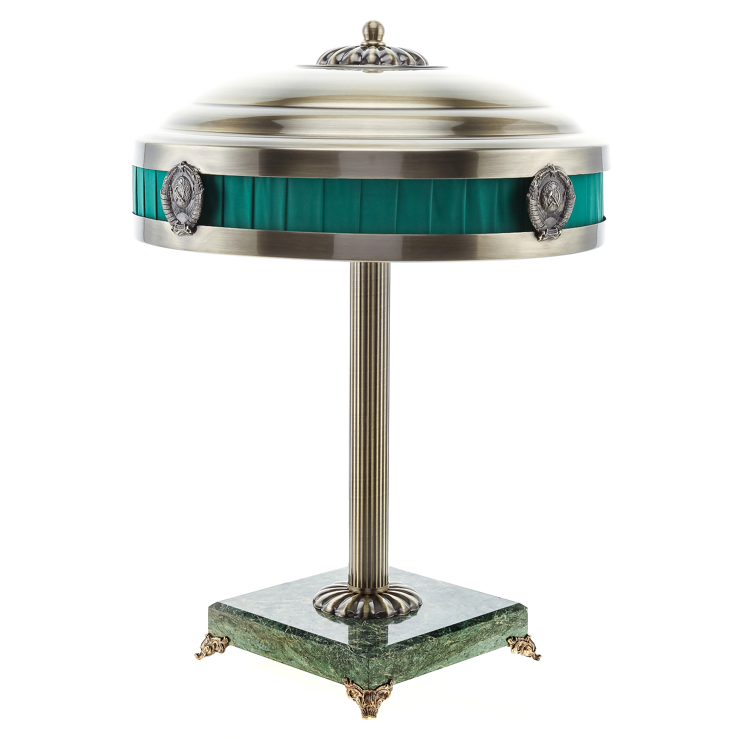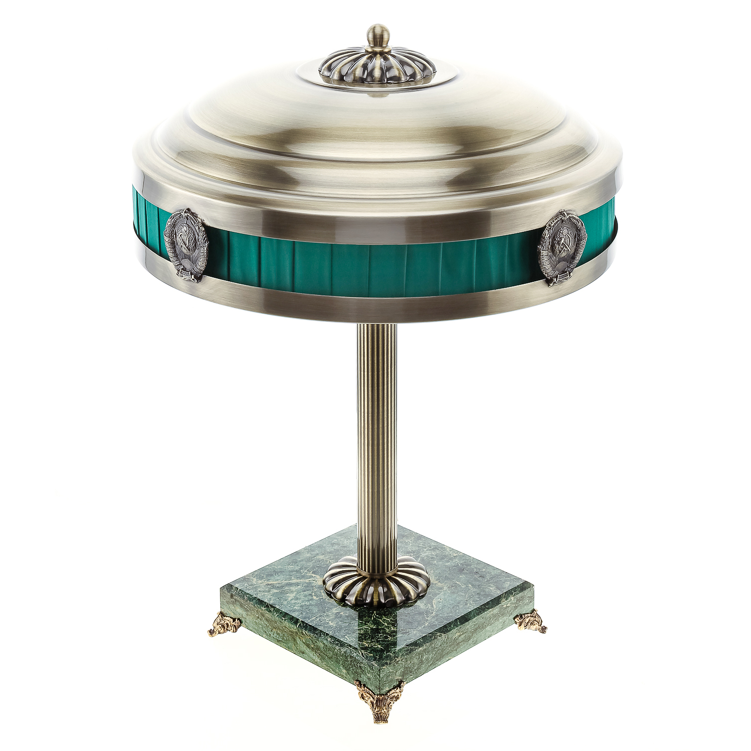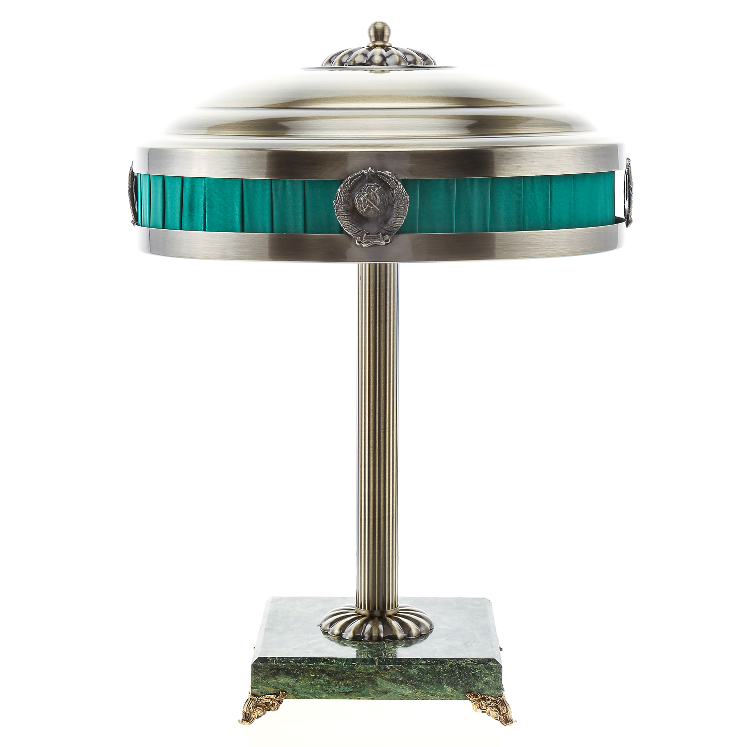 Лампа в стиле сталинский ампир выразительная примета времени, когда миром правили вожди. Актуальна она и сегодня! Круглый абажур с гербом СССР и основание в виде квадрата из змеевика соединены стойкой-цилиндром, тонированным золотом.Элементы корпуса отлиты на основе музейных форм из латуни. Лампа является функциональным интерьерным аксессуаром и стильным элементом эклектичного декора.