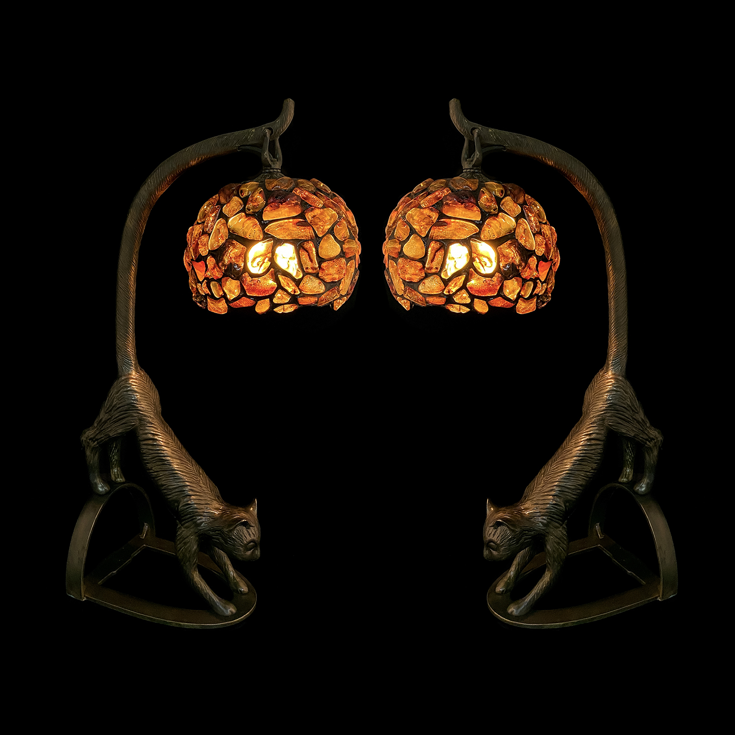 Комплект из двух настольных ламп из янтаря и бронзы "Коты"