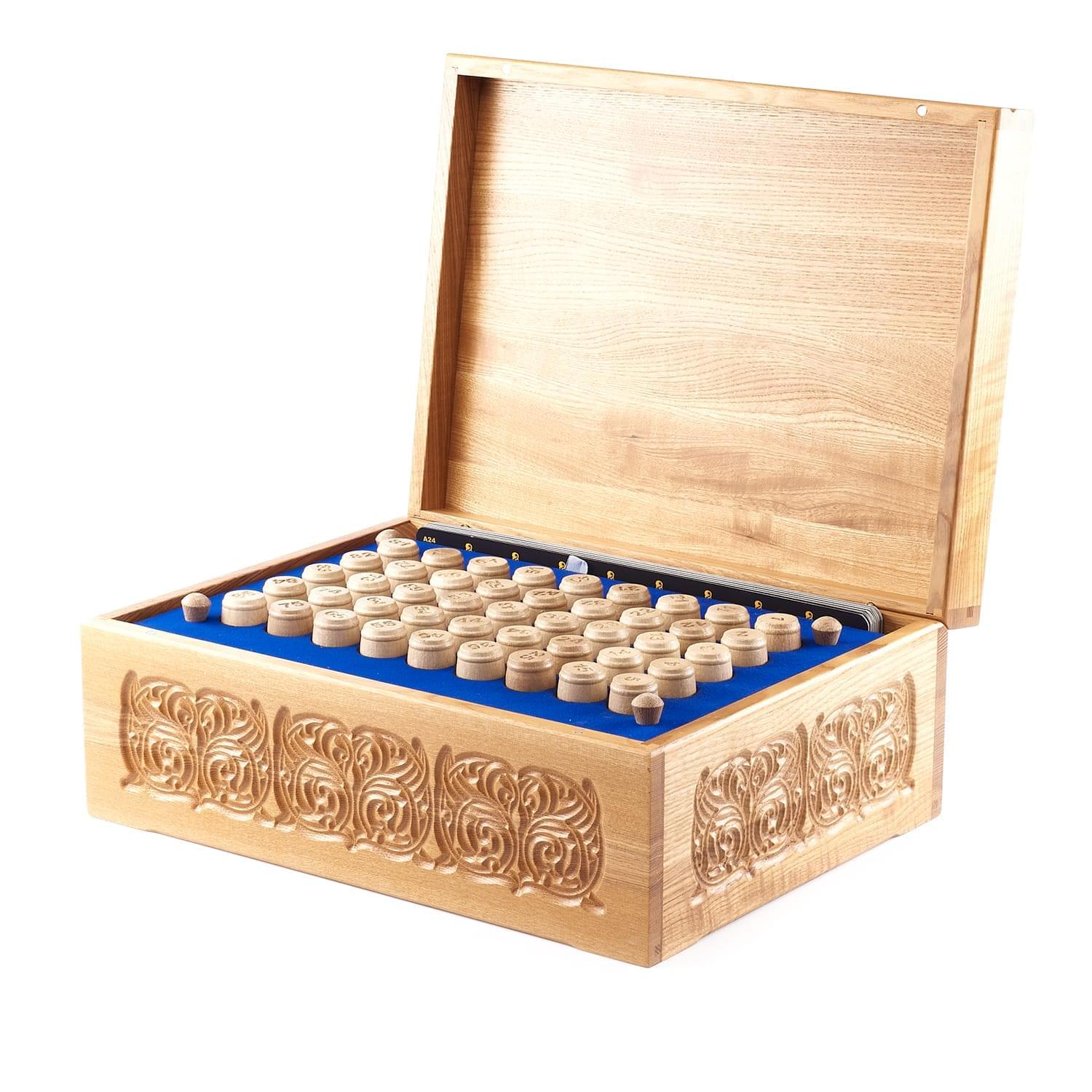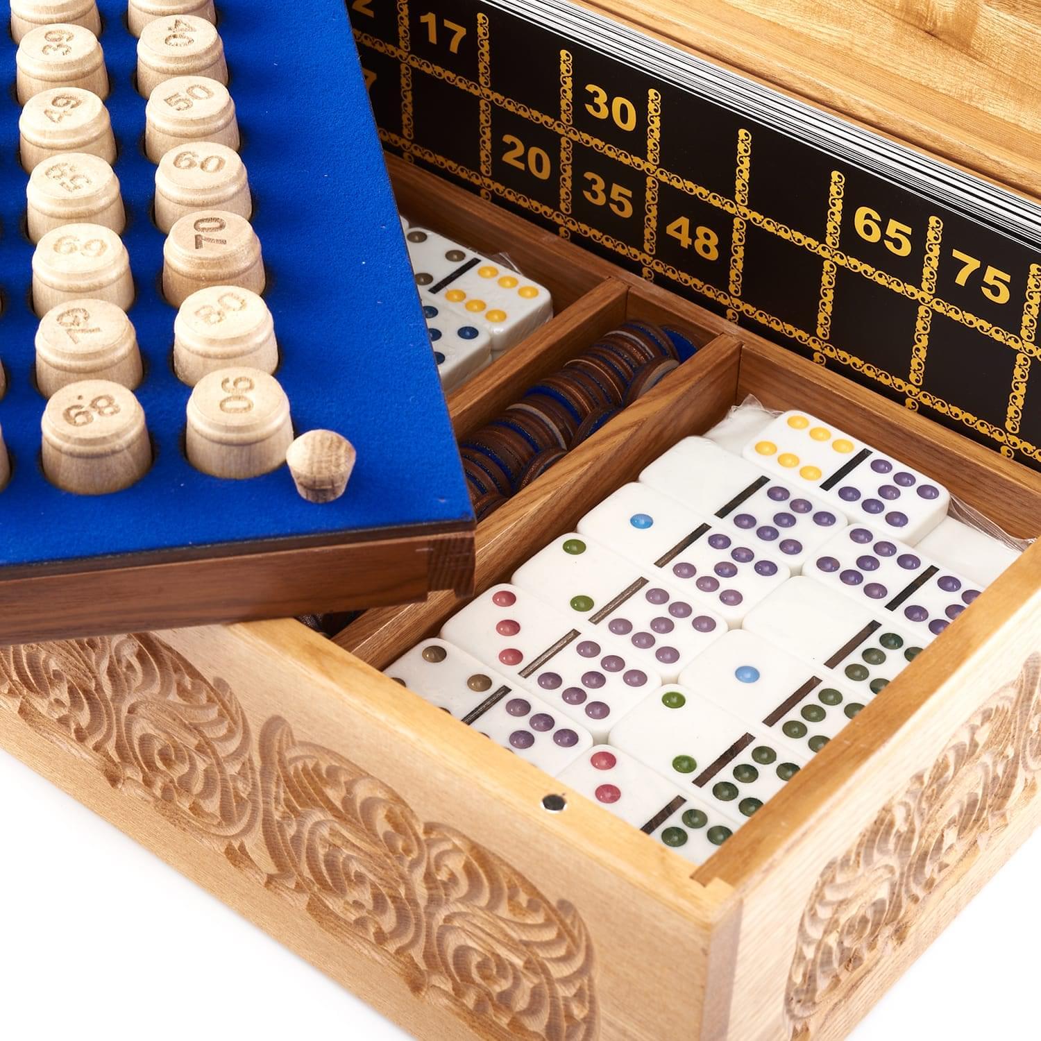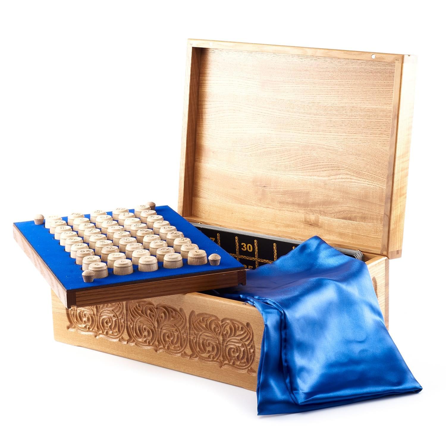 Лото украшено резьбой, на которую вдохновила картина художника Михаила Авилова «Поединок Пересвета с Челубеем на Куликовом поле» (1943 год). На полотне изображен бой русского богатыря Пересвета с татарским воином Челубеем, по преданию, предшествовавший Куликовской битве. В поединке оба воина погибли, однако победа осталась за Пересветом. Конь смог довезти его до русских войск, тогда как Челубей оказался выбитым из седла. По статистике, 55% жителей Земли хоть раз играли в лотерею. Официально лото было основано в 2004 году, хотя идея игры возникла за десять лет до. Запуск европейской лотереи хотели приурочить к выходу новой европейской валюты Евро, но технически и организационно воплотить задумку не успели. Шансы на получение максимального выигрыша в лото составляют 1 к 76 235 760. Материалы: граб, мореный ясень. Размеры: Бочонок - 3 см. Шкатулка - 12 х 32 х 24 см. .
