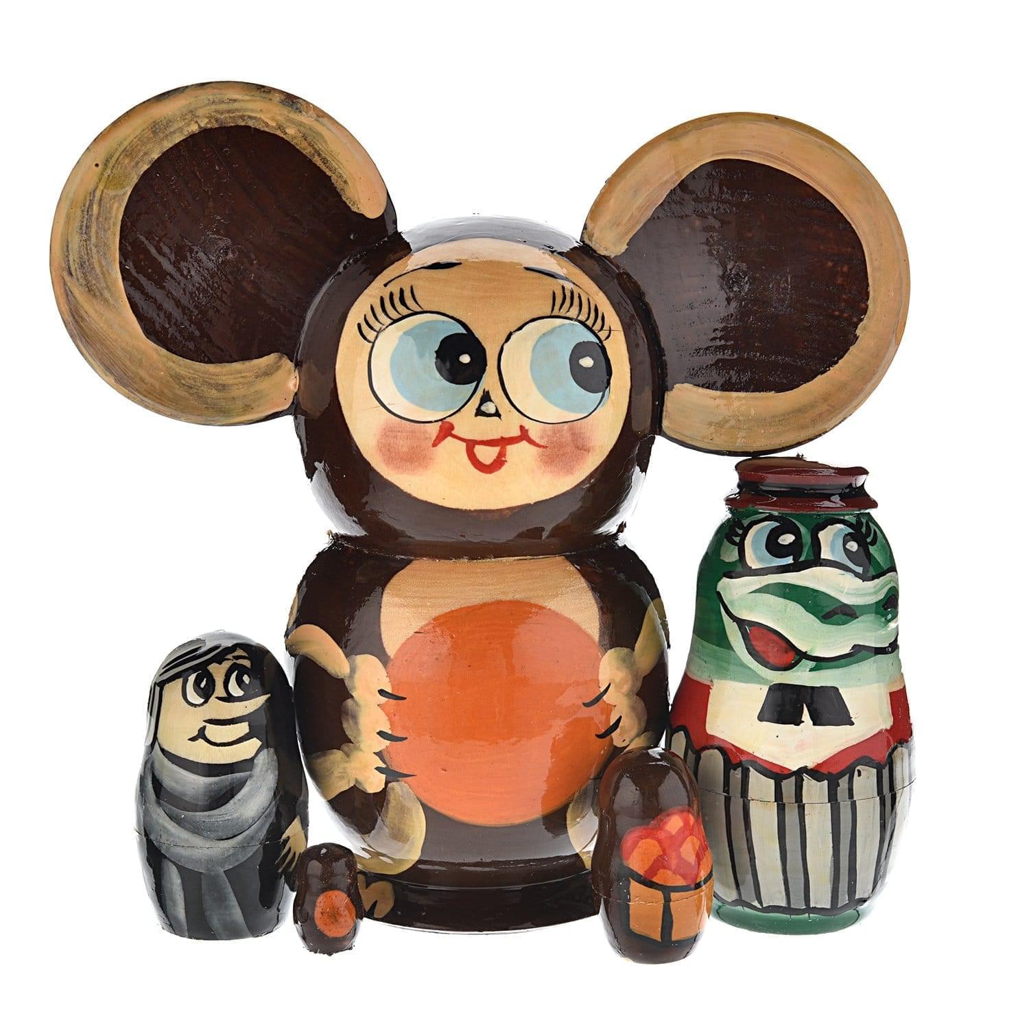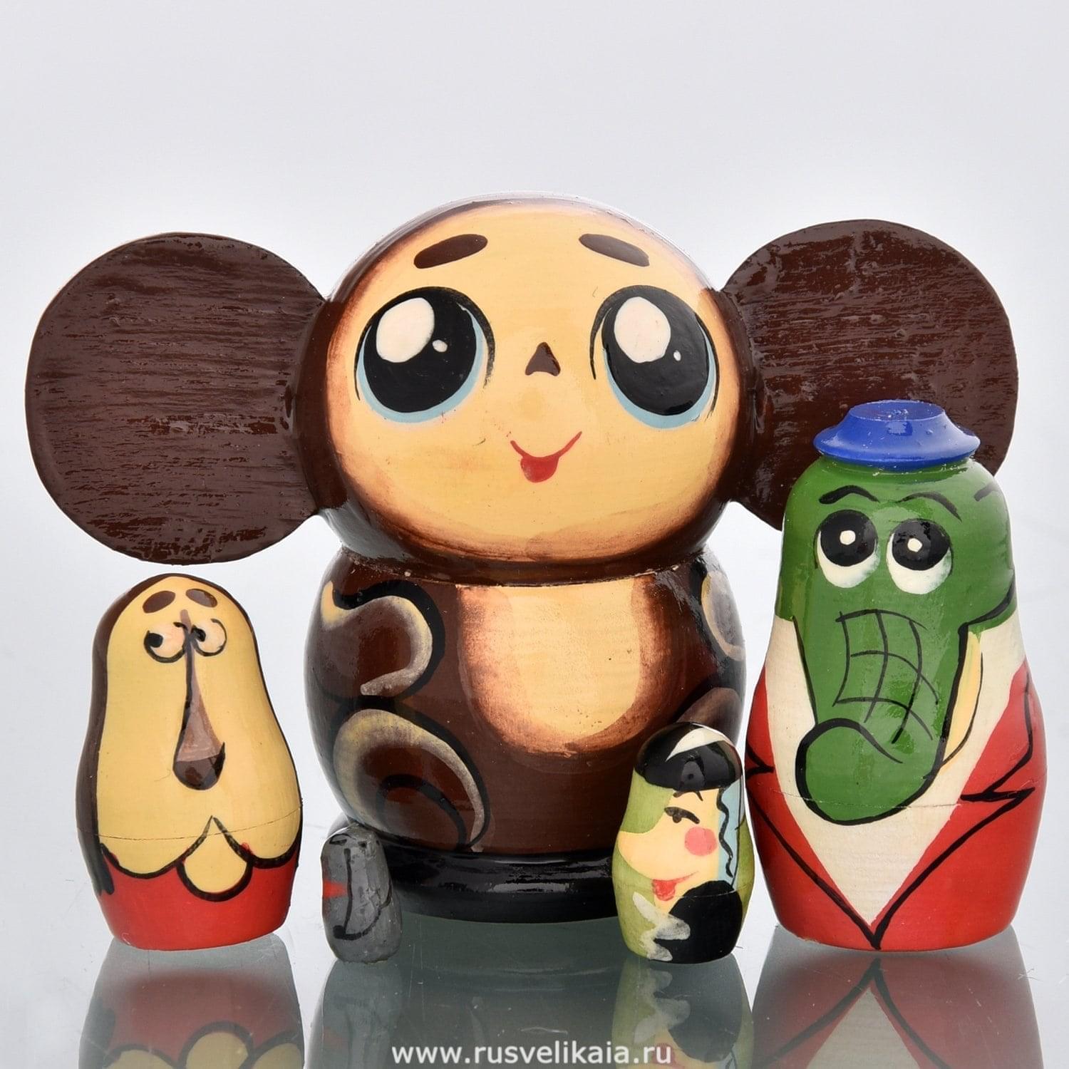 Вот и дошли дела до того, что русская деревянная кукла матрешка предстала перед нами в виде славного персонажа советского мультипликационного эпоса - чебурашки. Ушастый зверек в виде куклы-футляра из дерева, внутри которой кроются еще четверо: крокодил-Гена, старуха Шапокляк и пес, станет прекрасным подарком соотечественнику или иностранному гостю...