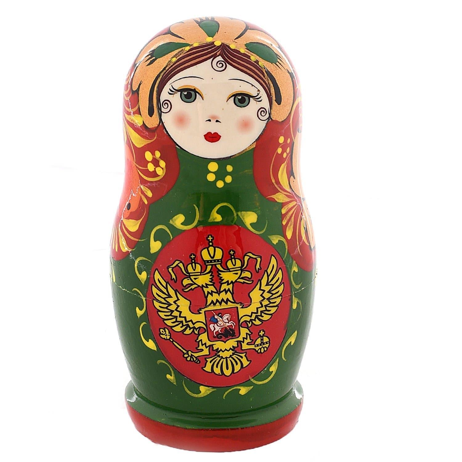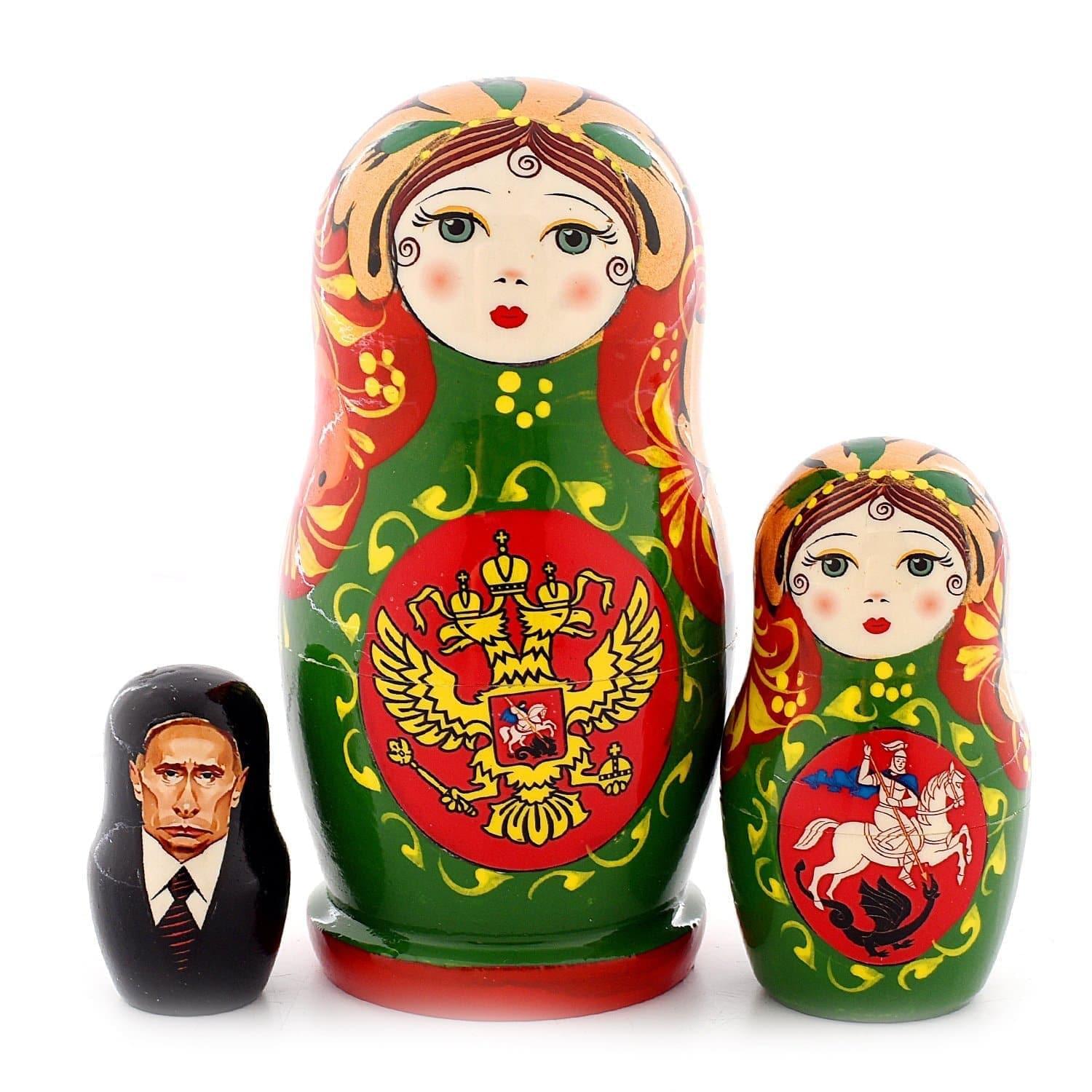 Матрешка с гербом России, матрешка с гербом Москвы и матрешка с изображением президента Владимира Путина - символичные презенты на память о посещении нашей страны. Каждая куколка изготовлена вручную токарем по дереву из твердой и легкой, липы и расписана квалифицированным художником-рисовальщиком в технике свободной кистевой росписи: Роспись покрыта защитными слоями прозрачного (гипоаллергенного) лака...