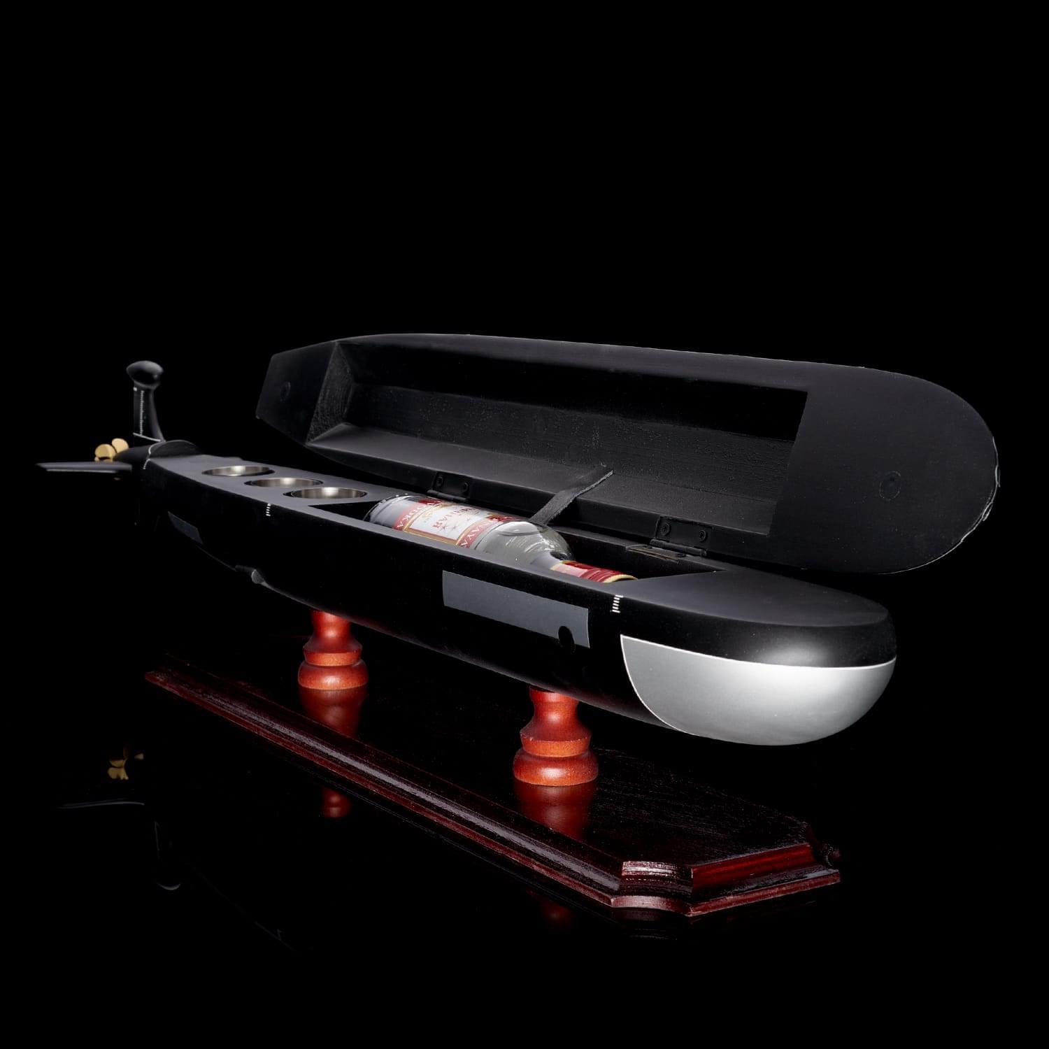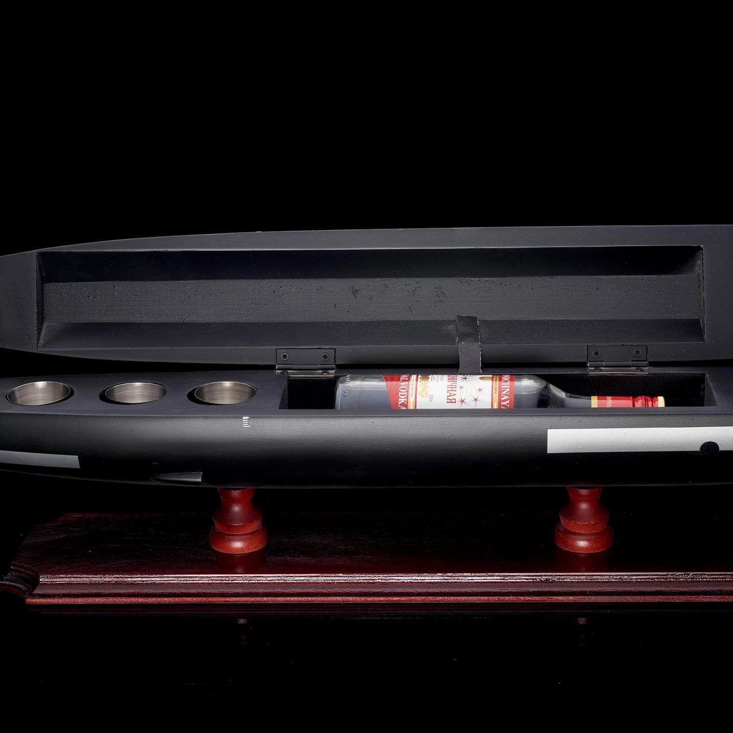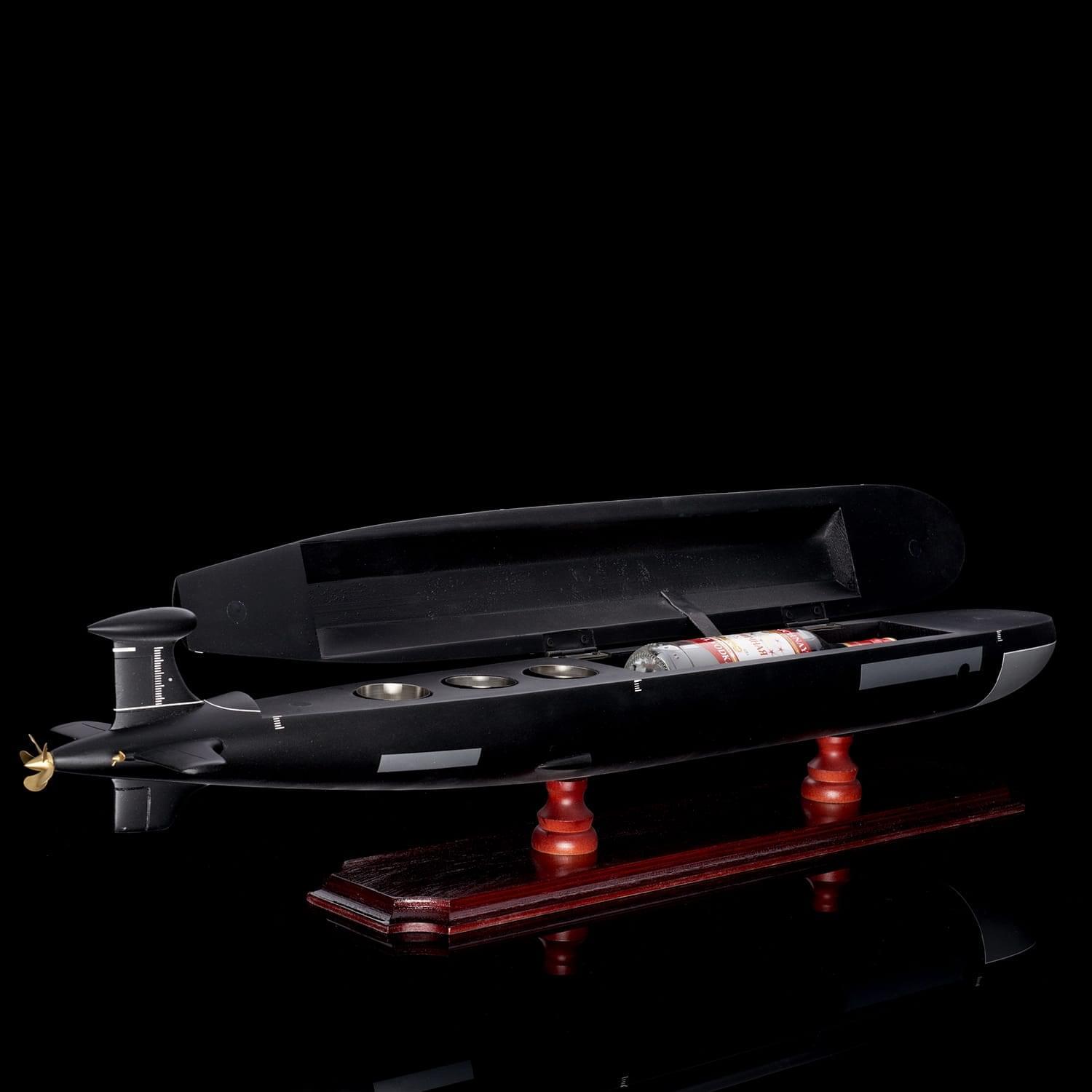Дополнит интерьер рабочего кабинета или квартиры макет-бар, выполненный в виде модели подводной лодки. Модель отличается высокой детализацией и качественной сборкой. Макет рассчитан на хранение одной бутылки. Также бар укомплектован тремя металлическими стопками. Подводная лодка установлена на постамент из натурального дерева, гармонично сочетающийся с цветом модели. Подлодка Щука 671РТМК разработана советским конструктором Г. Н. Чернышевым. В свое время эти подлодки представляли собой основу атомного флота СССР. Щука 671РТМК принимали участие во многих важных операциях, главные из которых: Атрина и Апорт. .