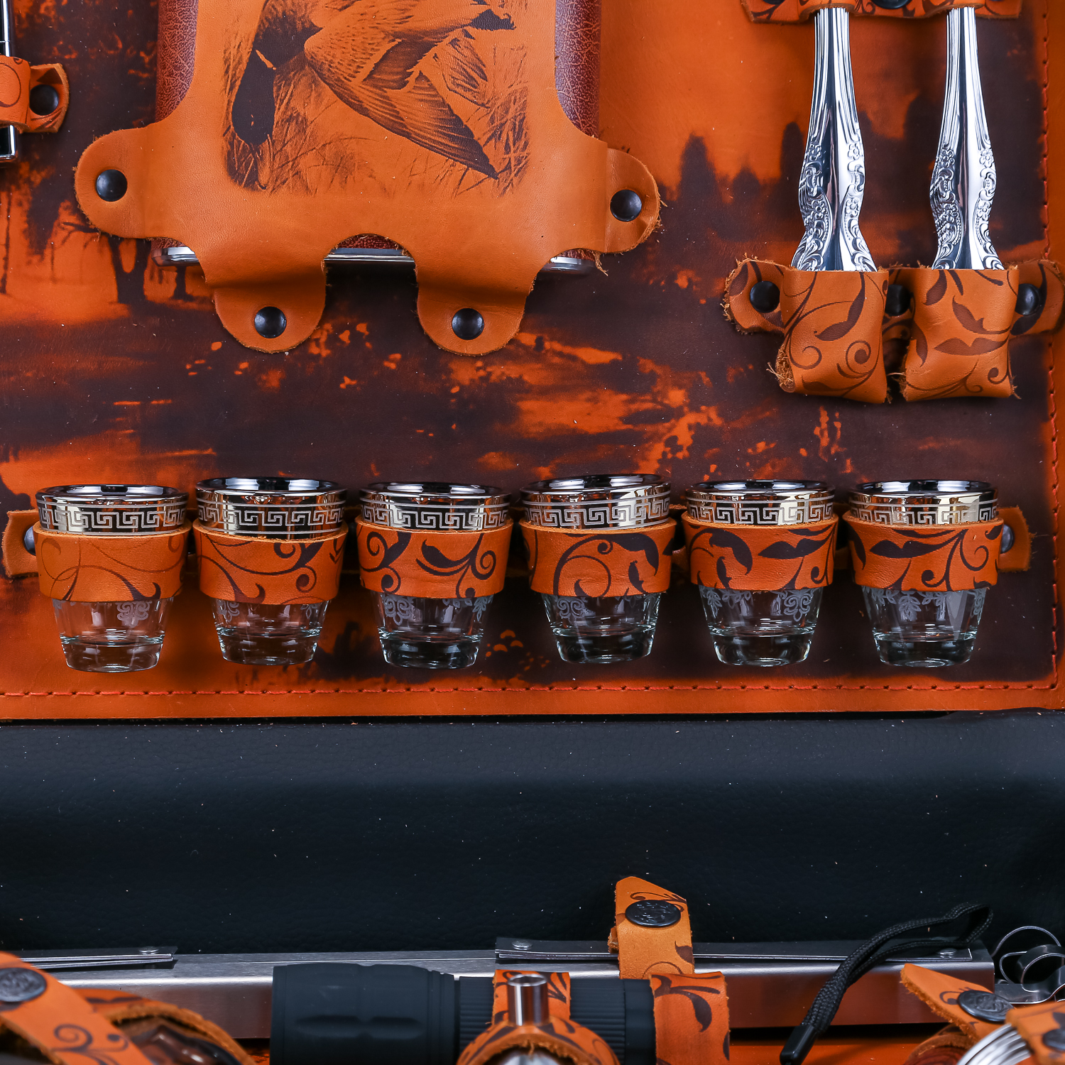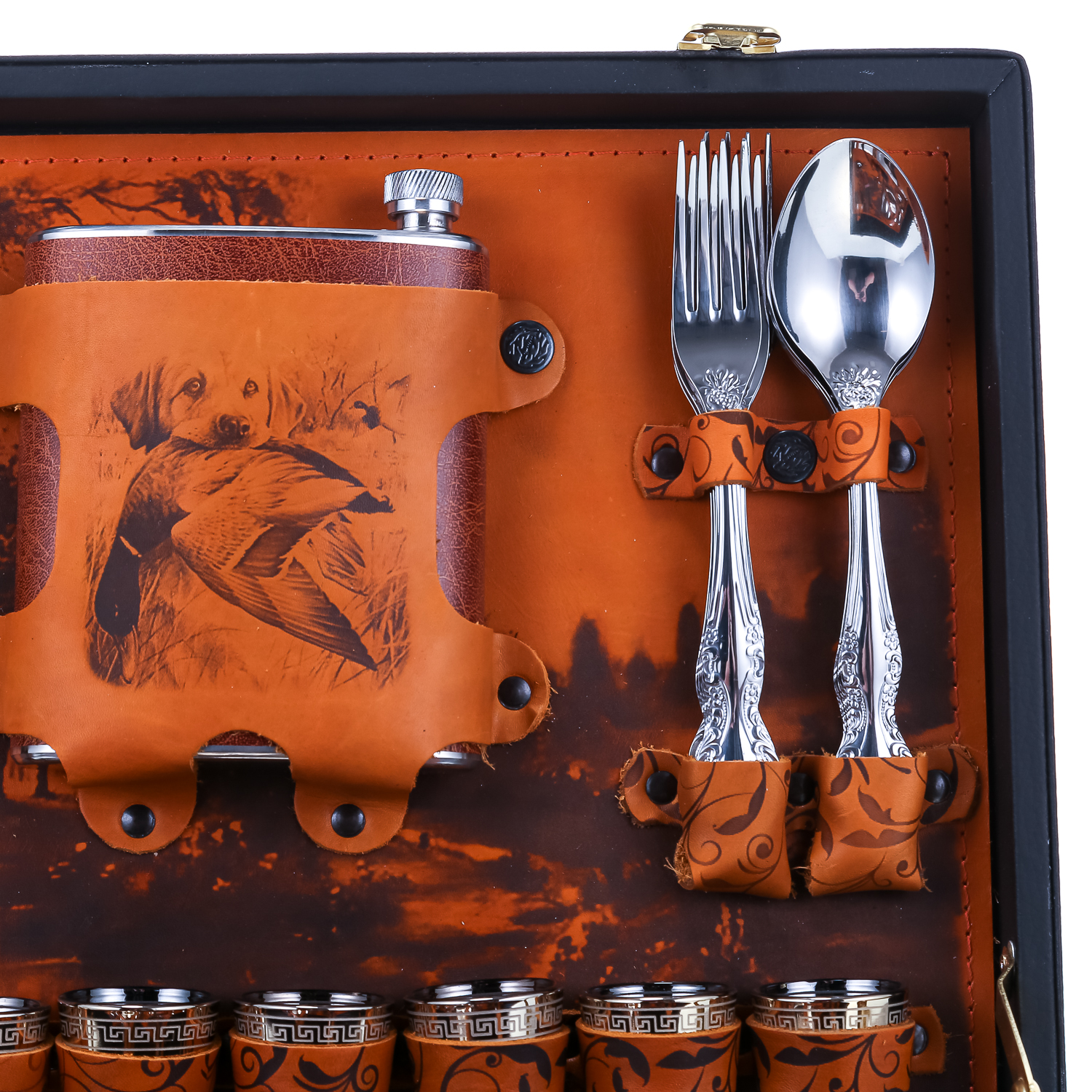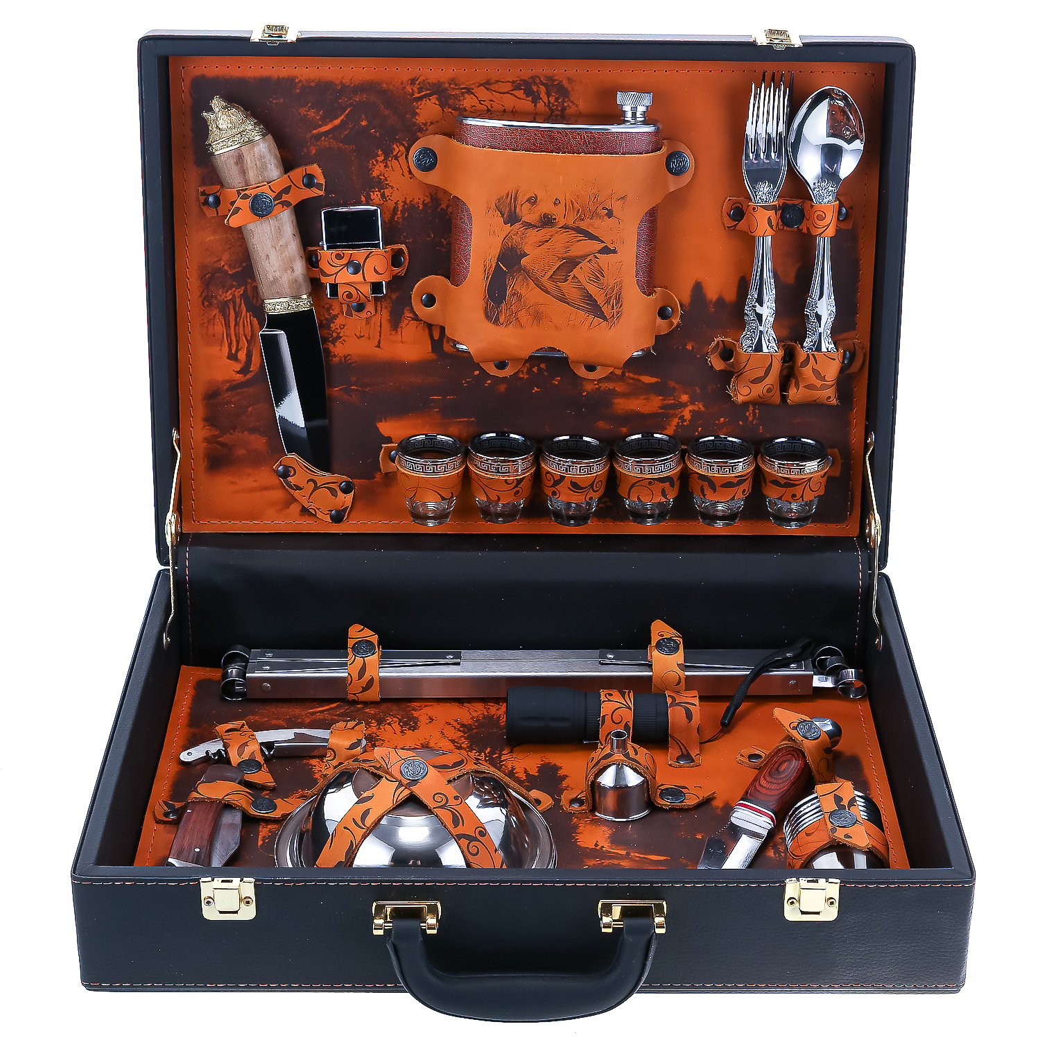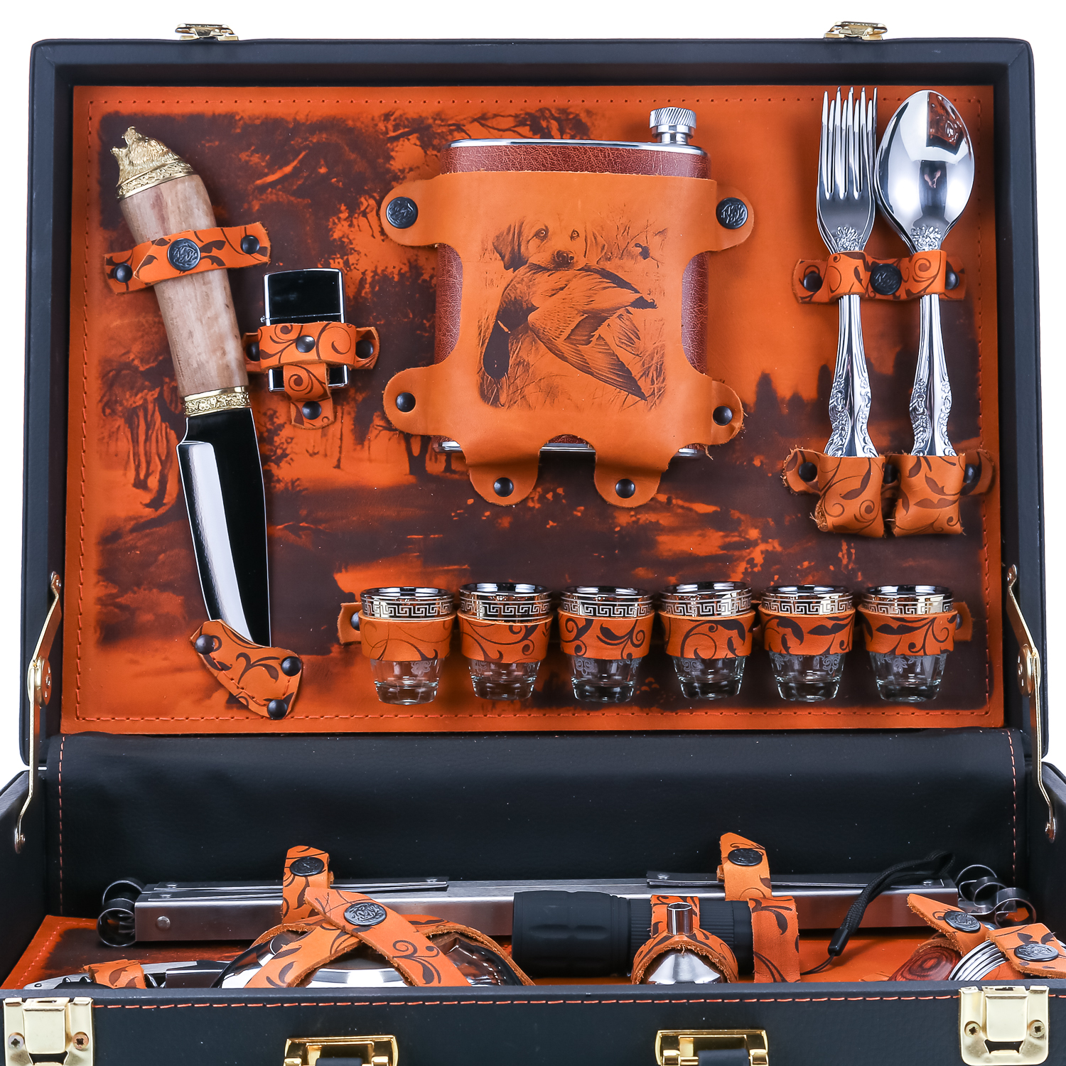 Комплектация: фляга, стопка 6 шт., вилка 6 шт., ложка 6 шт., нож 3 шт., зажигалка, мангал, фонарь, воронка, стакан 6 шт., тарелка 6 шт., штопор.
