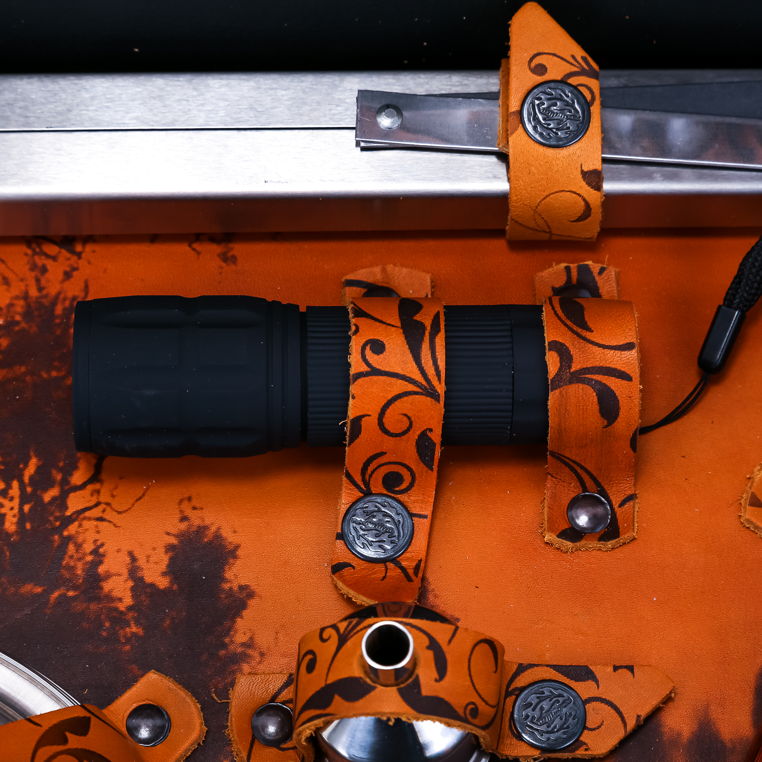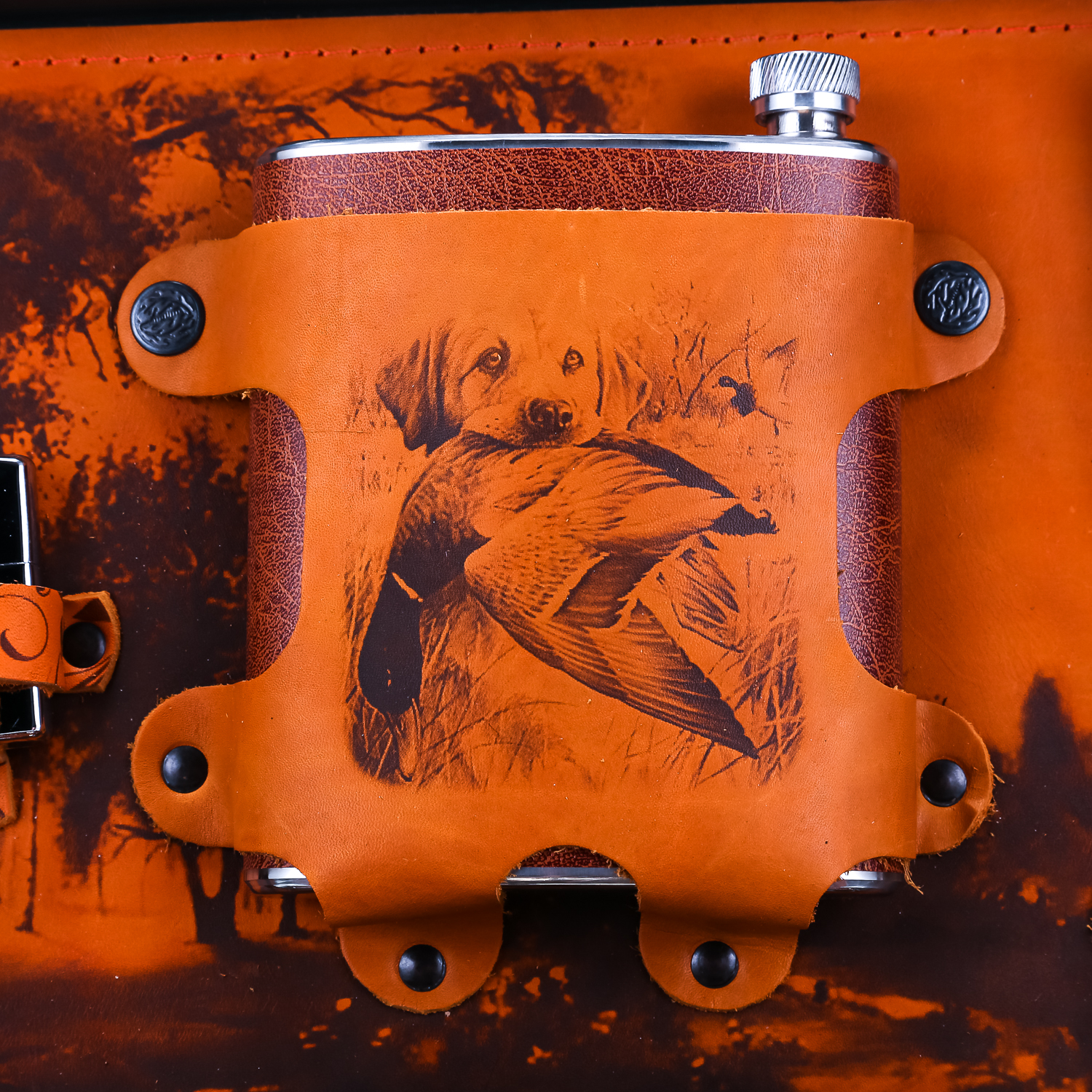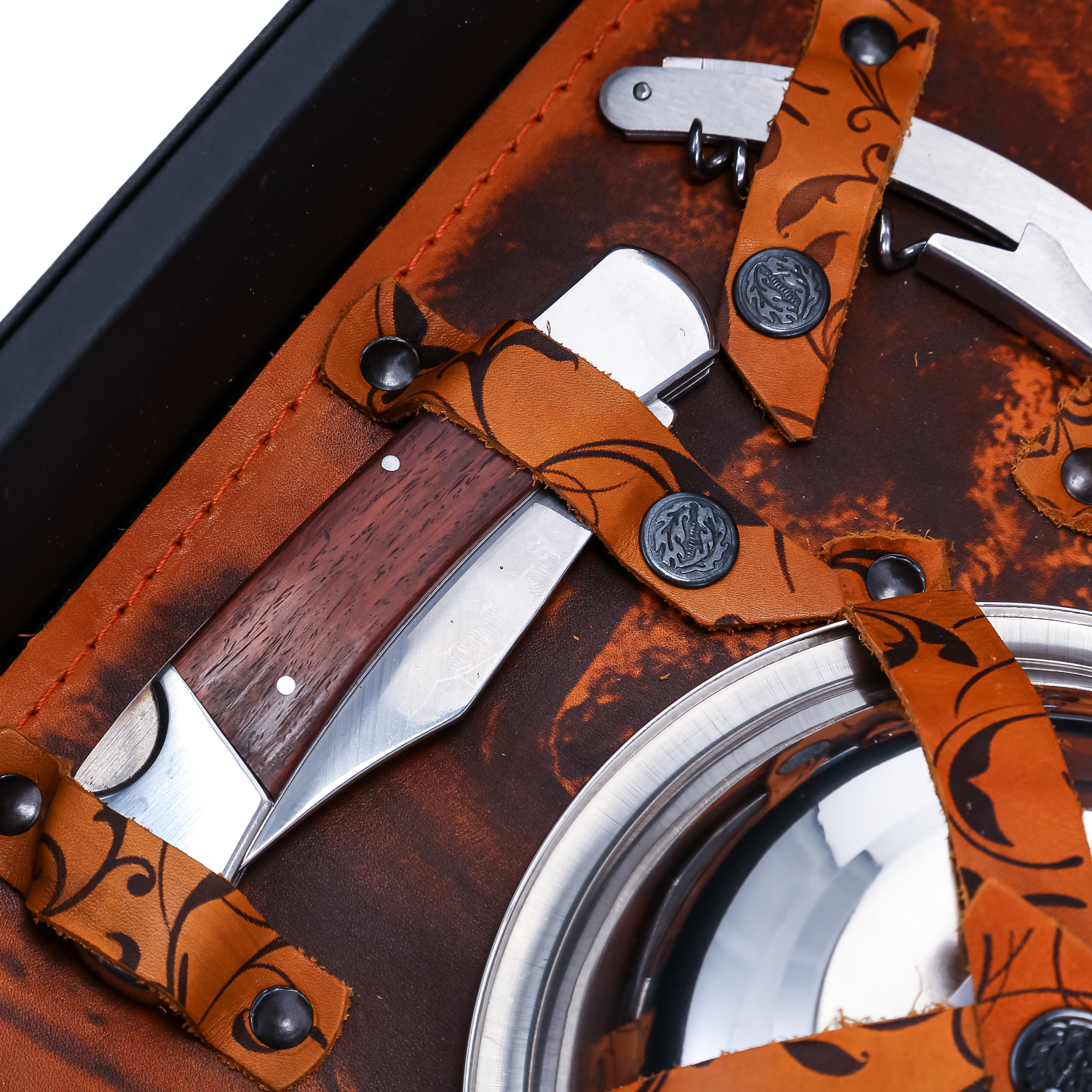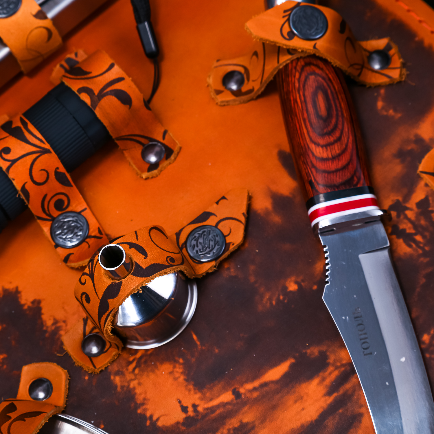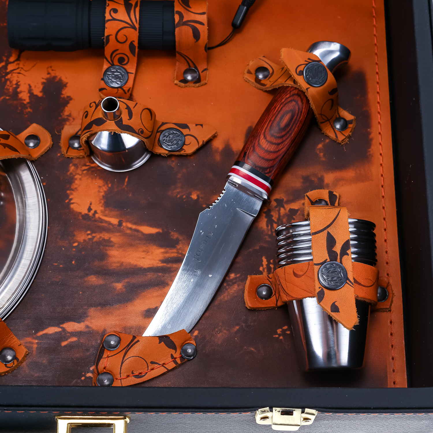 Комплектация: фляга, стопка 6 шт., вилка 6 шт., ложка 6 шт., нож 3 шт., зажигалка, мангал, фонарь, воронка, стакан 6 шт., тарелка 6 шт., штопор.