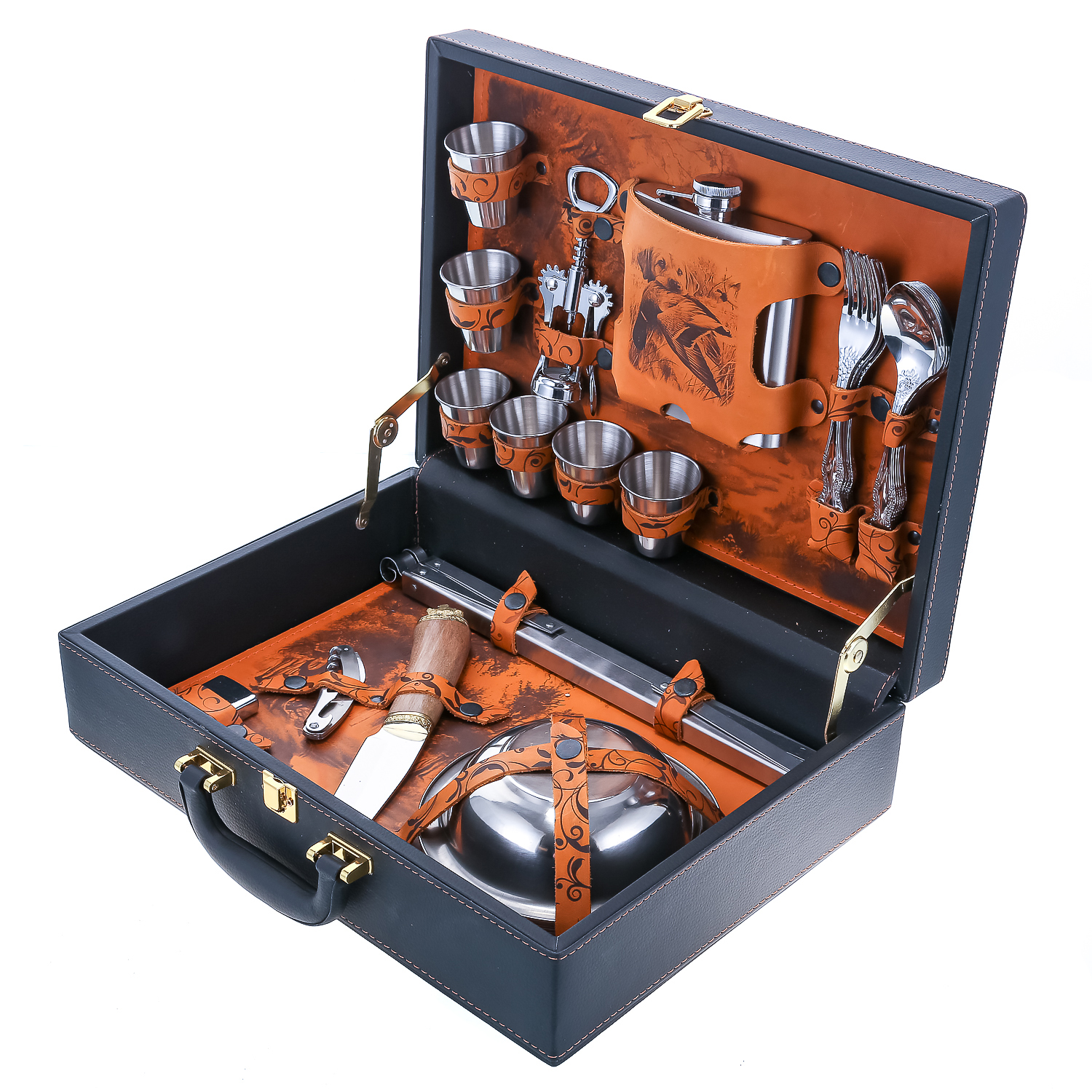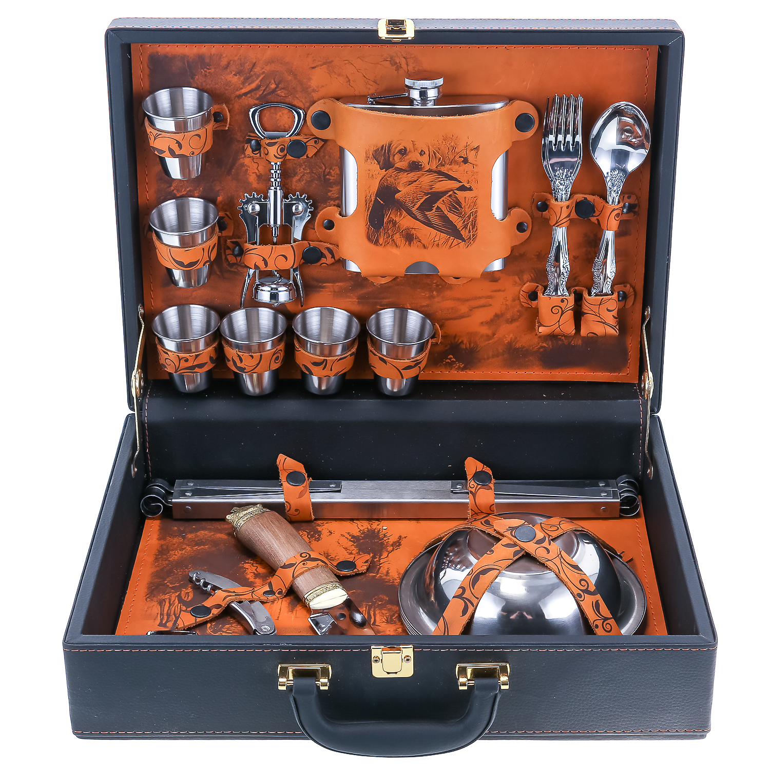 Набор для пикника на 6 персон "Автомобильный".Комплектация: фляга 1 шт., стакан 6 шт., штопор 2 шт., вилка 6 шт., ложка 6 шт., мангал 1 шт., тарелка 6 шт., нож 1 шт., зажигалка 1 шт.