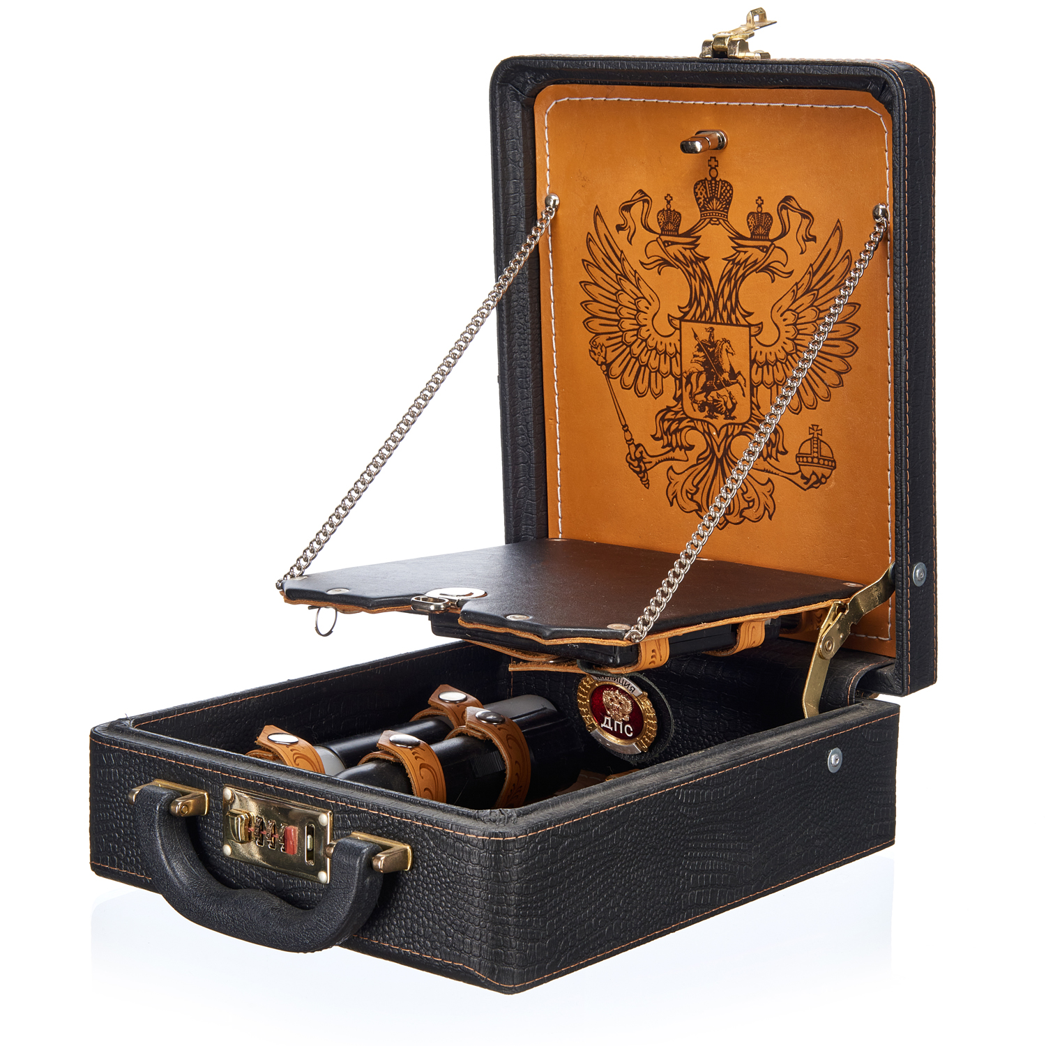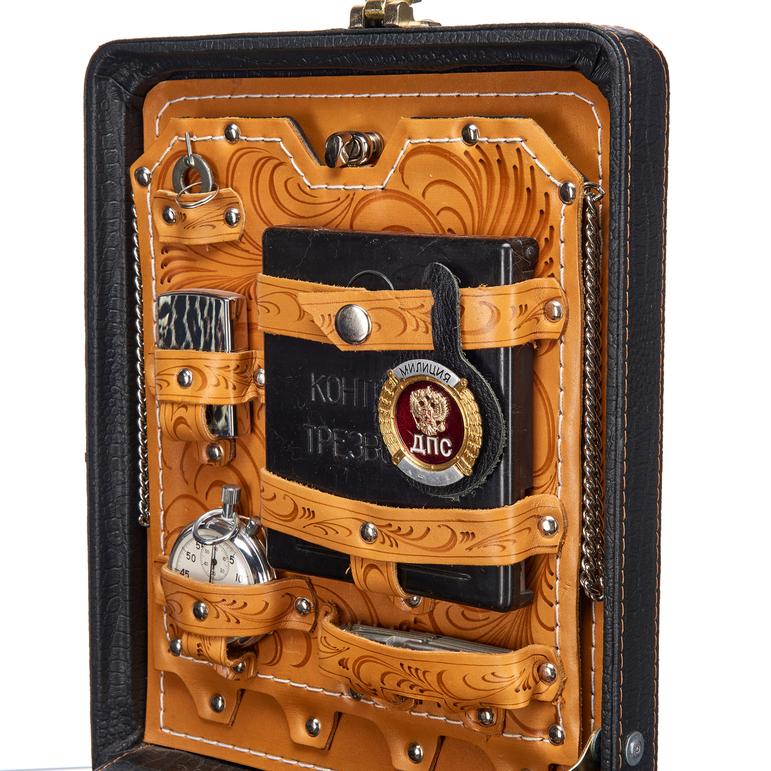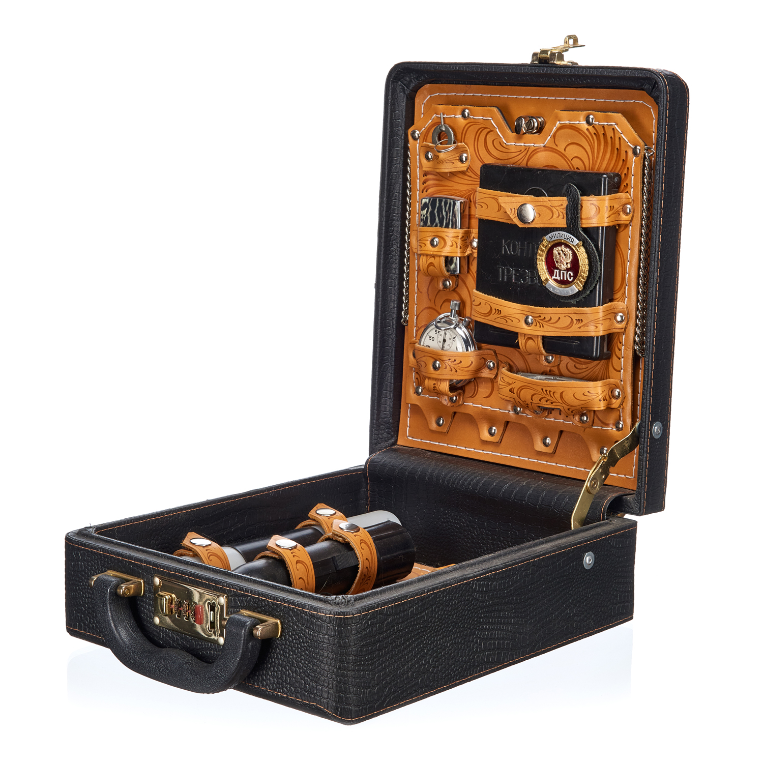 Подарочный набор «Спец-набор» – превосходный презент для настоящего мужчины к Дню защитника Отечества или профессиональным праздникам для сотрудников органов правопорядка. Он станет отличным спутником для сотрудников МВД, ДПС и тех, кто предпочитает эстетику власти. Набор упакован в стильный кейс из натуральной тиснёной кожи с позолоченной фурнитурой и кодовым замком. Внутри есть всё необходимое: подобие откидывающегося столика, наручники, часы и так далее.