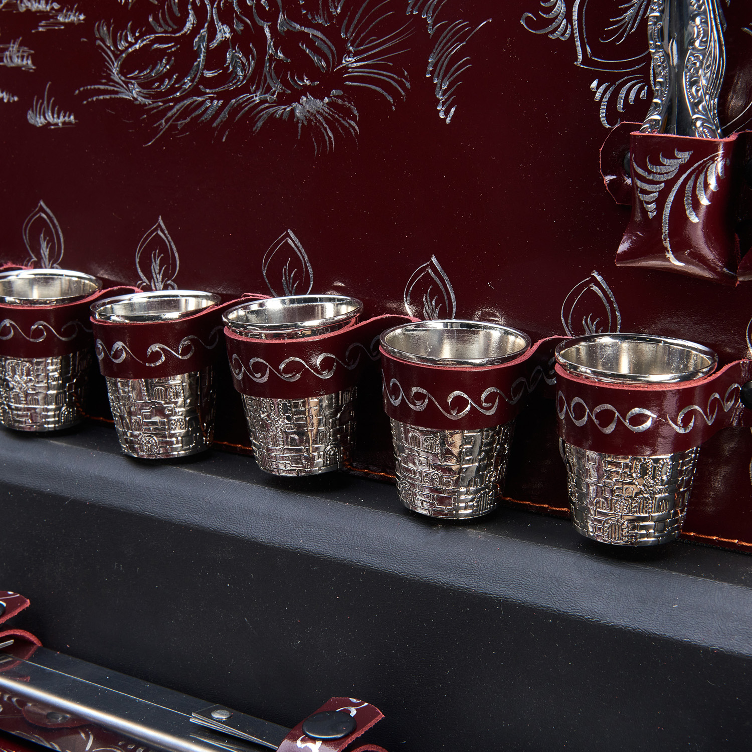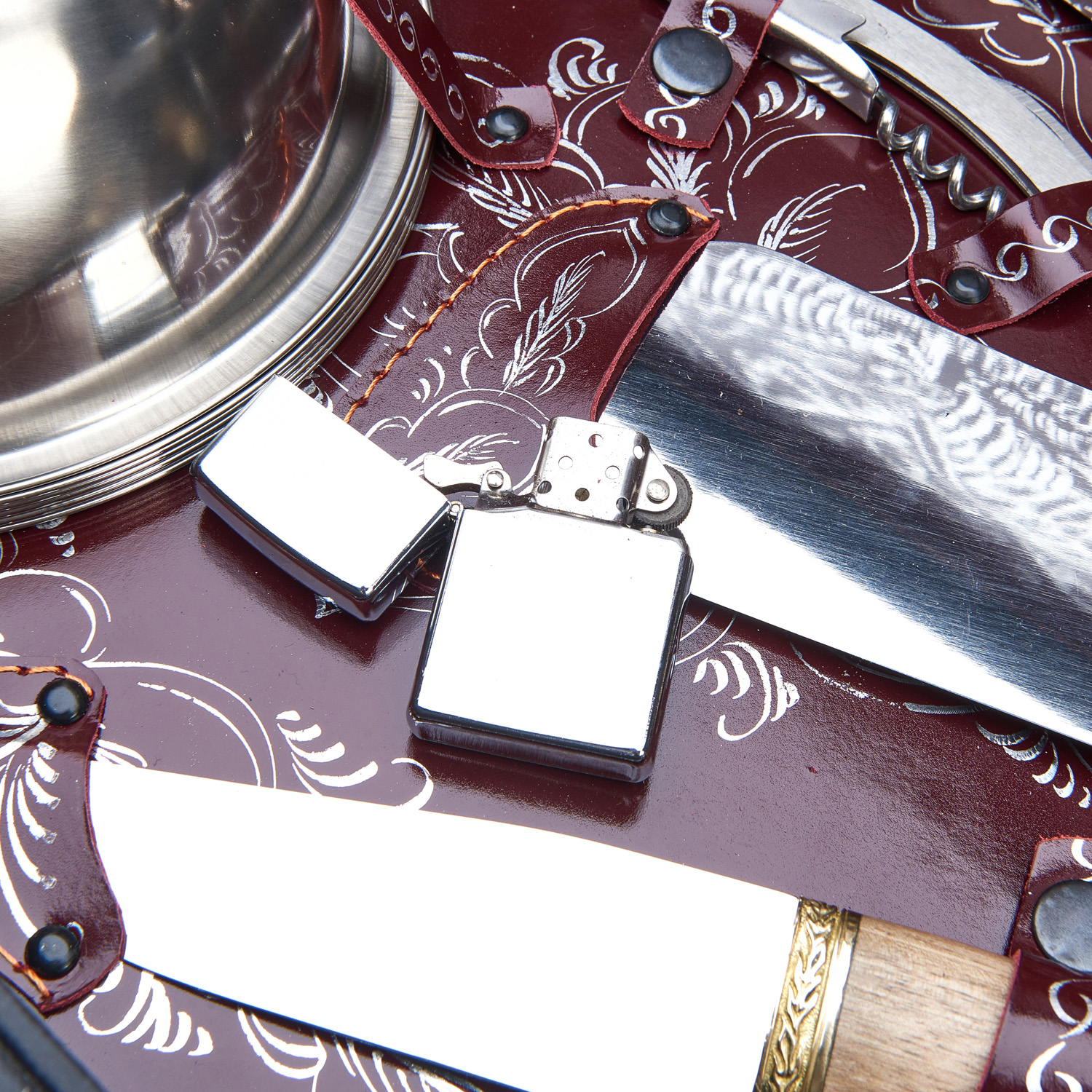 Набор для пикника в стильном дипломате, оббитом натуральной кожей, станет отличным подарком. Он выглядит действительно презентабельно. Набор включает всё необходимое для отдыха на природе: компактный мангал, шампура, два ножа, вилки, ложки, тарелки и стопки на 6 персон. Посуда выполнена из блестящей нержавеющей стали. Отдельного внимания заслуживают стопки, покрытые причудливыми узорами.
