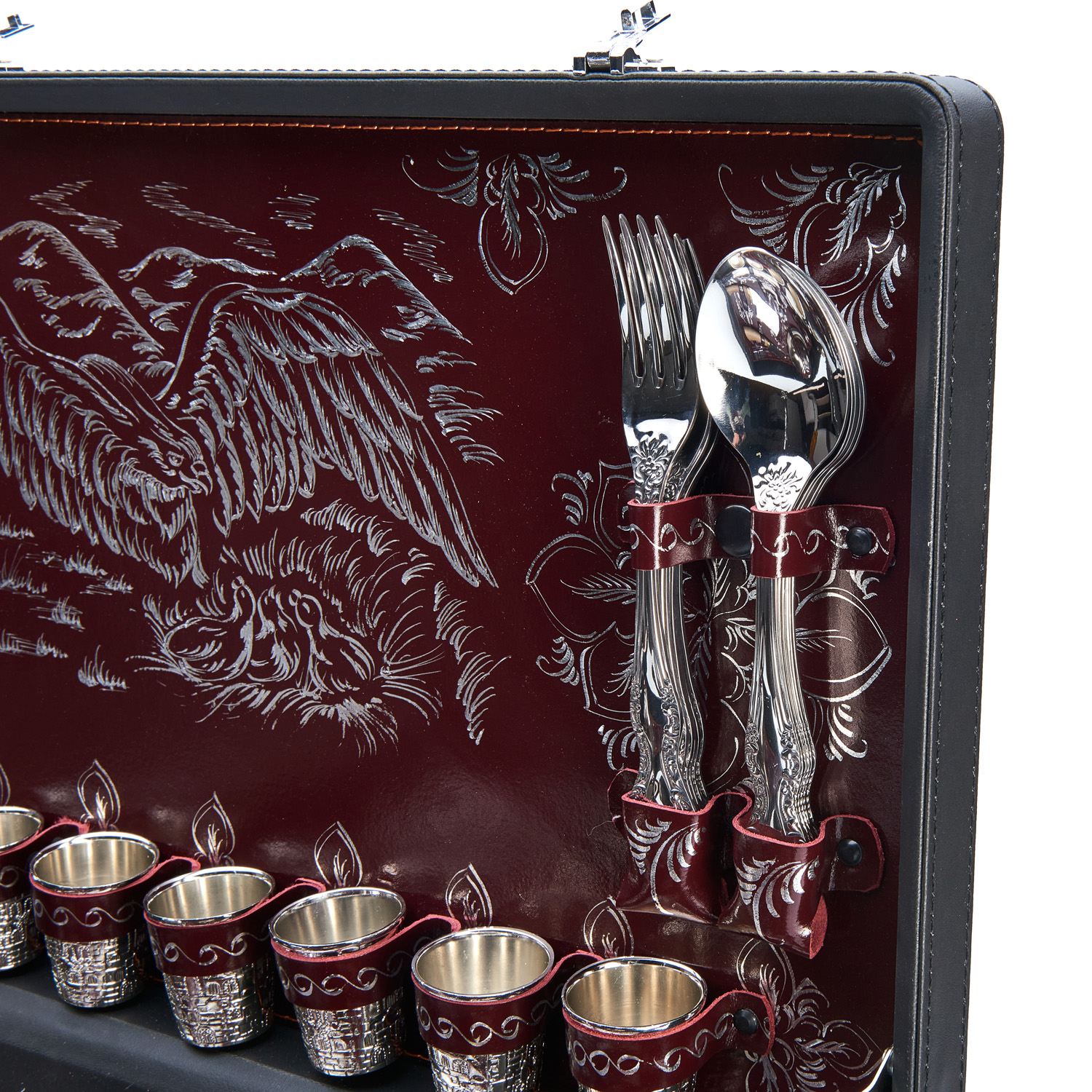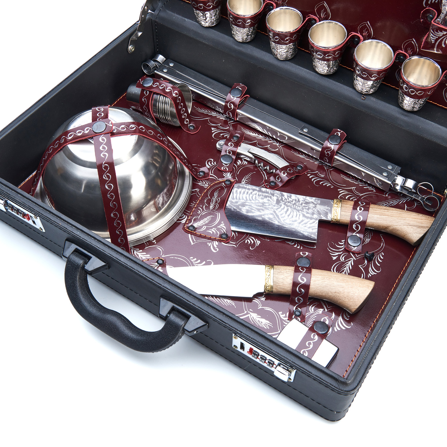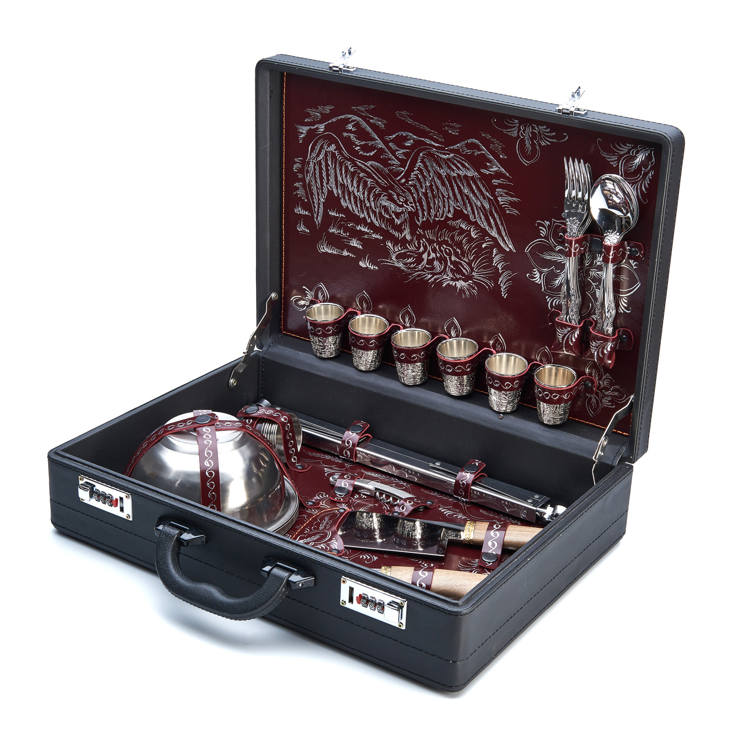 Посуда крепится кожаными петлями, поэтому у каждого предмета есть своё место. Дипломат закрывается на кодовый замок, и можно не переживать о сохранности содержимого.