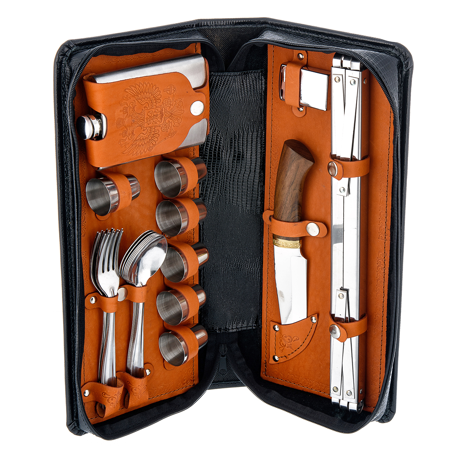 Комплектация: фляга 1 шт., стопка 6 шт., вилка 6 шт., ложка 6 шт., зажигалка 1 шт., нож 1 шт., мангал 1 шт., шампур 6 шт.