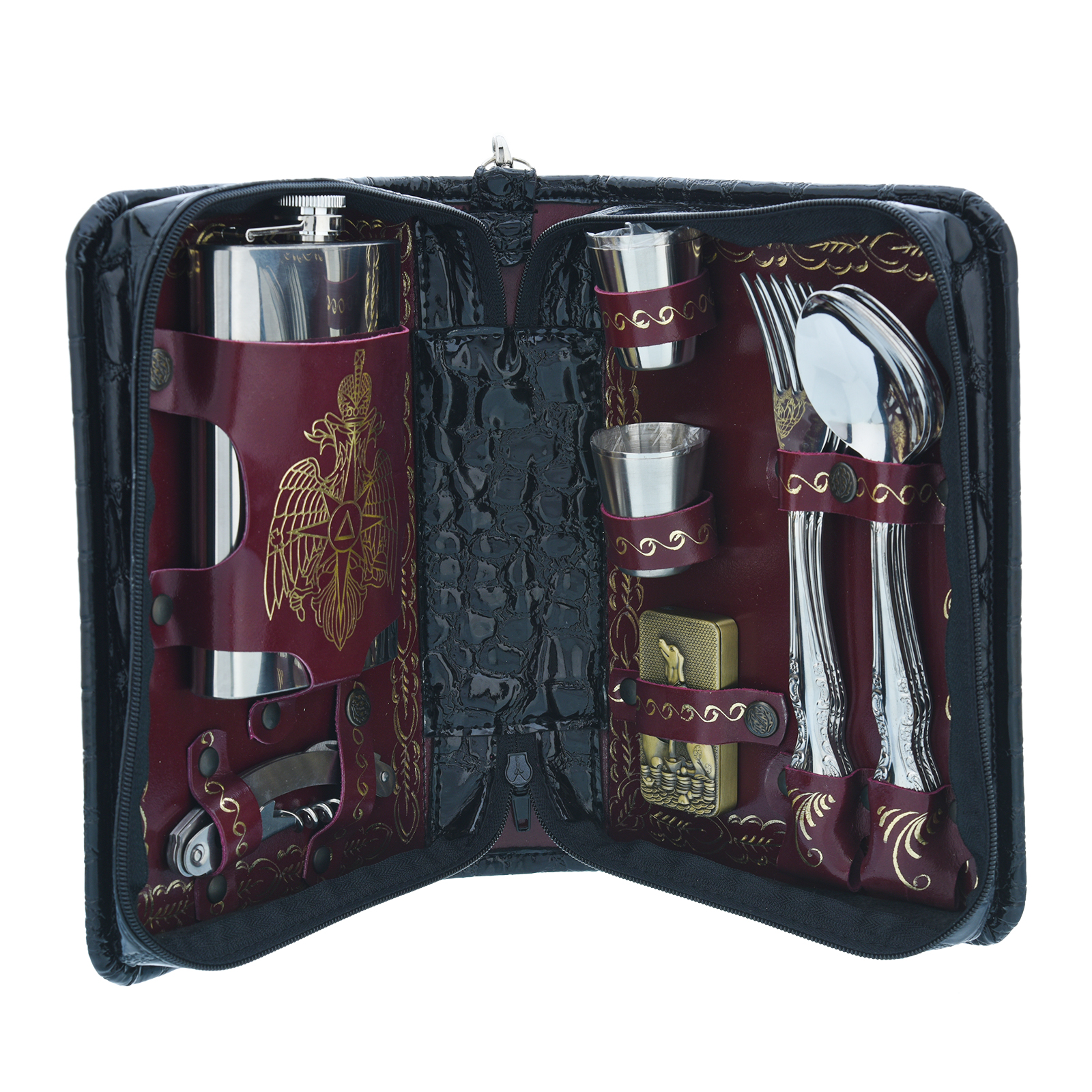 Комплектация: фляга 1 шт., штопор 1 шт., вилка 4 шт., ложка 4 шт., стопка 4 шт., зажигалка 1 шт.