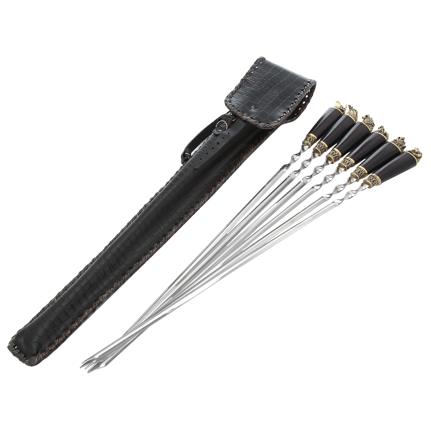 Шашлычный набор в кожаном чехле "Животные".Материалы: нержавеющая сталь, дерево венге, латунь, кожа.