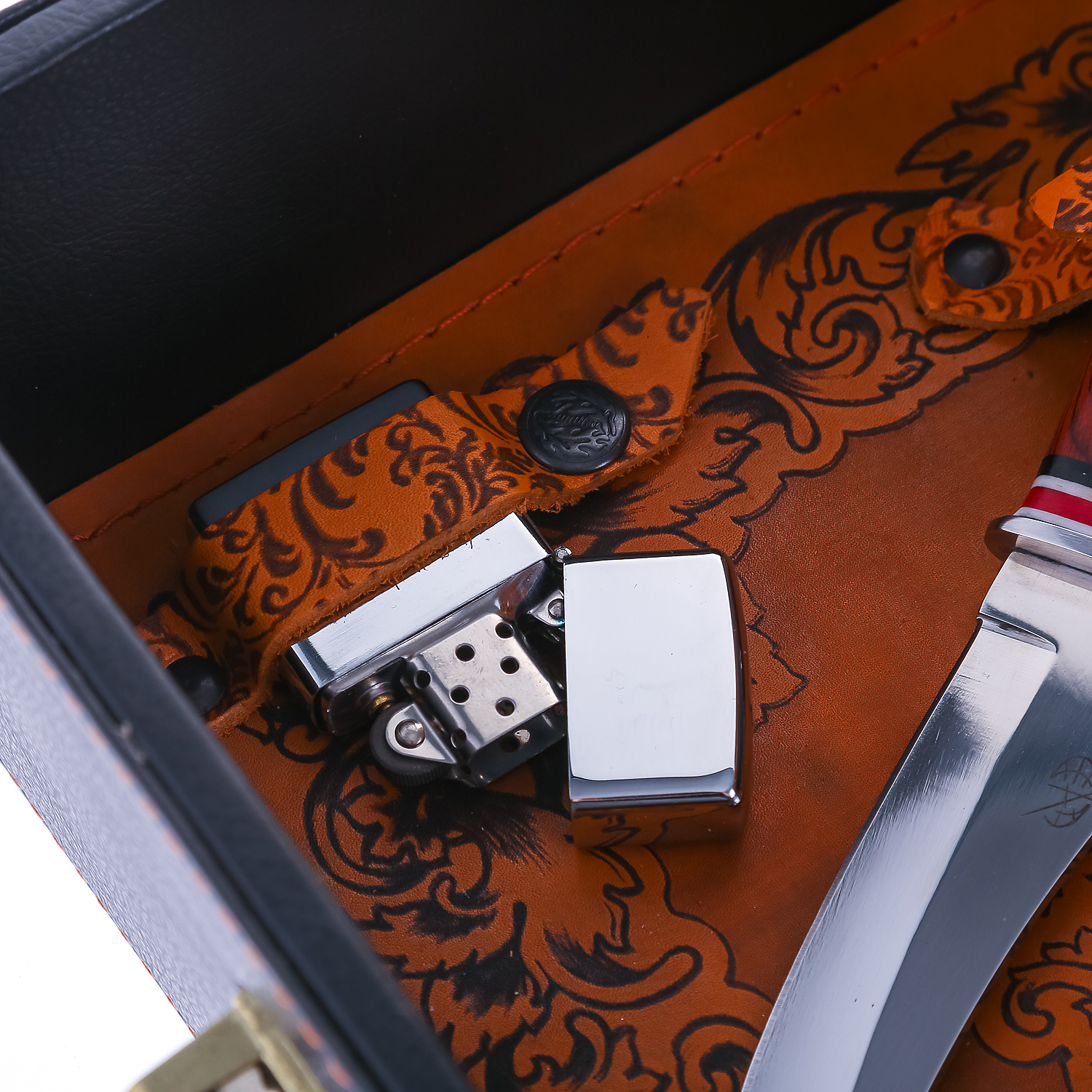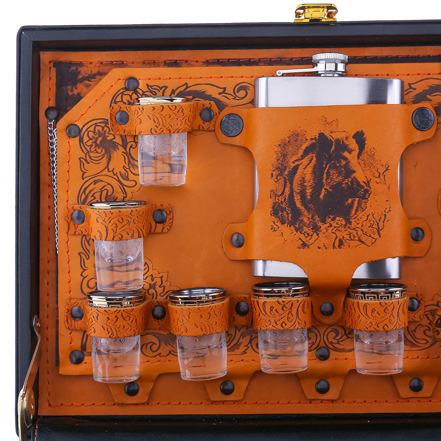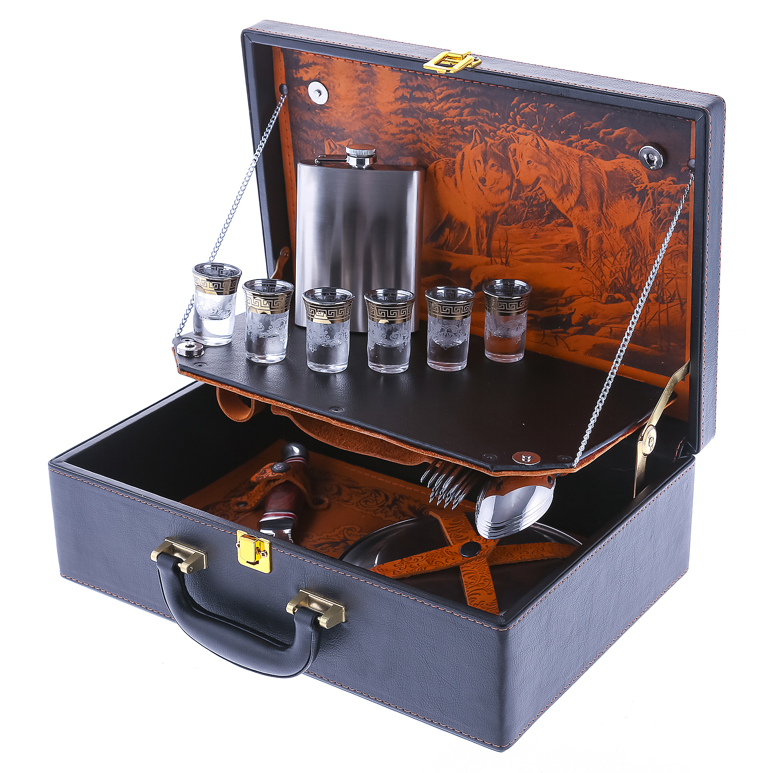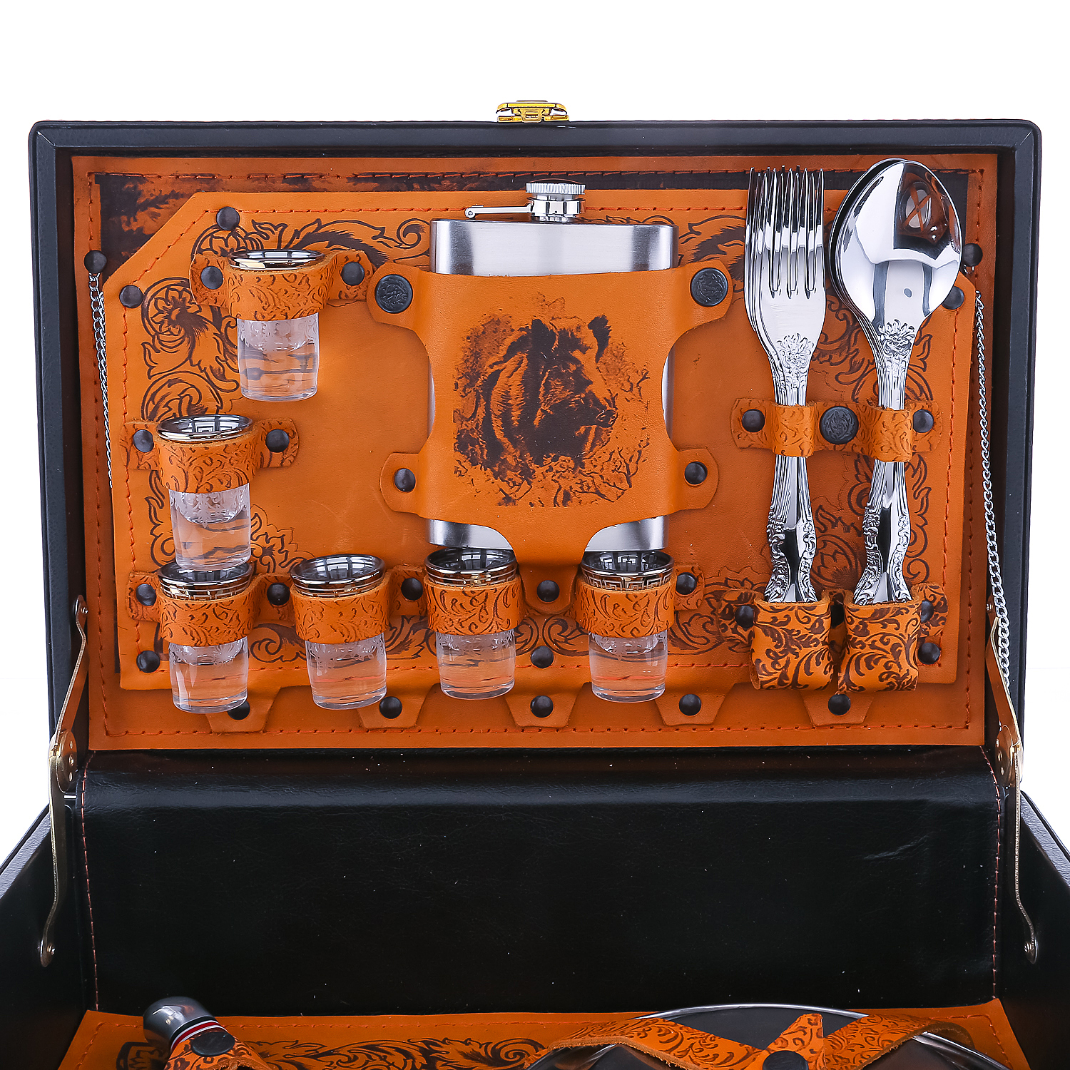 Комплектация: фляга, стопка 6 шт., вилка 6 шт., ложка 6 шт., тарелка 6 шт., зажигалка, нож.
