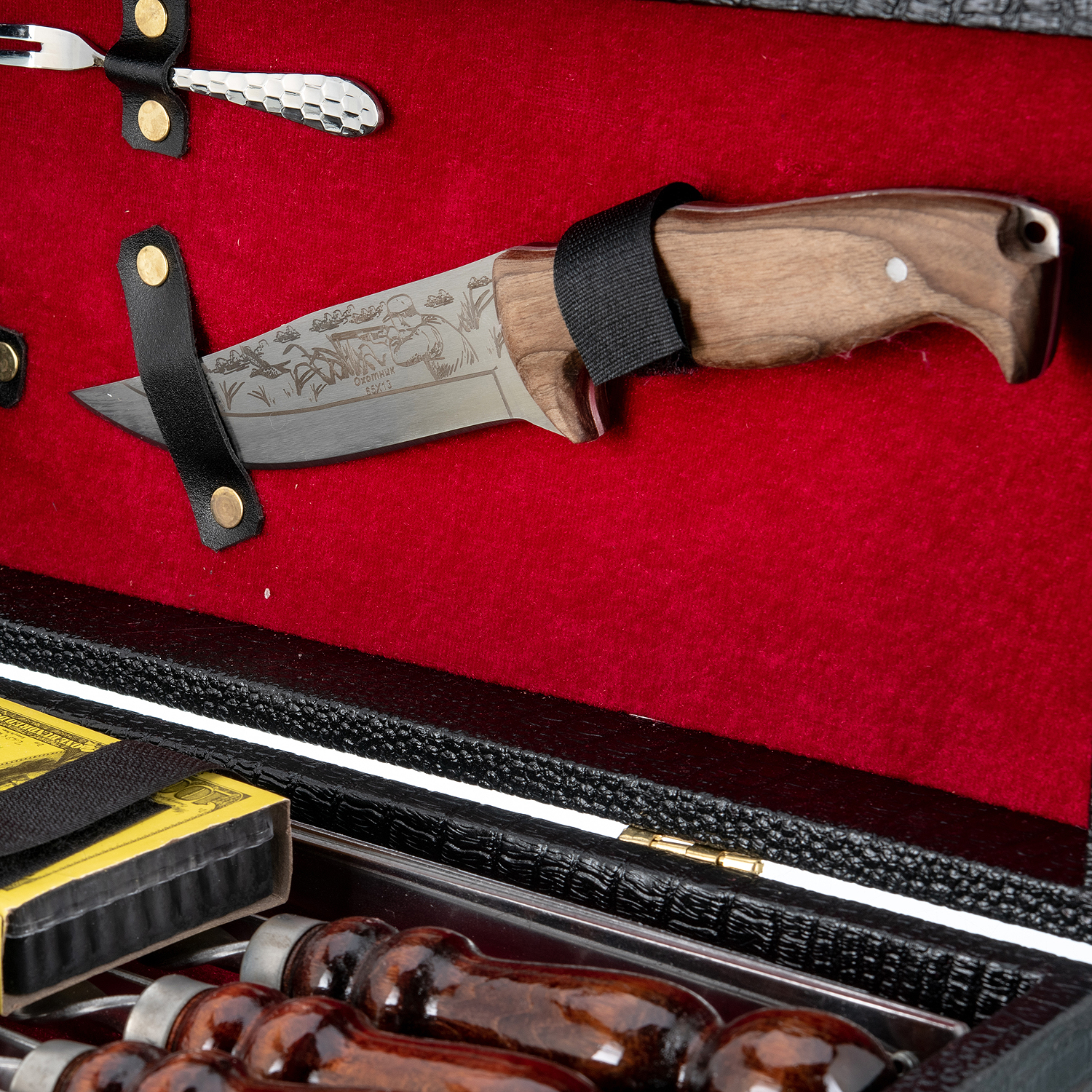 Шашлычный набор для пикника в кожаном футляре.Материалы: нержавеющая сталь, дерево, кожа.