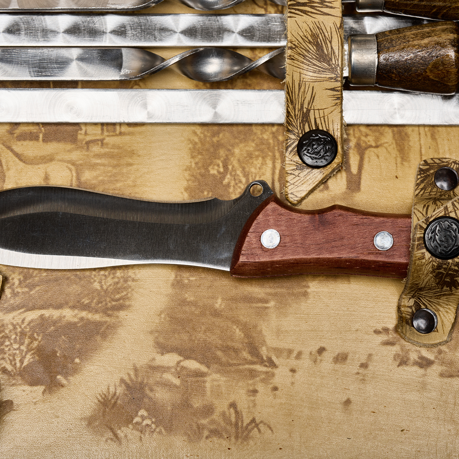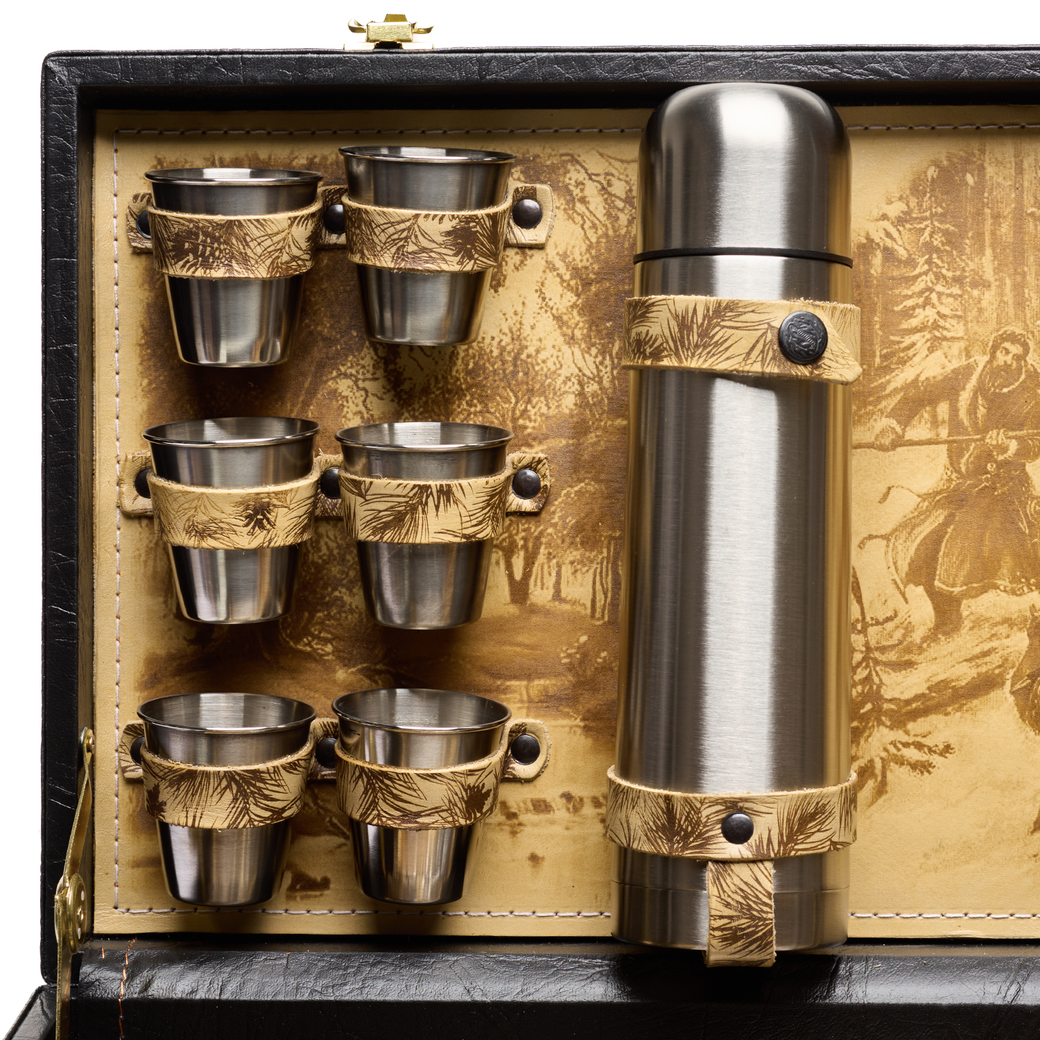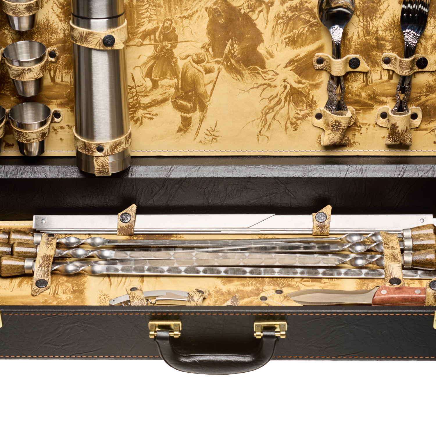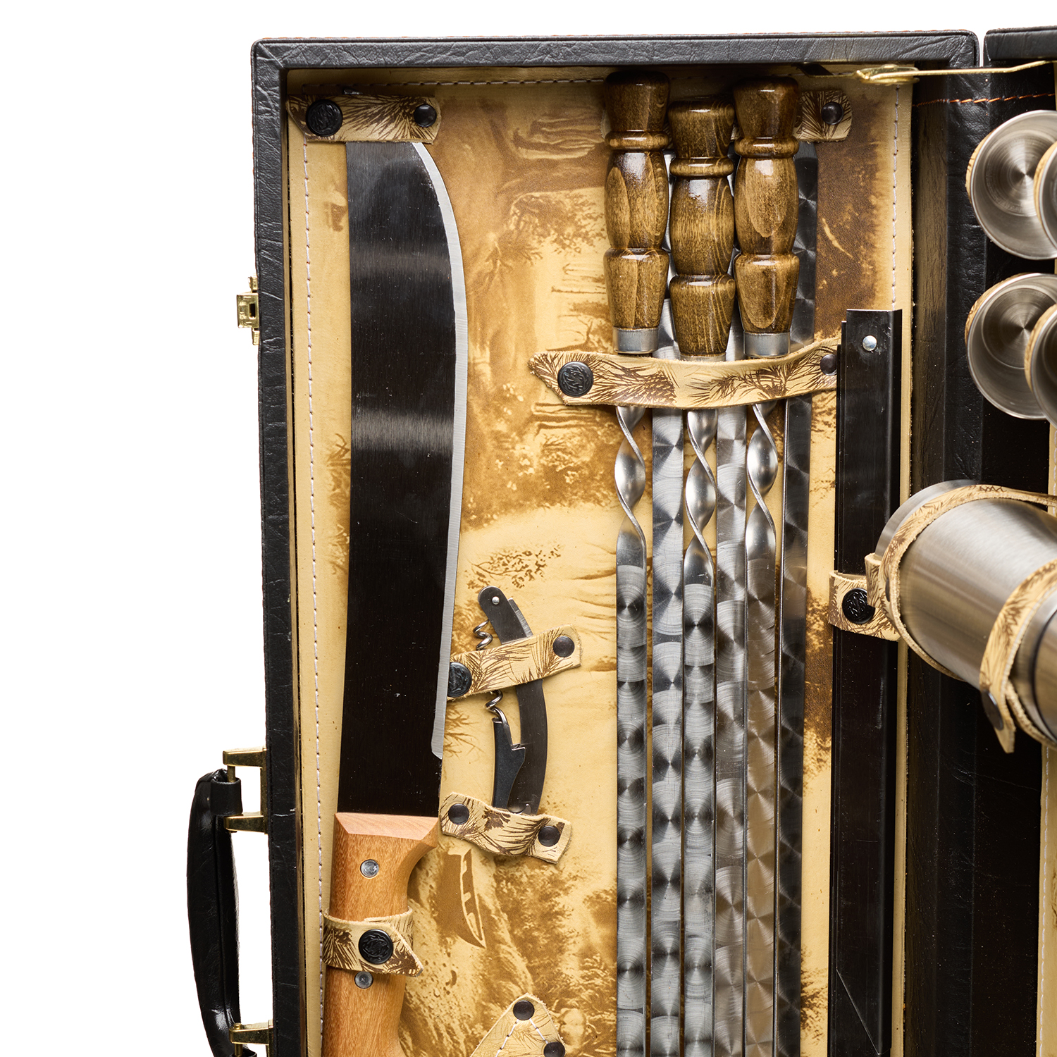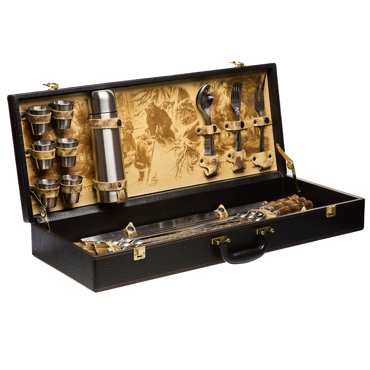 Комплектация: термос 1 шт., стопка 6 шт., вилка 6 шт., ложка 6 шт., вилка для мяса 1 шт., мангал 1 шт., шампур 6 шт., нож 1 шт., тесак 1 шт., штопор 1 шт.
