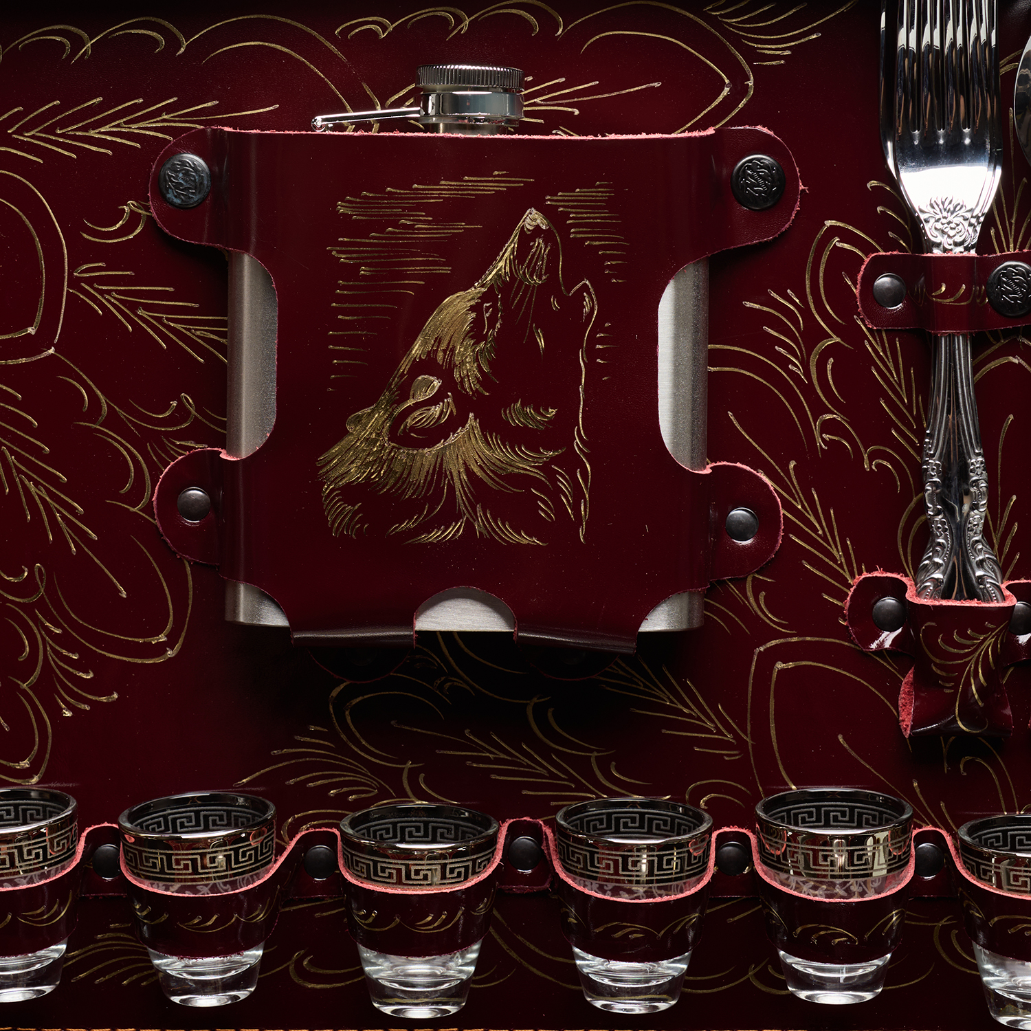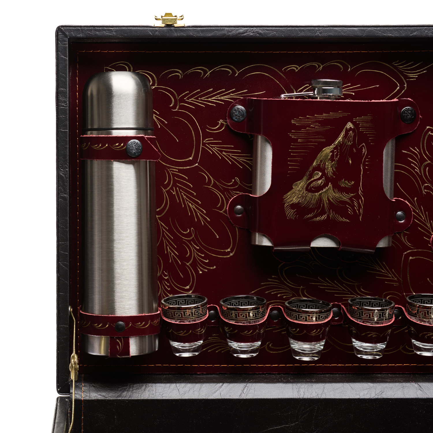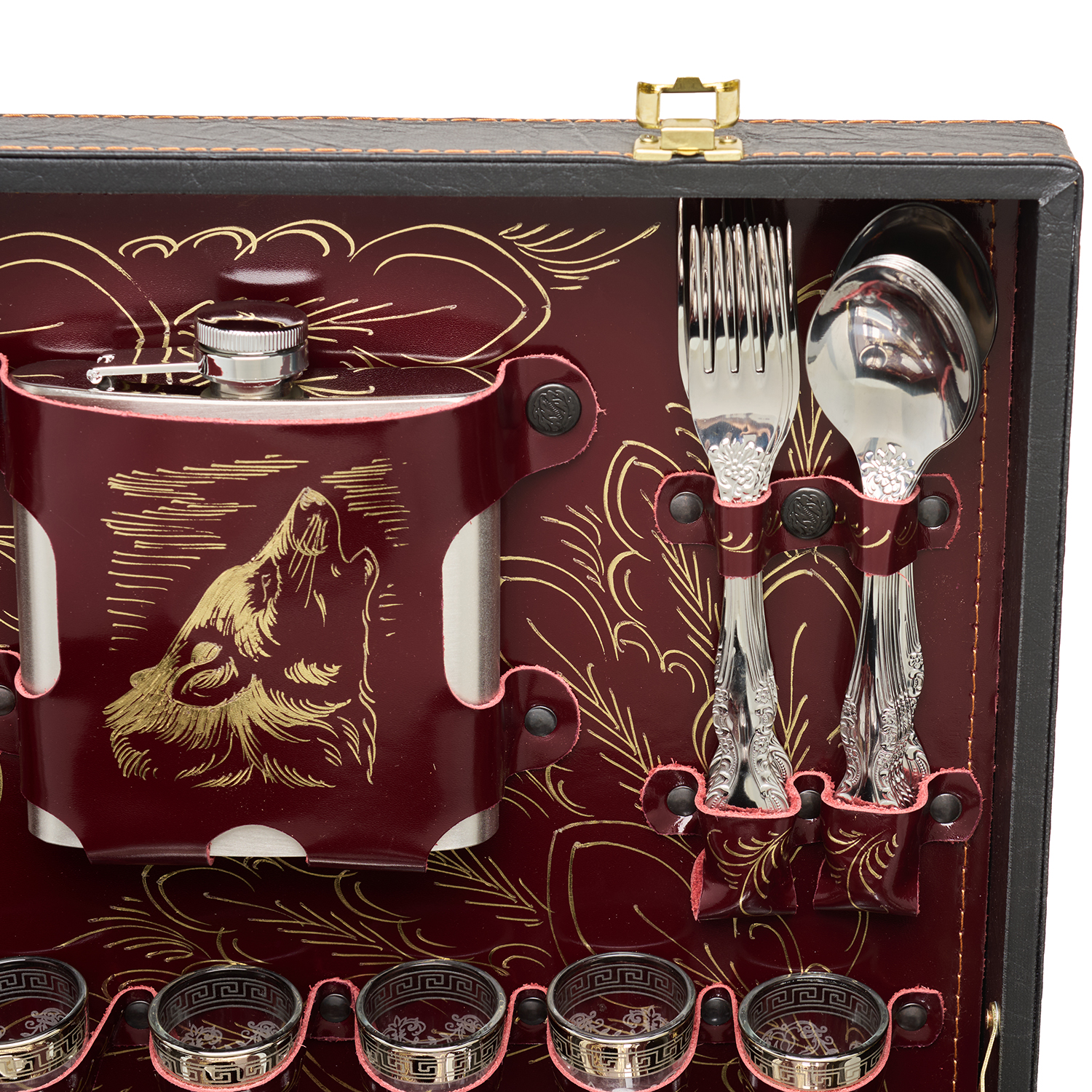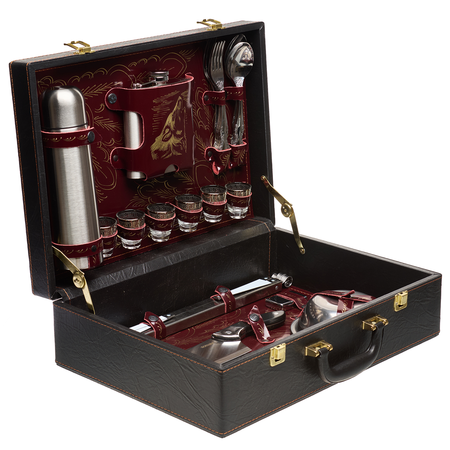 Набор для пикника на 6 персон "Подарочный".Комплектация: термос 1 шт., фляга 1 шт., вилка 6 шт., ложка 6 шт., стопка 6 шт., мангал 1 шт., шампур 6 шт., тесак 1 шт., нож 1 шт., миска 6 шт., зажигалка 1 шт.