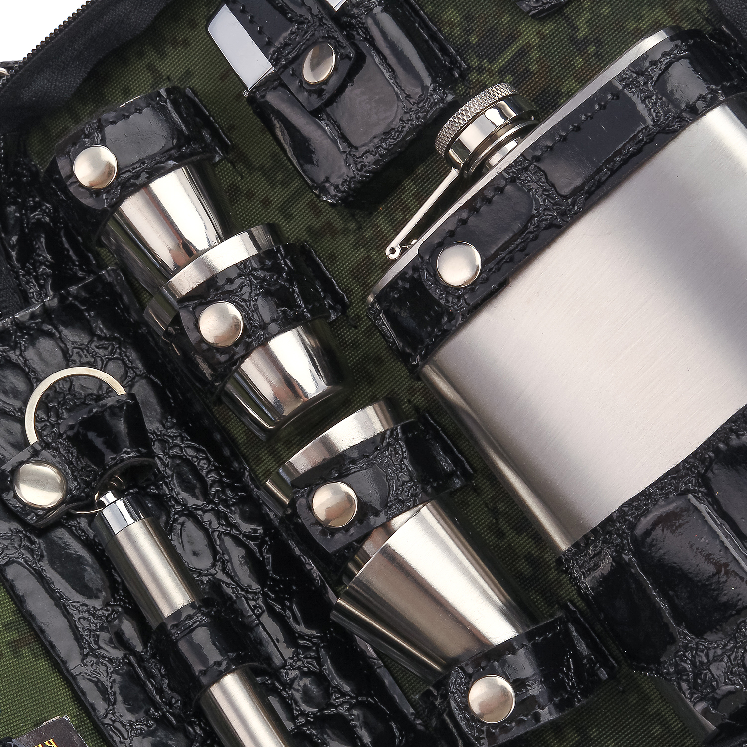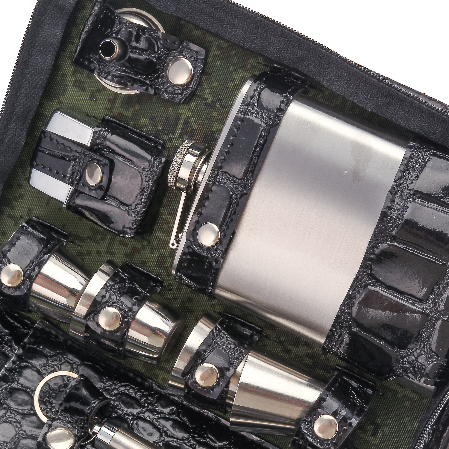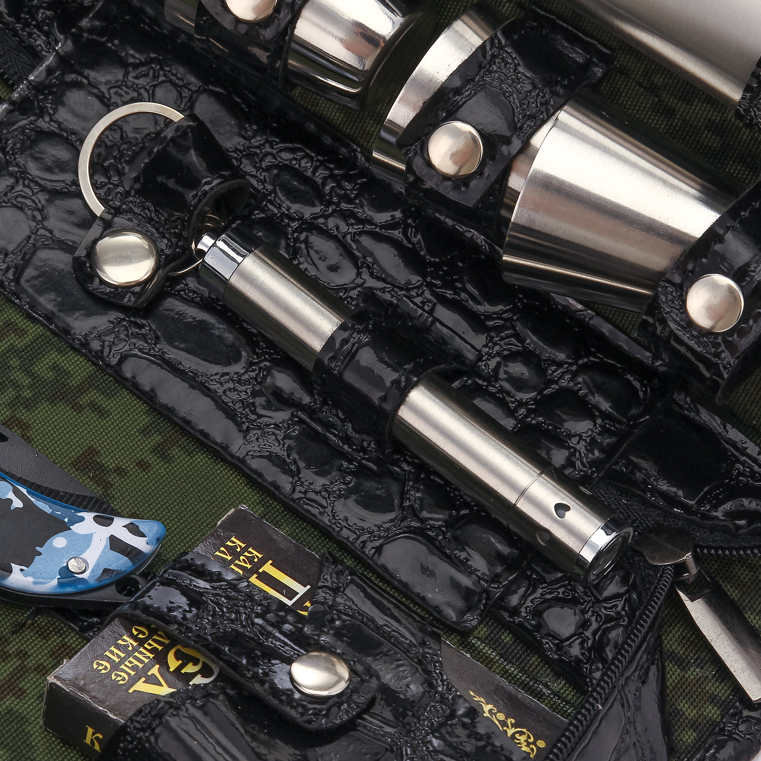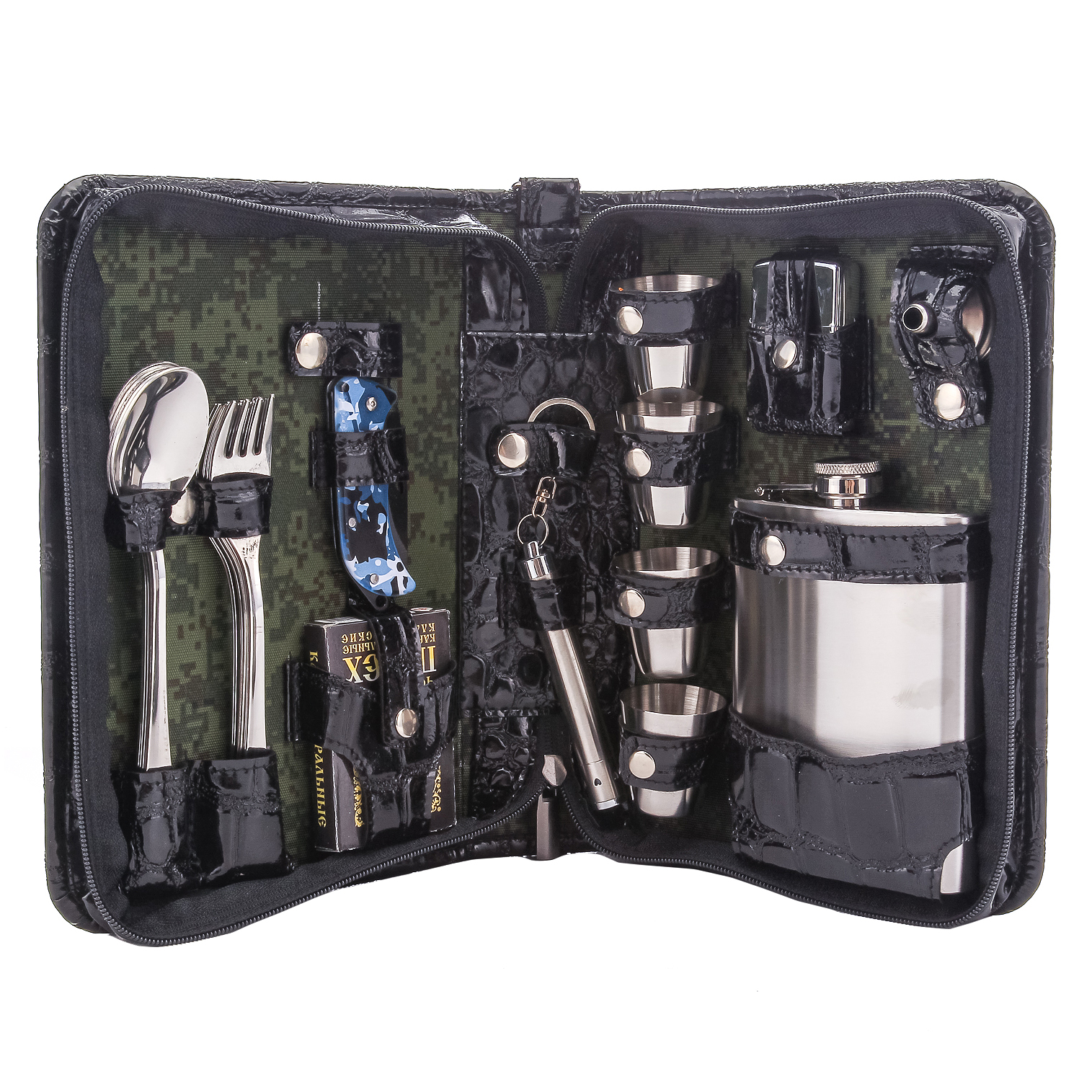 Комплектация: фляга 1 шт., складной нож 1 шт., воронка 1 шт., стопка 4 шт., ложка 4 шт., вилка 4 шт., фонарик 1 шт., зажигалка 1 шт.
