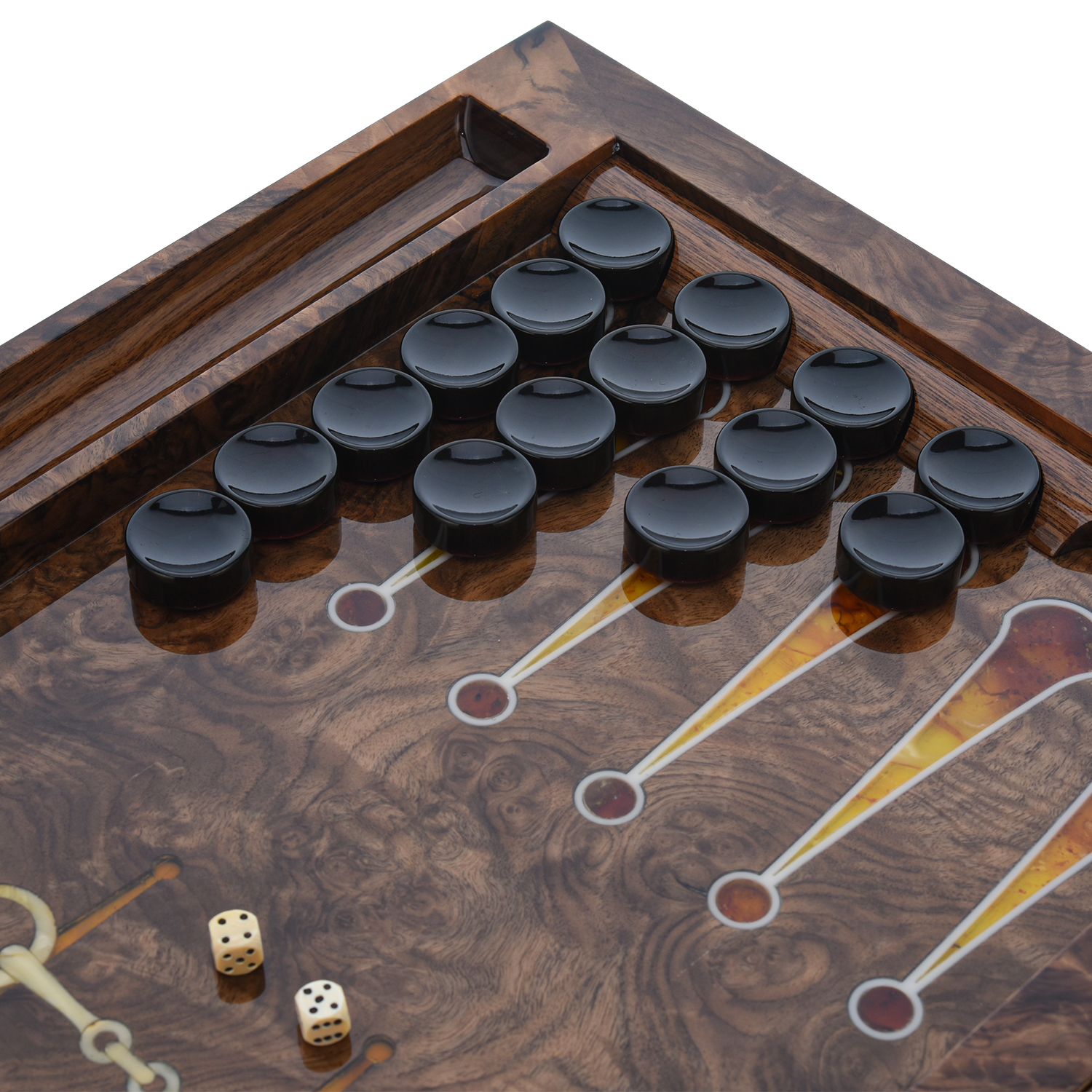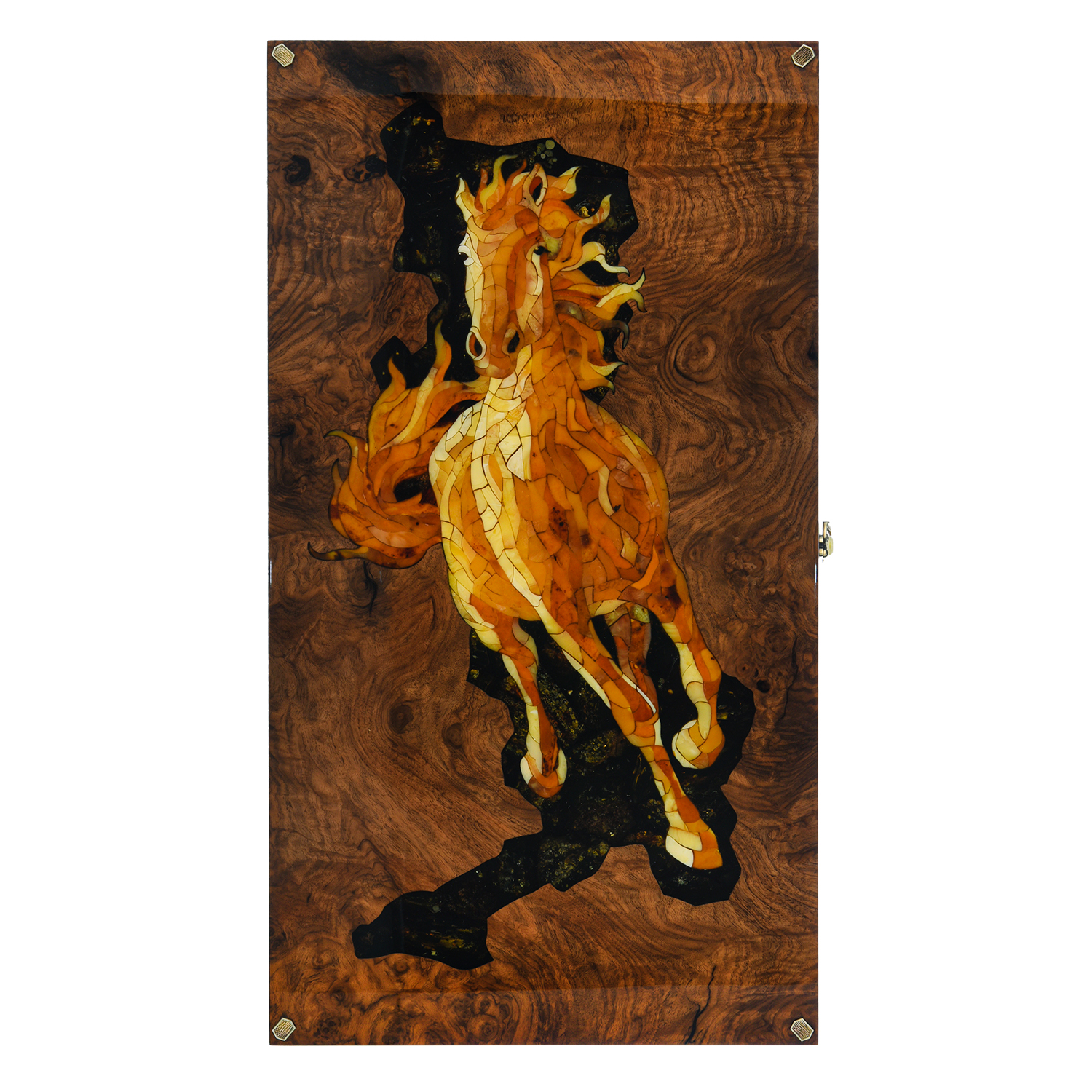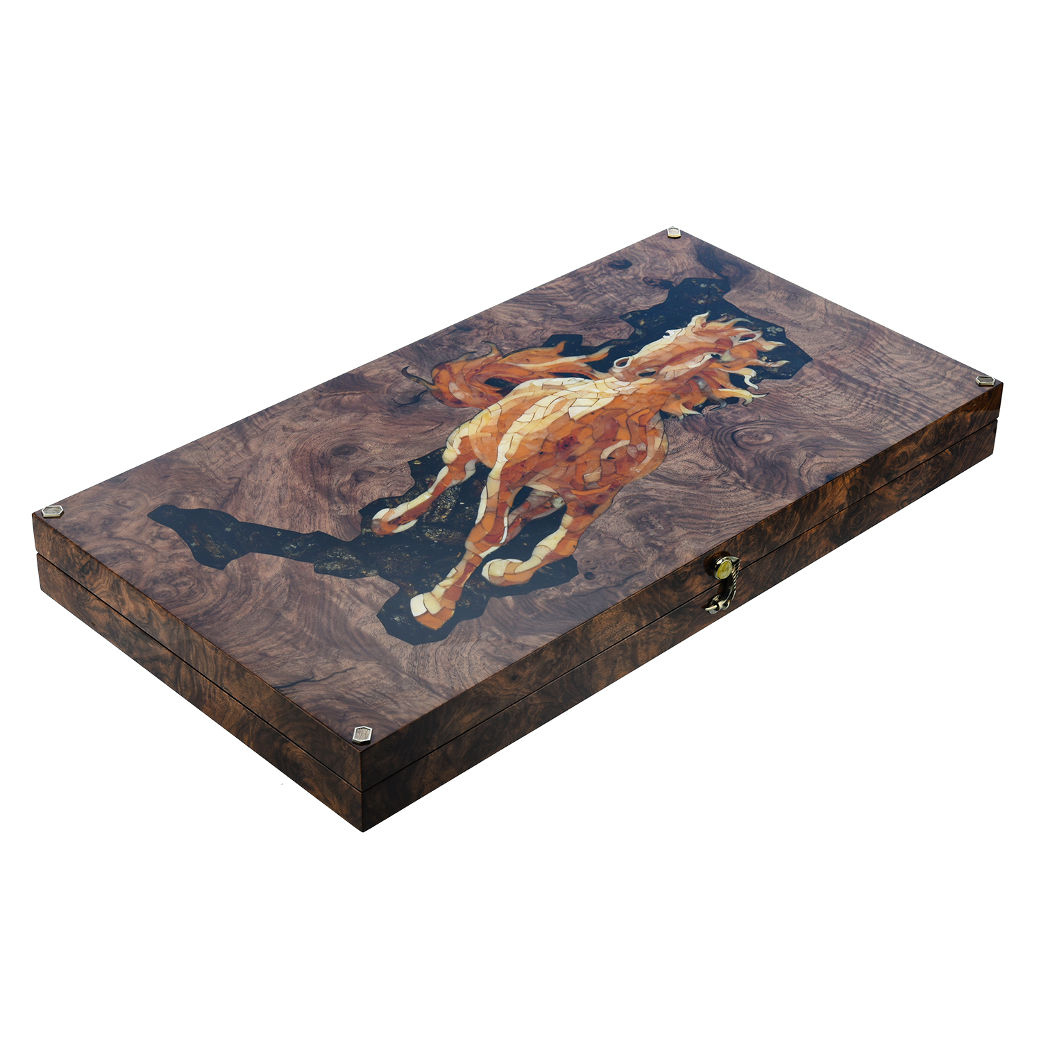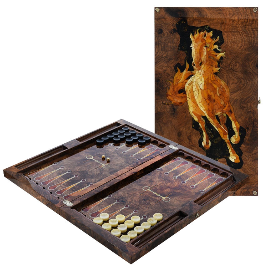 Нарды из мореного дуба с инкрустацией и фишками из янтаря "Конь"