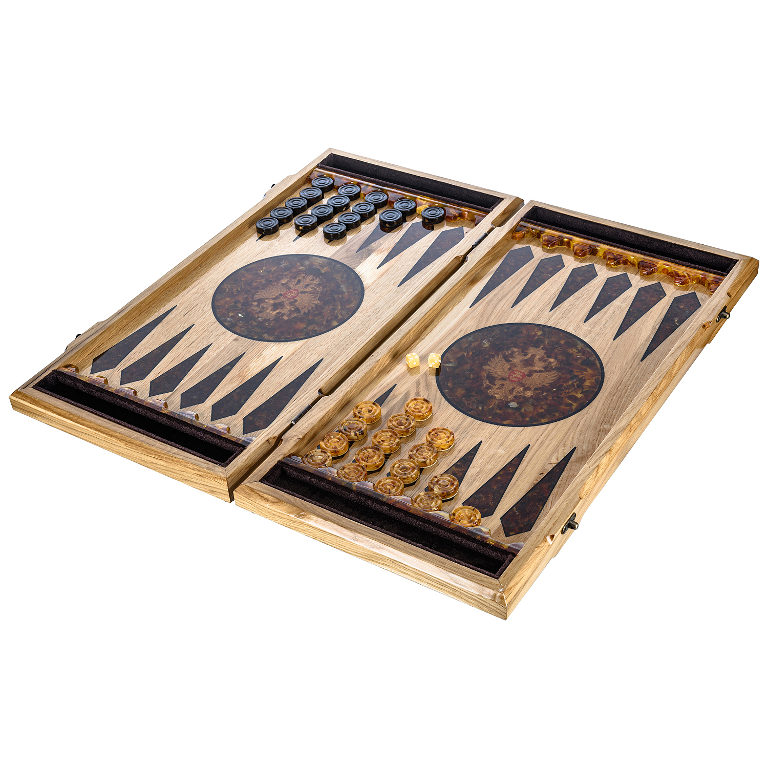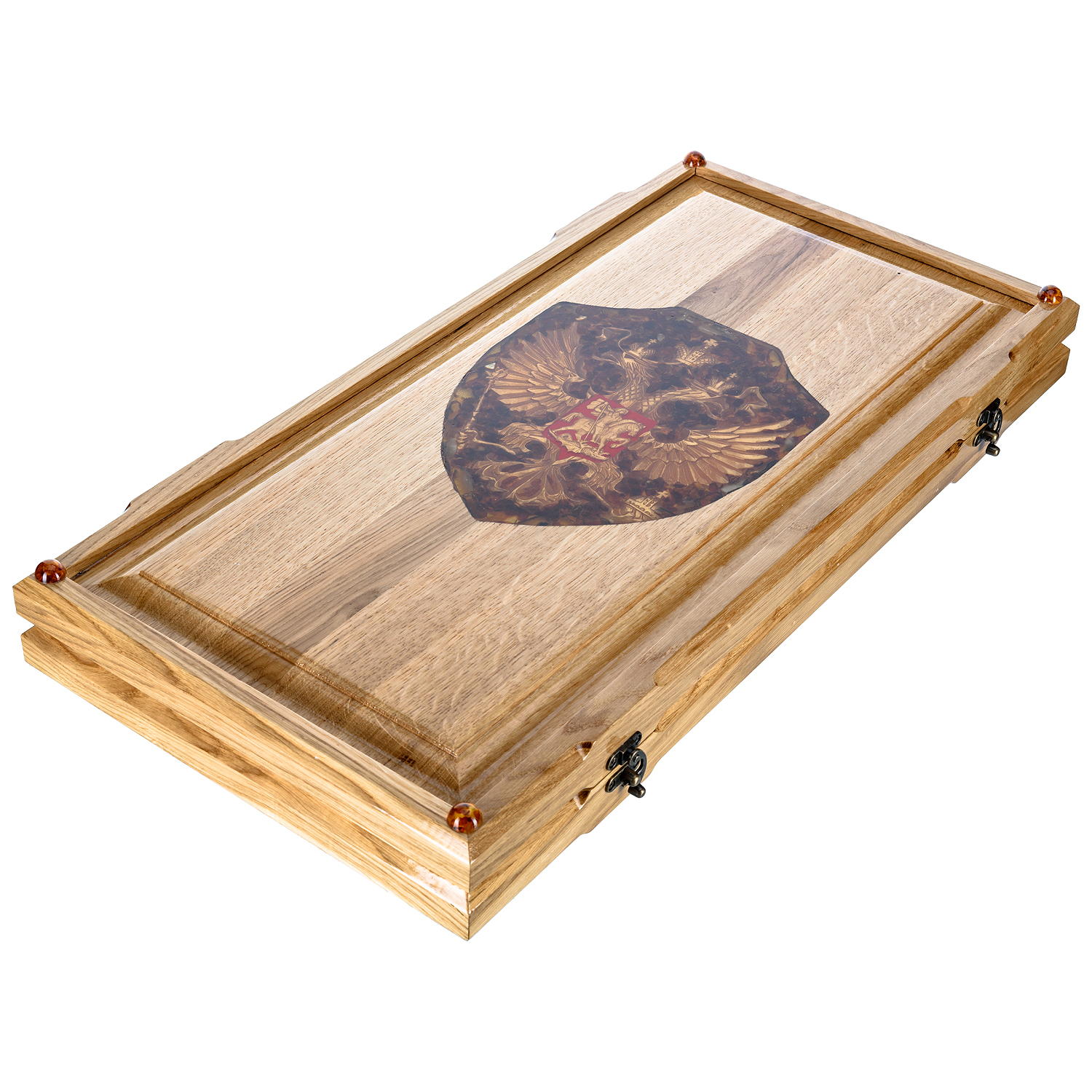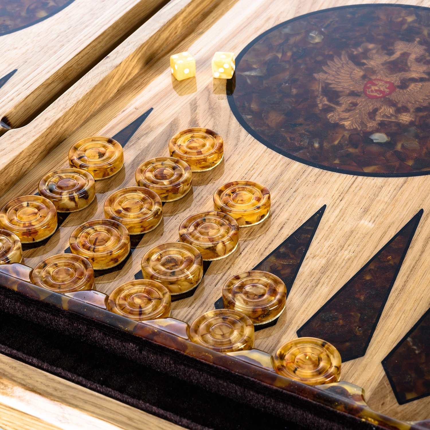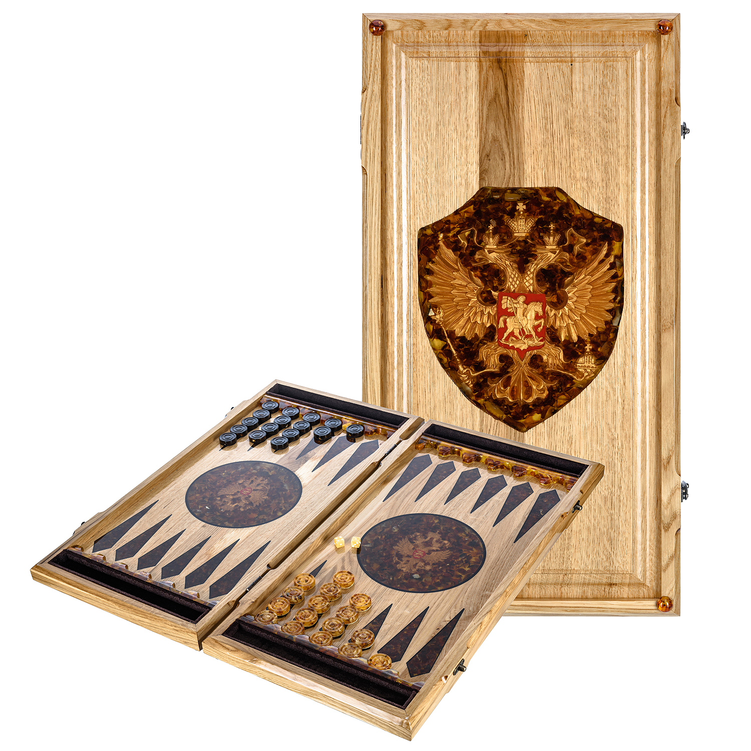 Нарды янтарные "Герб РФ".Материалы: янтарь, дуб, ясень.