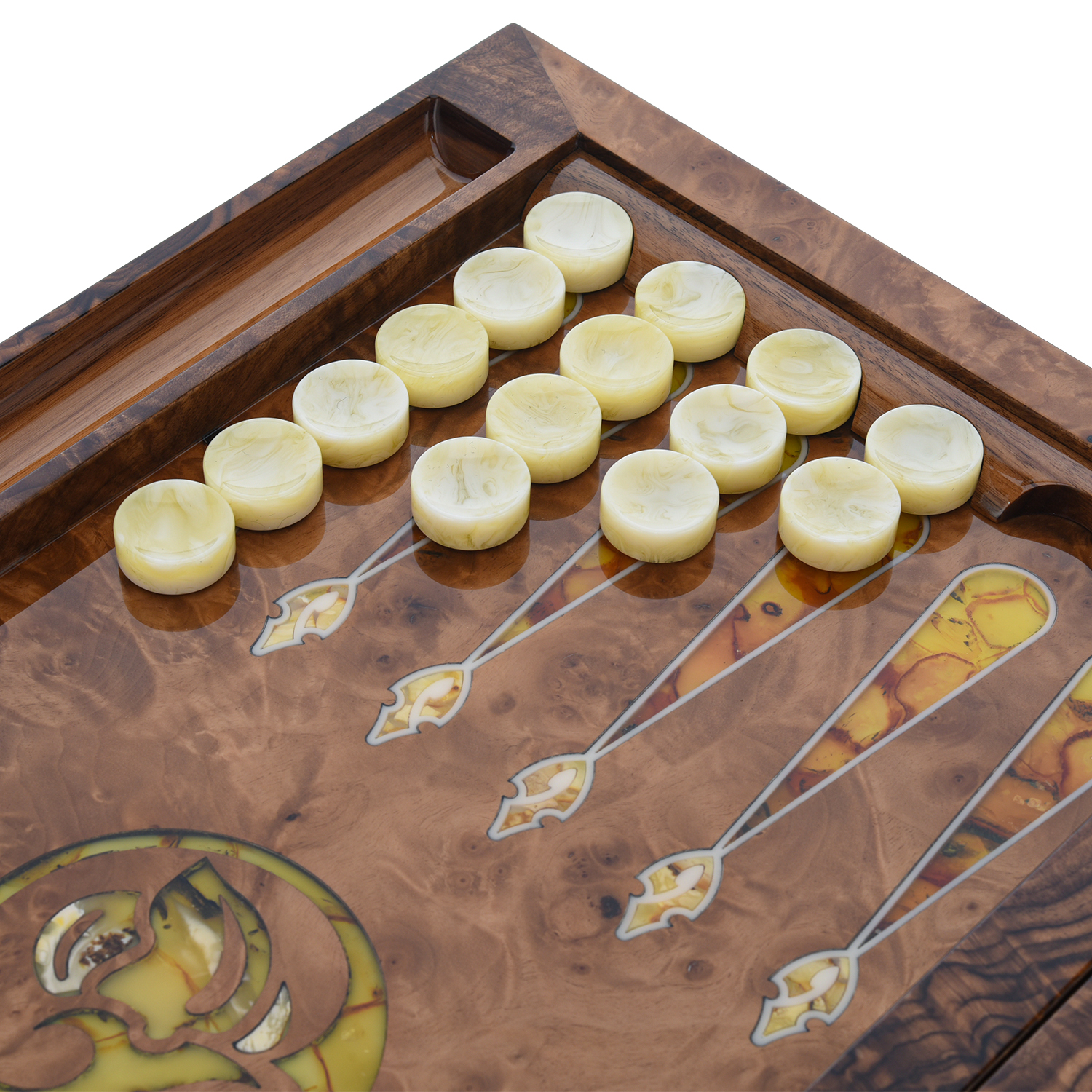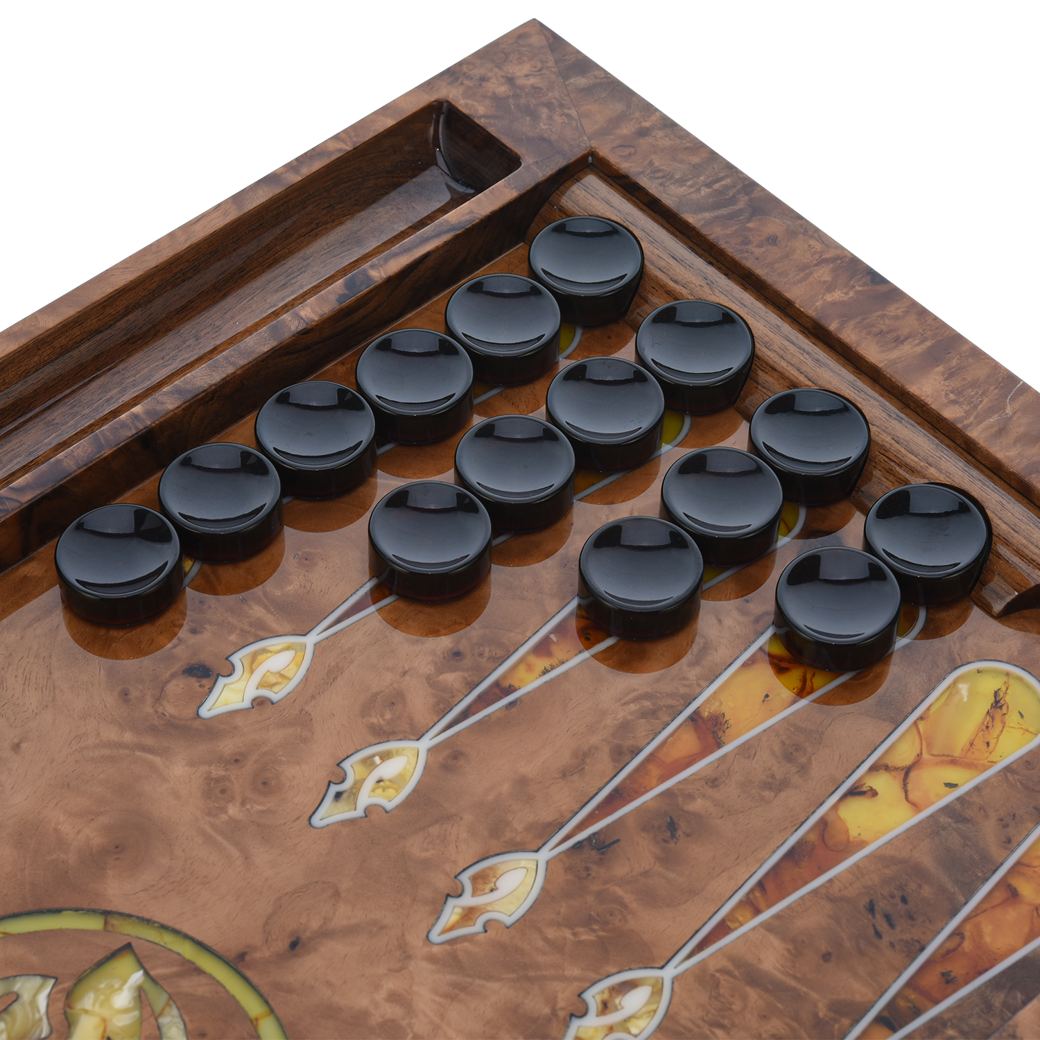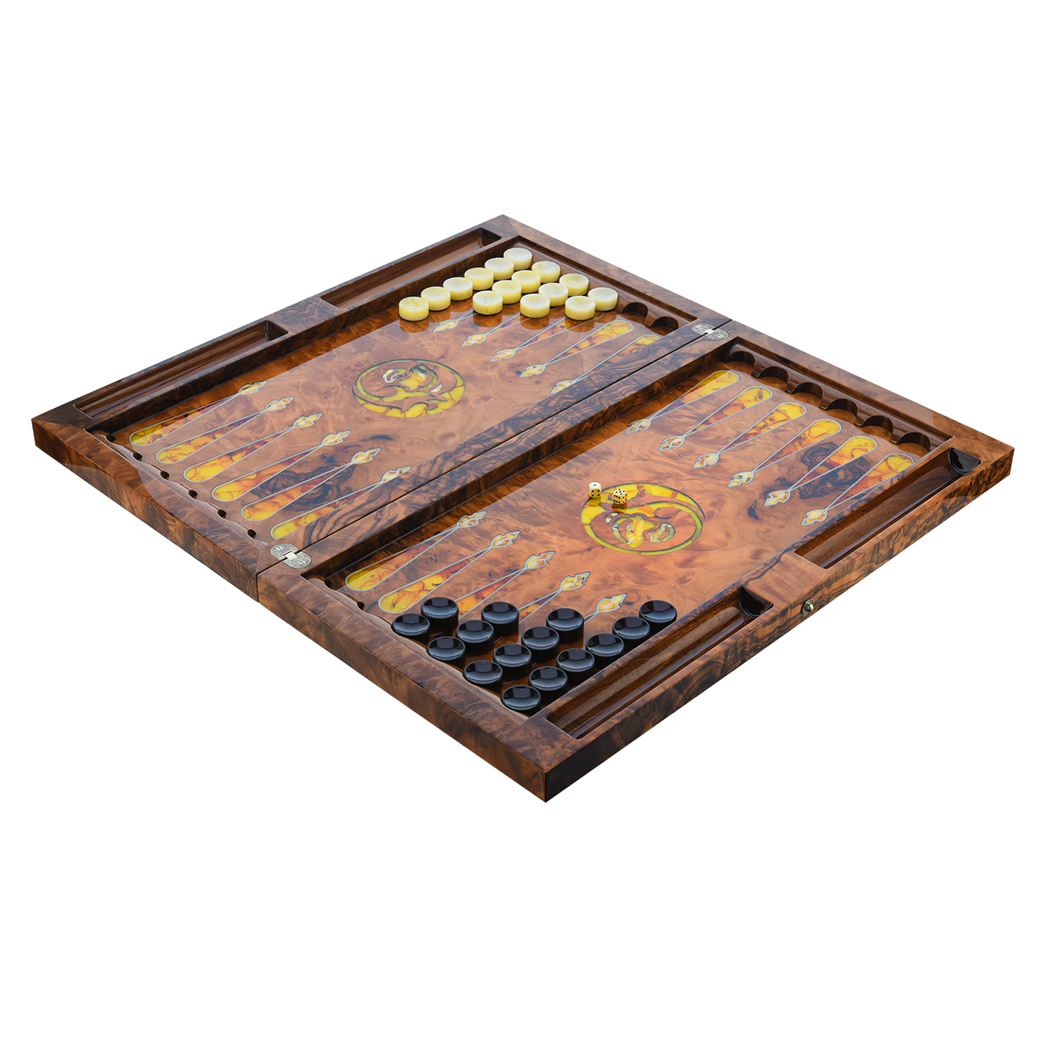 Нарды, трик-трак, бэкгаммон, тавла, шеш-беш, коша насчитывают свыше 5 тысяч лет и переводятся с древнеиранского языка как храбрый. Древние египтяне играли в сенет из семейства «гоночных игр», где ходы контролируются игральными костями, в 3500 до н. э.. В царской игре Ура участвовали жители древней Месопотамии. Находки в Шахри-Сухте в Иране показали, что похожая игра (две кости и 60 фишек) существовала около 3000 до нашей эры. Римская табула была идентична современным нардам, ее описал в эпиграмме византийский император Зенон. Предшественником ее считается древнеримская игра Ludus duodecim scriptorum (с латинского «игра двенадцати знаков»). Она упоминается в «Науке любви» Овидия. Мореный дуб (от французского «marais» - болото) является драгоценным древесным материалом с серебристо-седыми благородными прожилками. Столетиями, тысячелетиями затонувшие дубовые стволы находились на дне водоемов, где без доступа воздуха, в процессе морения приобрели прочность подобно камню. Нежные палевые оттенки свидетельствуют о возрасте морения в 300-400 лет, а черный цвет - более чем 1000 лет. Мореный дуб именуют «черным» или «железным деревом» из-за высокой минерализации солями металла. Древесина, благодаря длительному пребыванию в воде, обладает мощной энергетикой. .