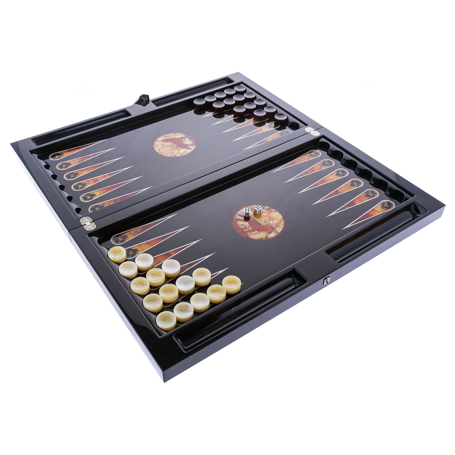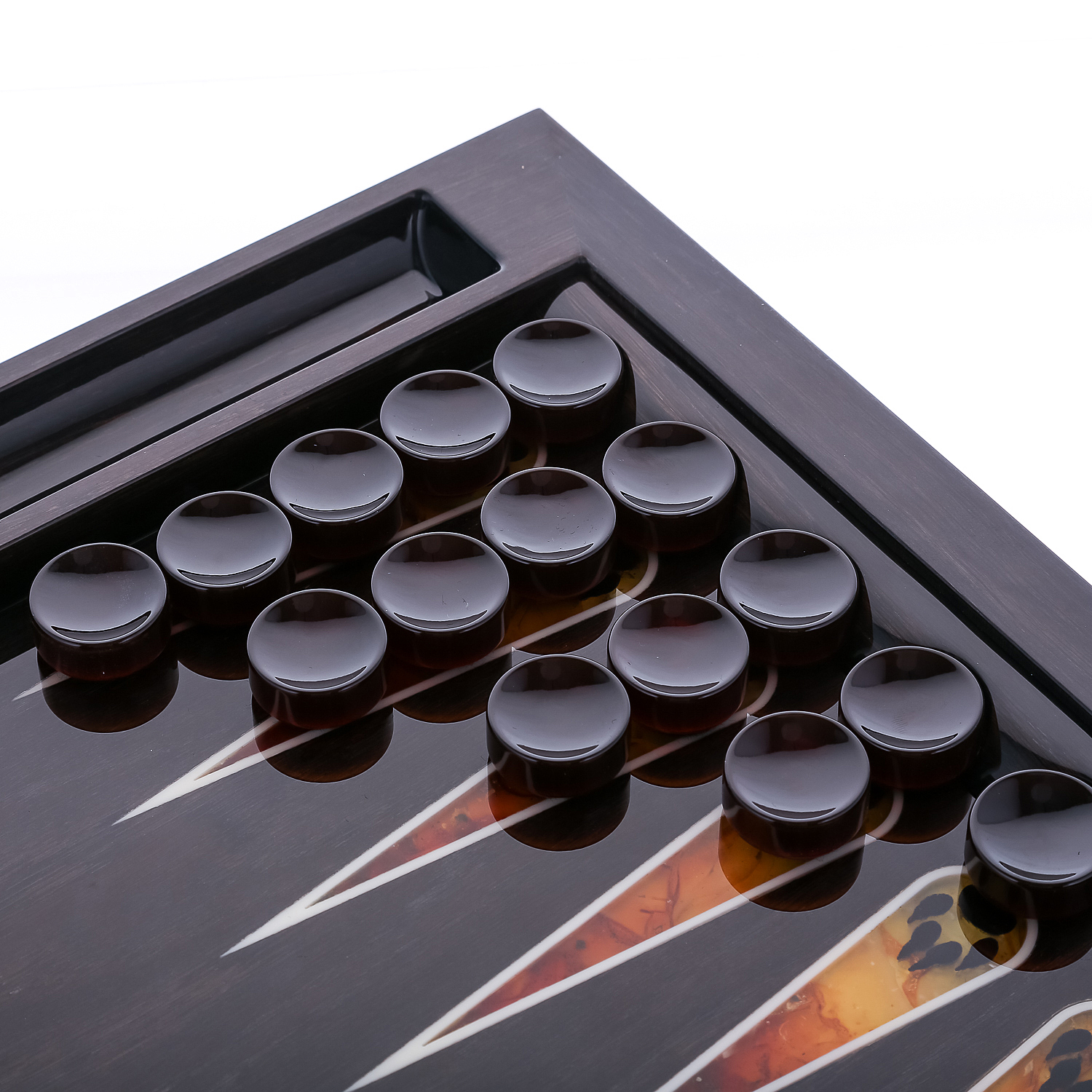 Нарды, трик-трак, бэкгаммон, тавла, шеш-беш, коша насчитывают свыше 5 тысяч лет и переводятся с древнеиранского языка как храбрый. Древние египтяне играли в сенет из семейства «гоночных игр», где ходы контролируются игральными костями, в 3500 до н. э.. В царской игре Ура участвовали жители древней Месопотамии. Находки в Шахри-Сухте в Иране показали, что похожая игра существовала 3000 до нашей эры. Римская табула была идентична современным нардам, ее описал в эпиграмме византийский император Зенон. Предшественником ее считается древнеримская игра Ludus duodecim scriptorum (с латинского «игра двенадцати знаков»). Она упоминается в «Науке любви» Овидия. Мореный дуб (от французского «marais» - болото) является драгоценным древесным материалом с седыми благородными прожилками. Столетиями, тысячелетиями затонувшие дубовые стволы находились на дне водоемов, где без доступа воздуха, в процессе морения приобрели прочность подобно камню. Мастера: Н.Воронин, Н.Краснюкова, И.Марин. .