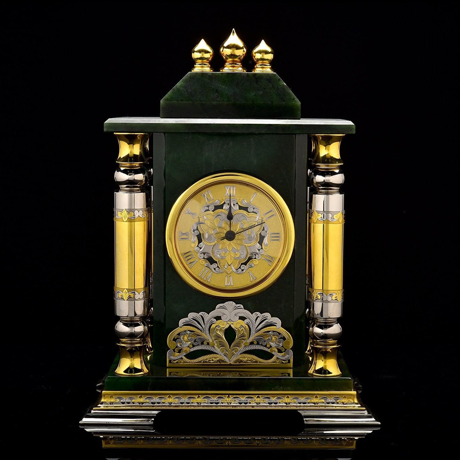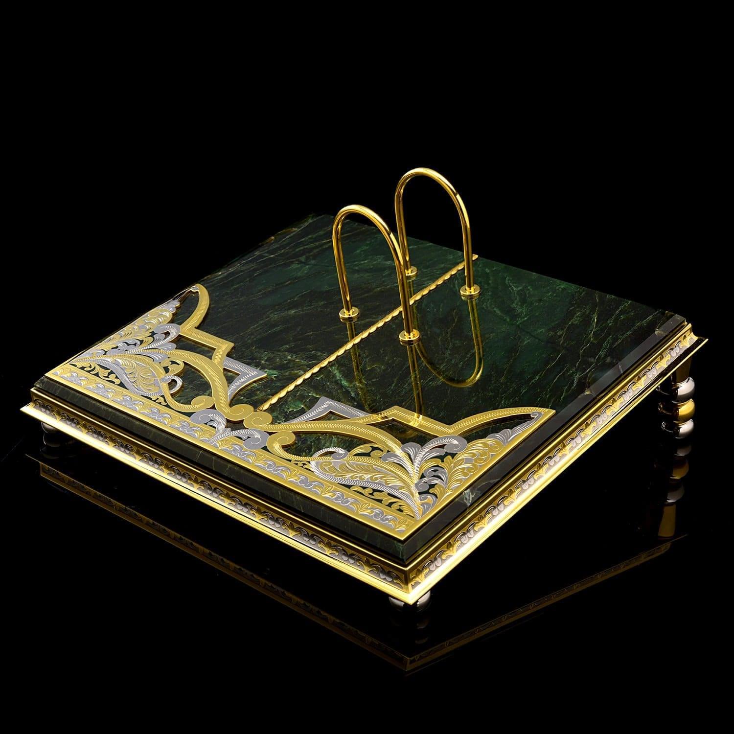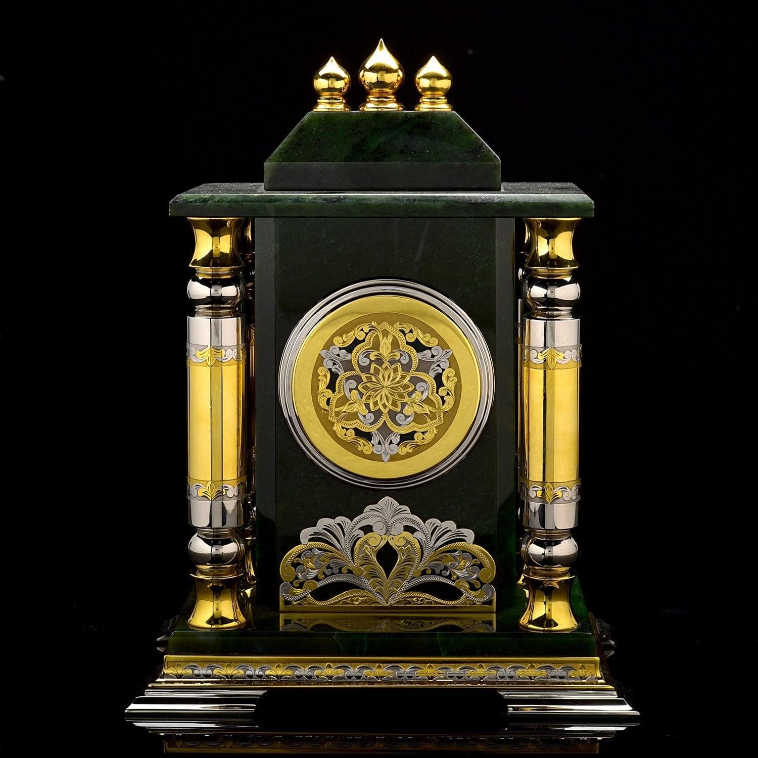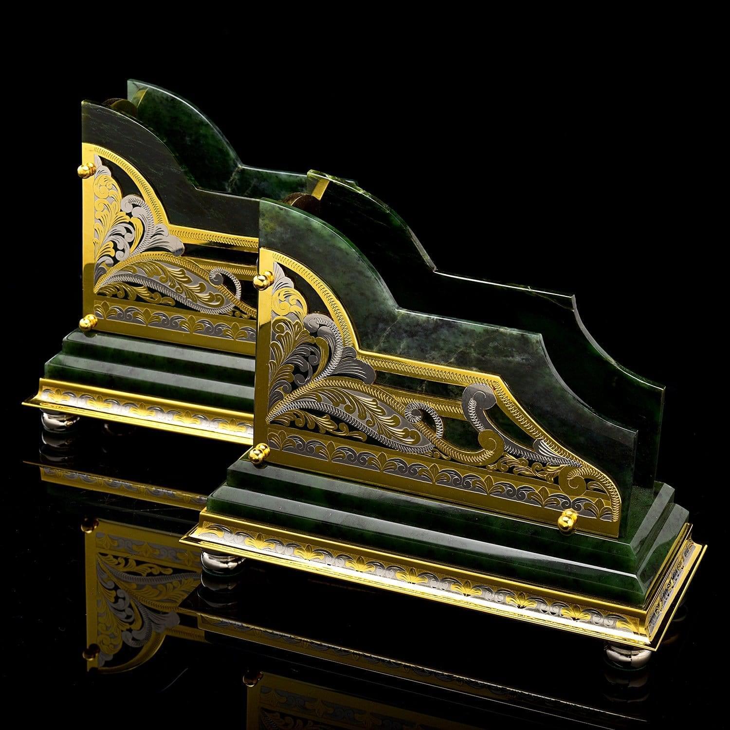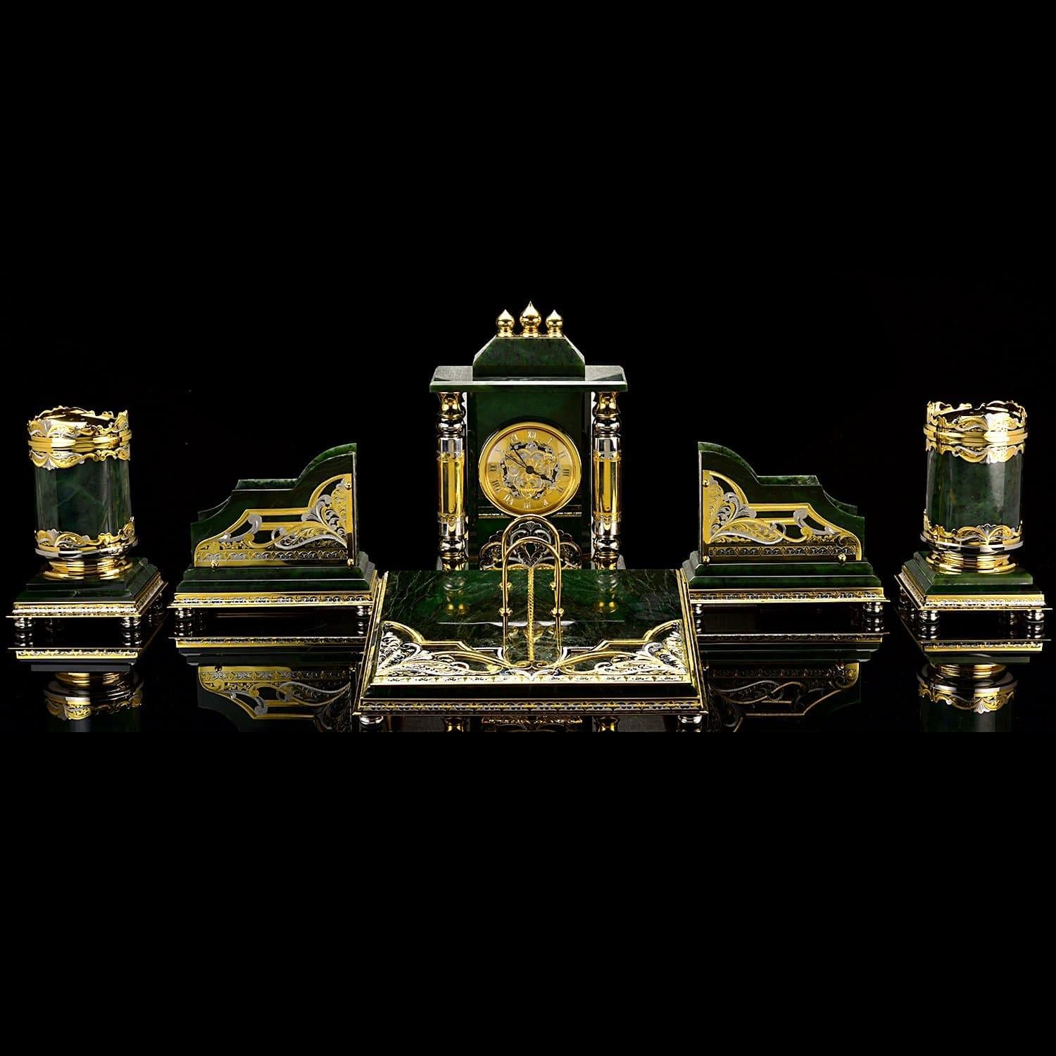 Понравится руководителю!Монументальный письменный набор с несколькими корпусами из камня нефрита, с декоративными элементами из латуни, украшенными вручную изысканными гравюрами. Изделия набора созданы вручную. Это еще один вариант элитного / vip- подарка, подчеркивающего статус и стиль, для делового человека, президента от мастеров Златоуста - поставщиков элементов декора для главной резиденции президента России, Московского Кремля.