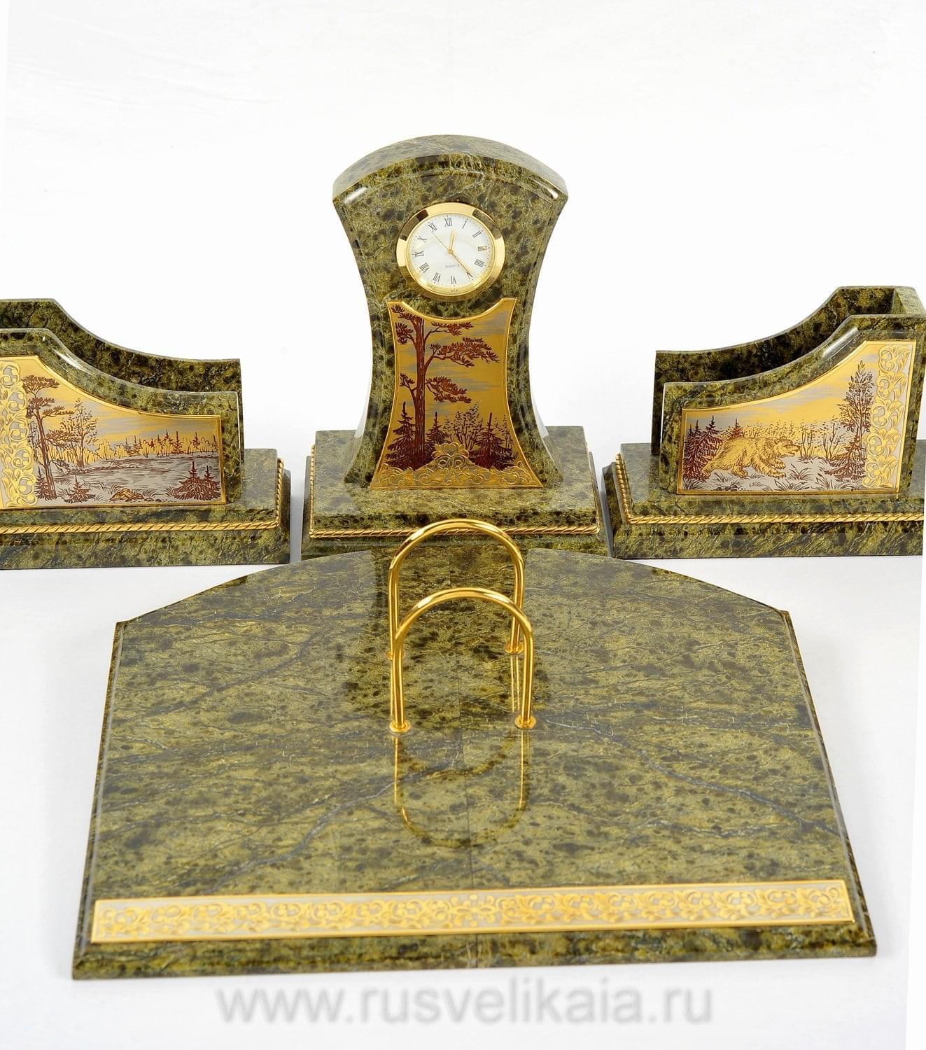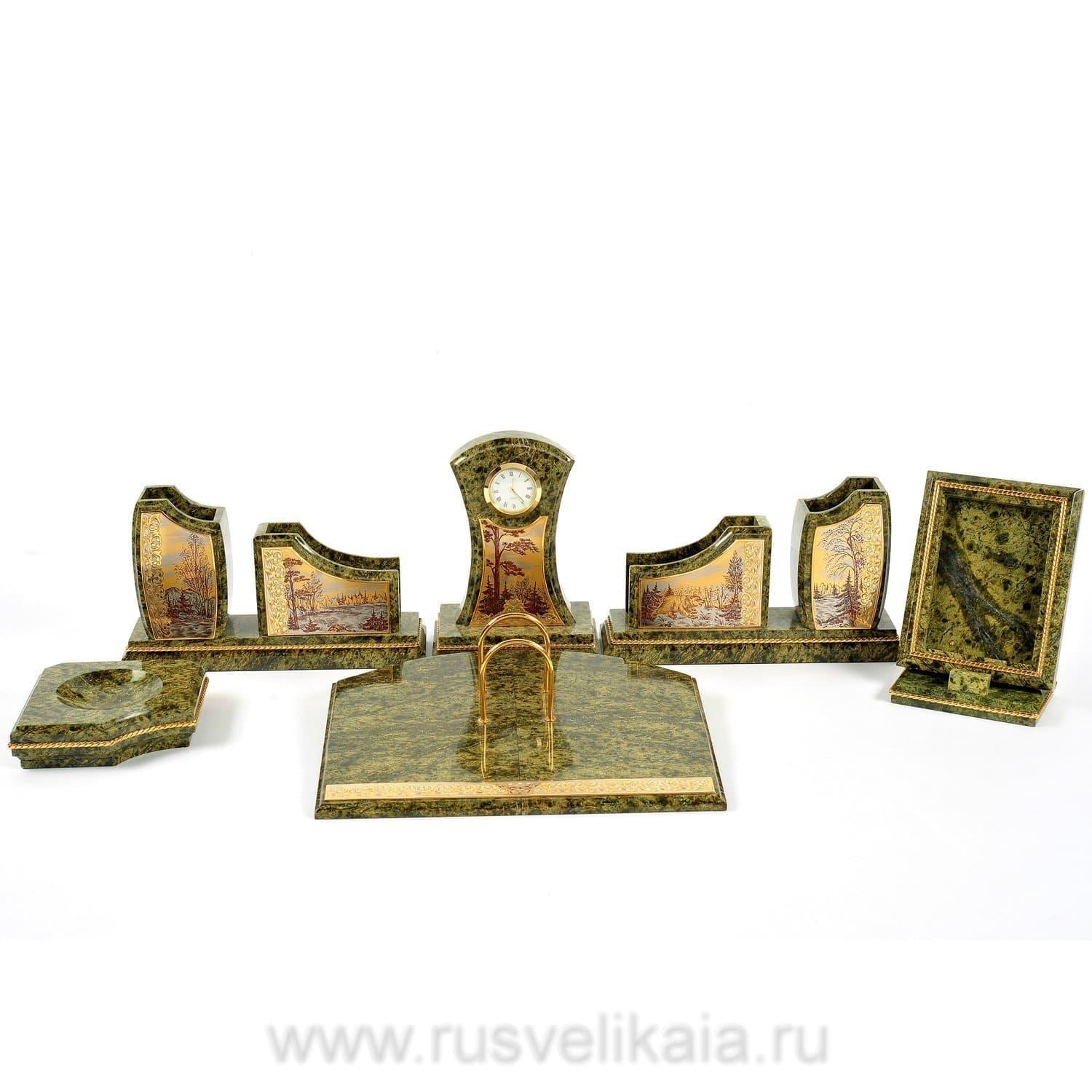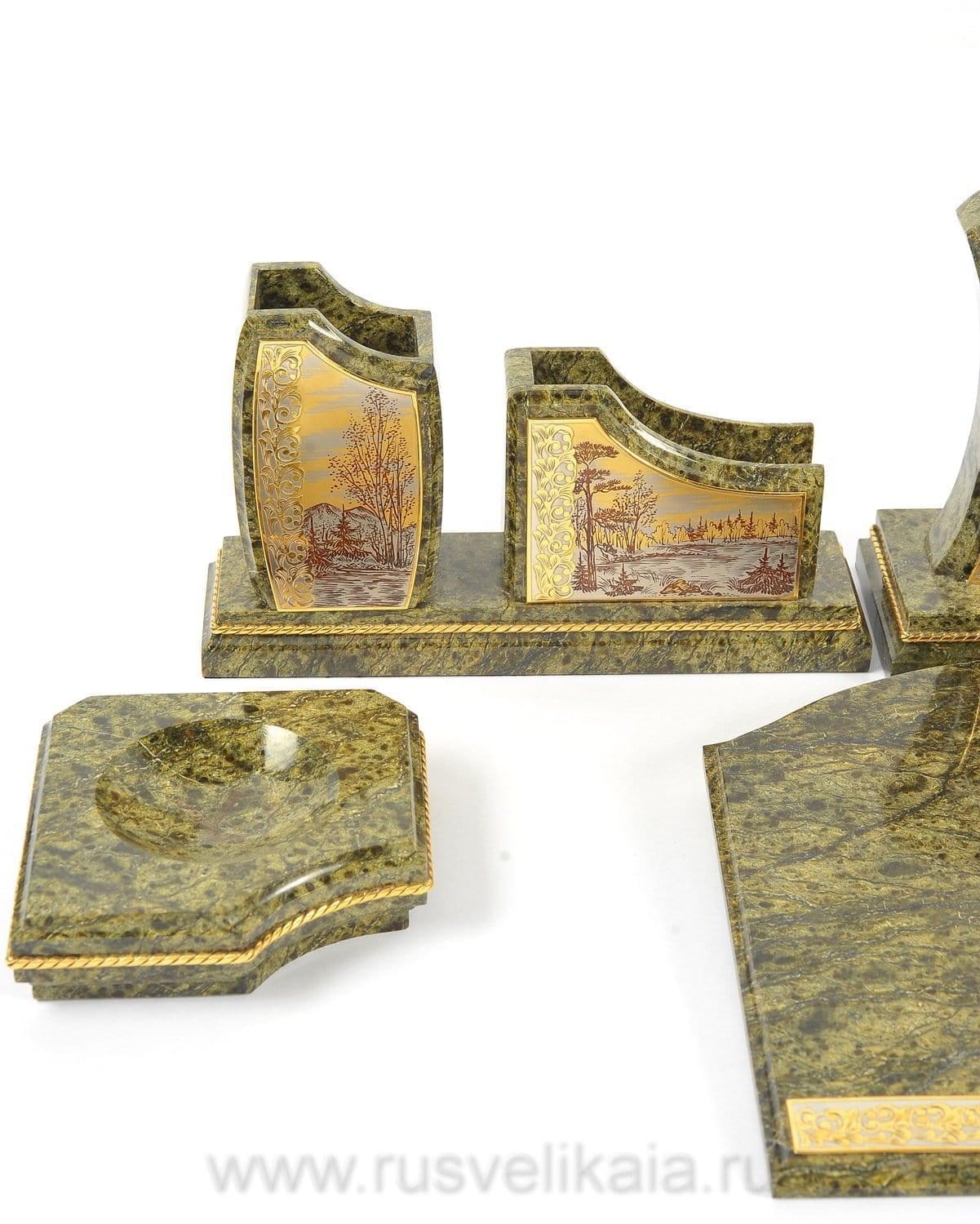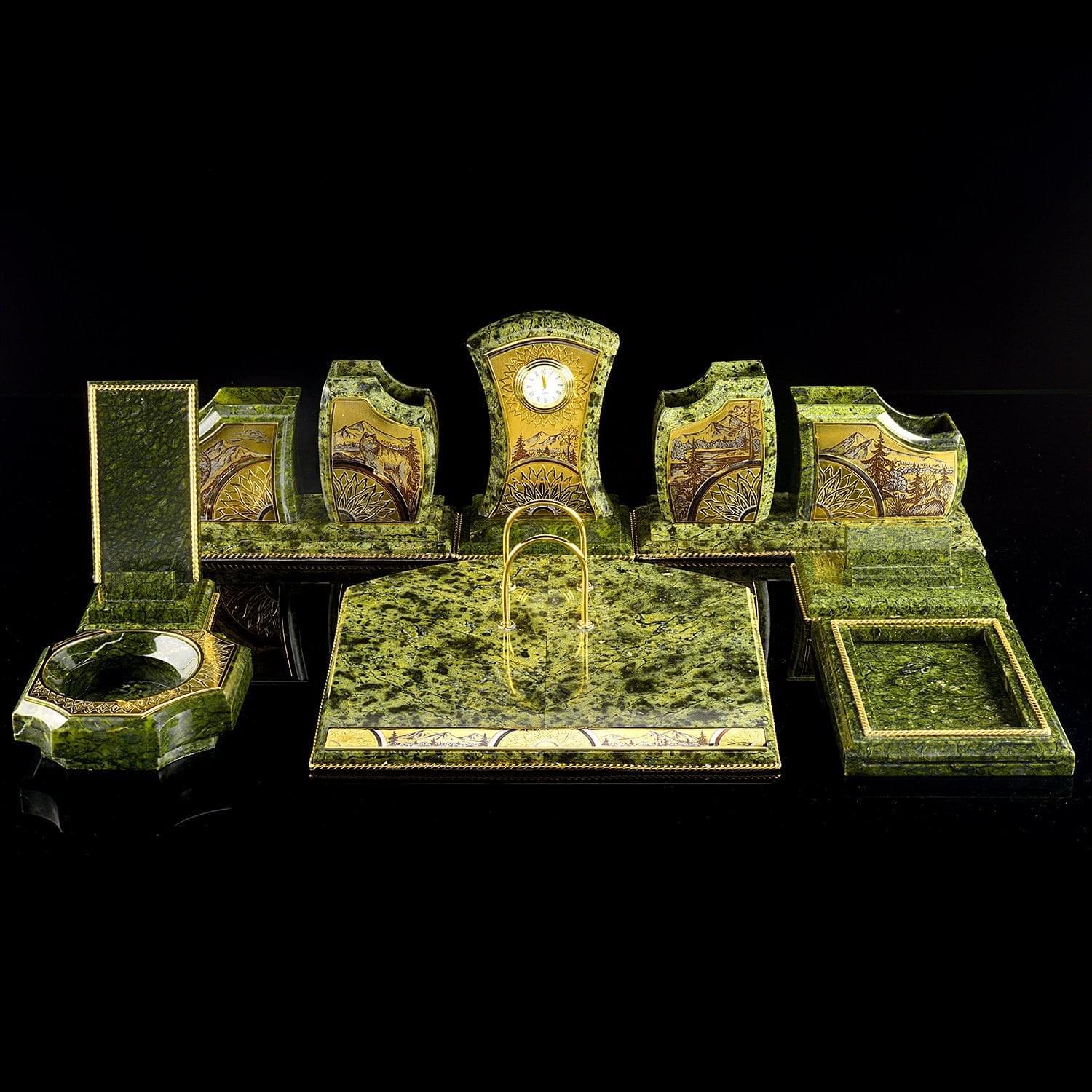 Чарующая красота этого письменного набора не оставит равнодушным даже самогон придирчивого и избирательного человека. Композиция ручной работы создана в лучших традициях старинного декоративно-прикладного искусства командой российских мастеров из Златоуста - специалистов по полудрагоценным камням. Основа всех элементов набора сделана из красивого природного камня змеевика. С давних времен этот материал высоко ценился художниками по всему миру за свою красоту, универсальность и лечебные свойства. Змеевик - камень сильных, независимых людей.Декоративные элементы письменного набора созданы из сплава никеля и латуни и покрыты золотом. Набор включает в себя часы, пепельницу, перекидной календарь, накопители для бумаг, карандашницы. Каждый элемент набора проработан мастерами вручную, отточен до мельчайших подробностей. Роскошный письменный набор из змеевика, выполненный в строгом и одновременно элегантном стиле, послужит чудесным украшением рабочего кабинета делового человека, неравнодушного к красивым интерьерным аксессуарам.
