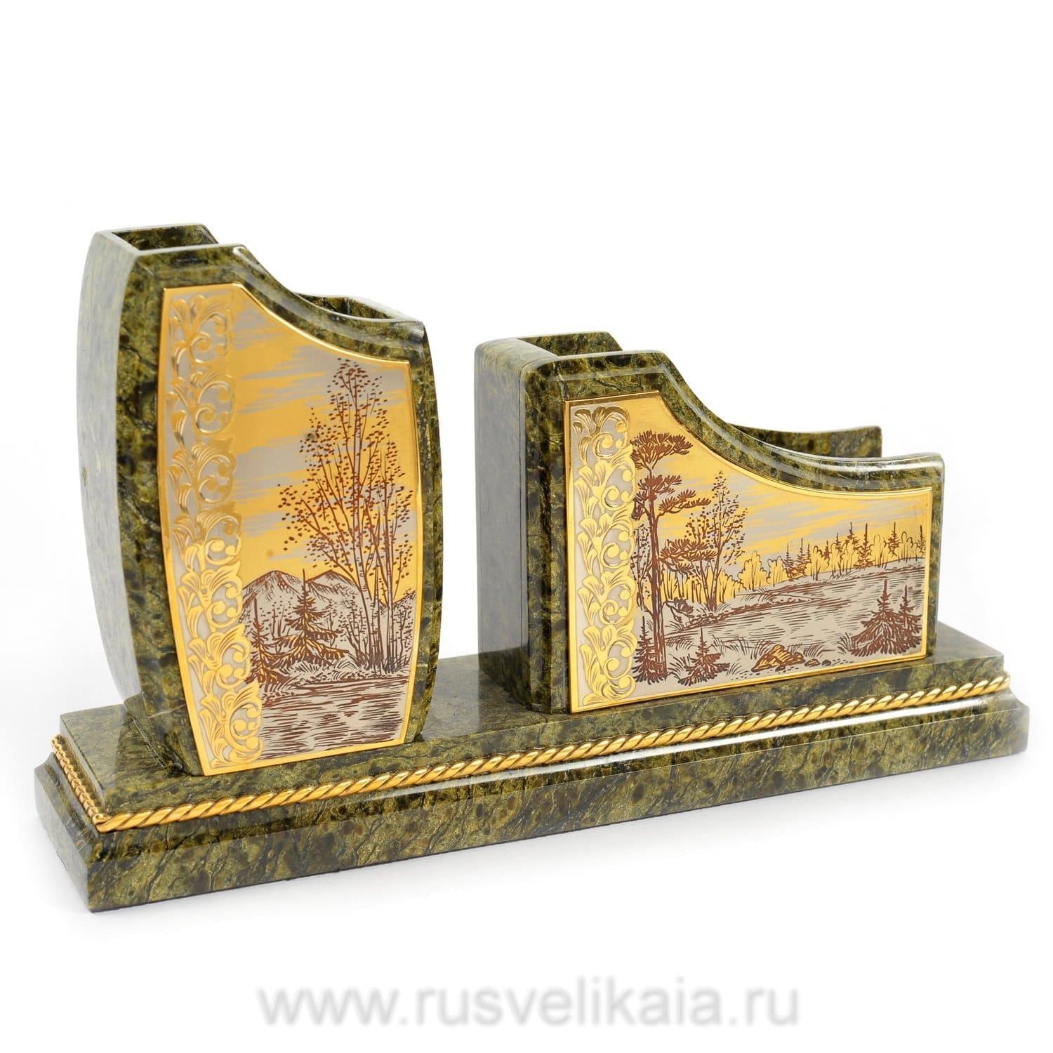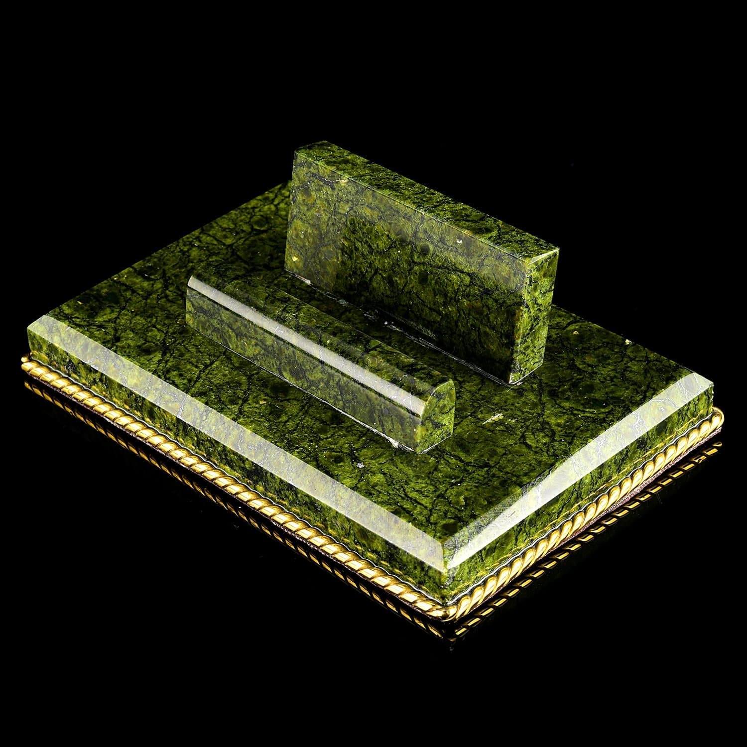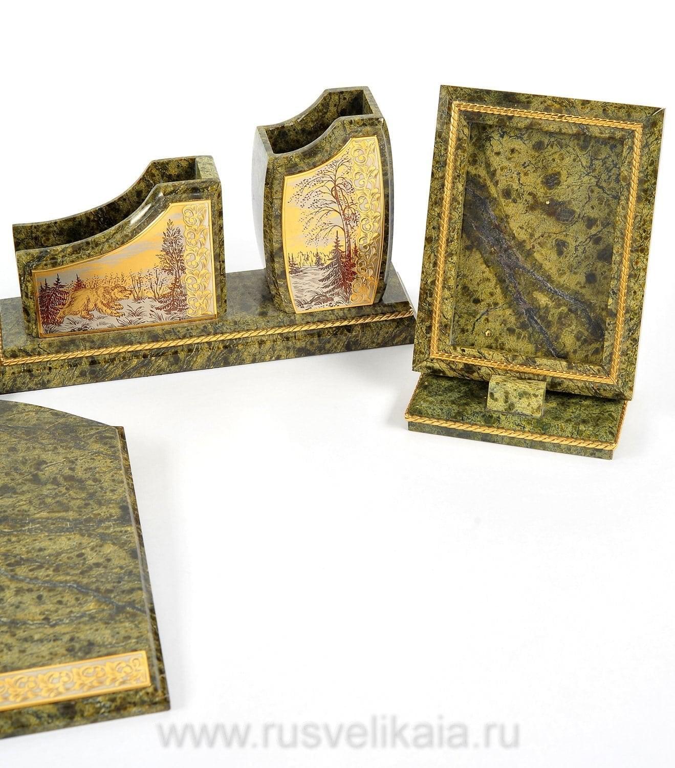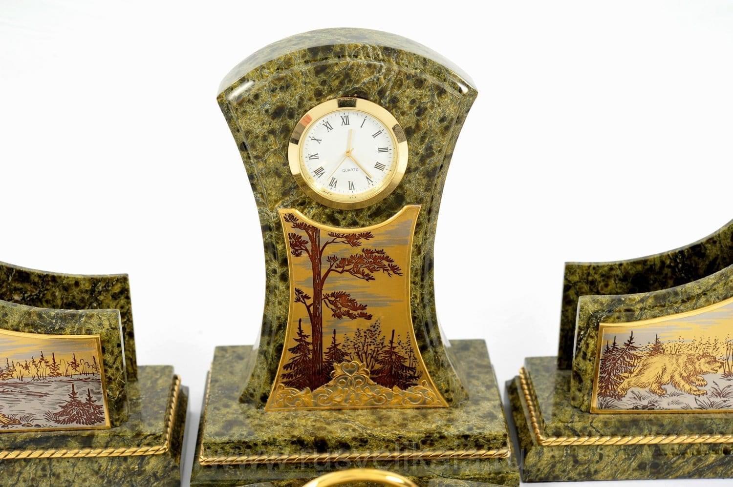 Чарующая красота этого письменного набора не оставит равнодушным даже самогон придирчивого и избирательного человека. Композиция ручной работы создана в лучших традициях старинного декоративно-прикладного искусства командой российских мастеров из Златоуста - специалистов по полудрагоценным камням. Основа всех элементов набора сделана из красивого природного камня змеевика. С давних времен этот материал высоко ценился художниками по всему миру за свою красоту, универсальность и лечебные свойства. Змеевик - камень сильных, независимых людей.Декоративные элементы письменного набора созданы из сплава никеля и латуни и покрыты золотом. Набор включает в себя часы, пепельницу, перекидной календарь, накопители для бумаг, карандашницы. Каждый элемент набора проработан мастерами вручную, отточен до мельчайших подробностей. Роскошный письменный набор из змеевика, выполненный в строгом и одновременно элегантном стиле, послужит чудесным украшением рабочего кабинета делового человека, неравнодушного к красивым интерьерным аксессуарам.
