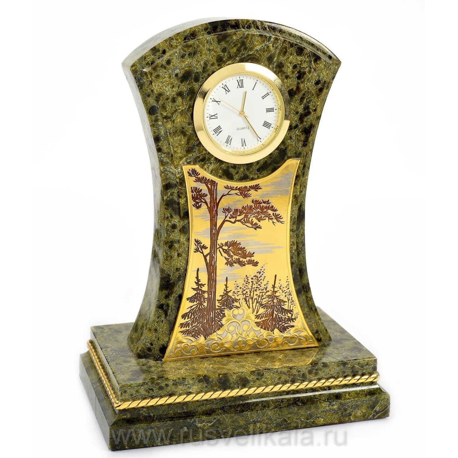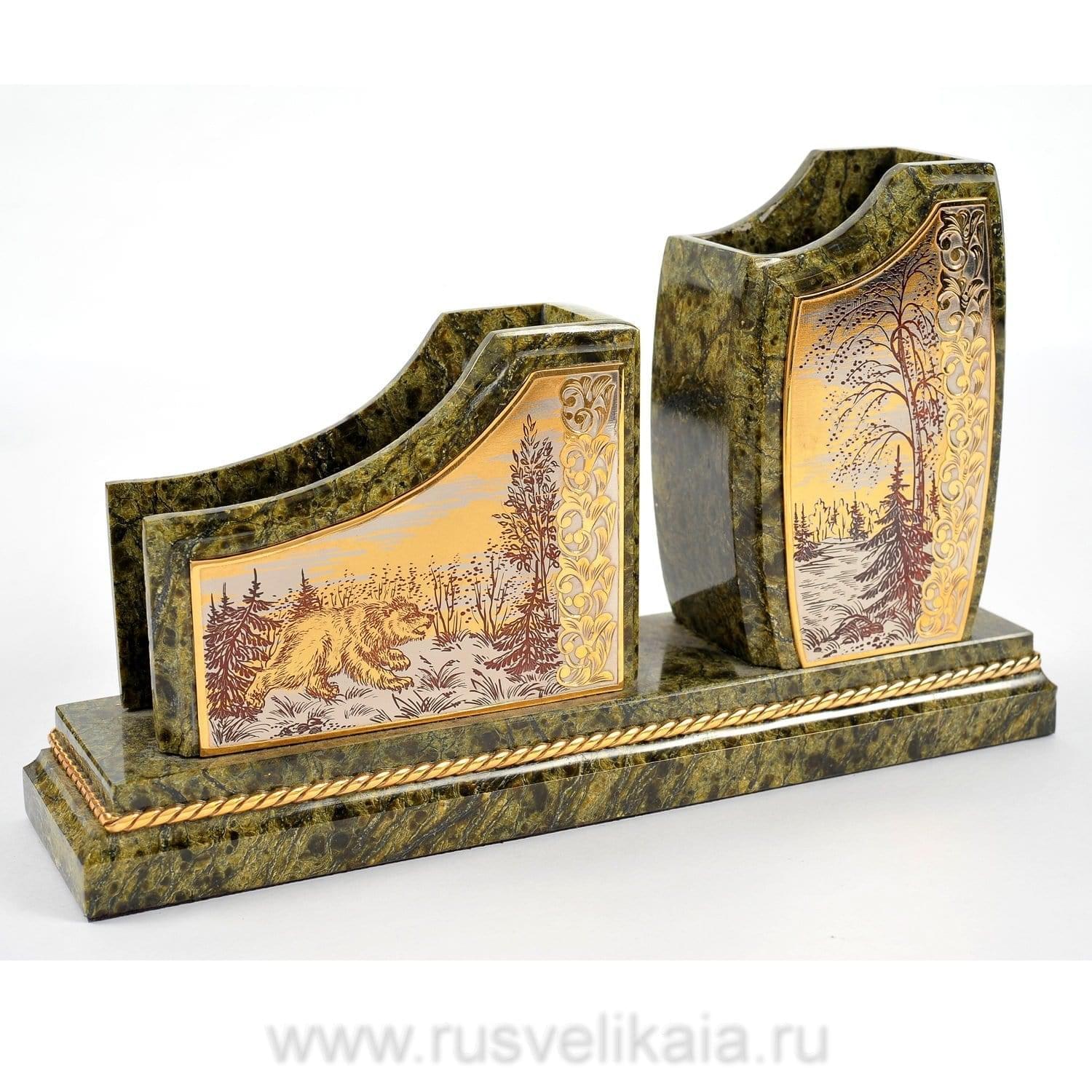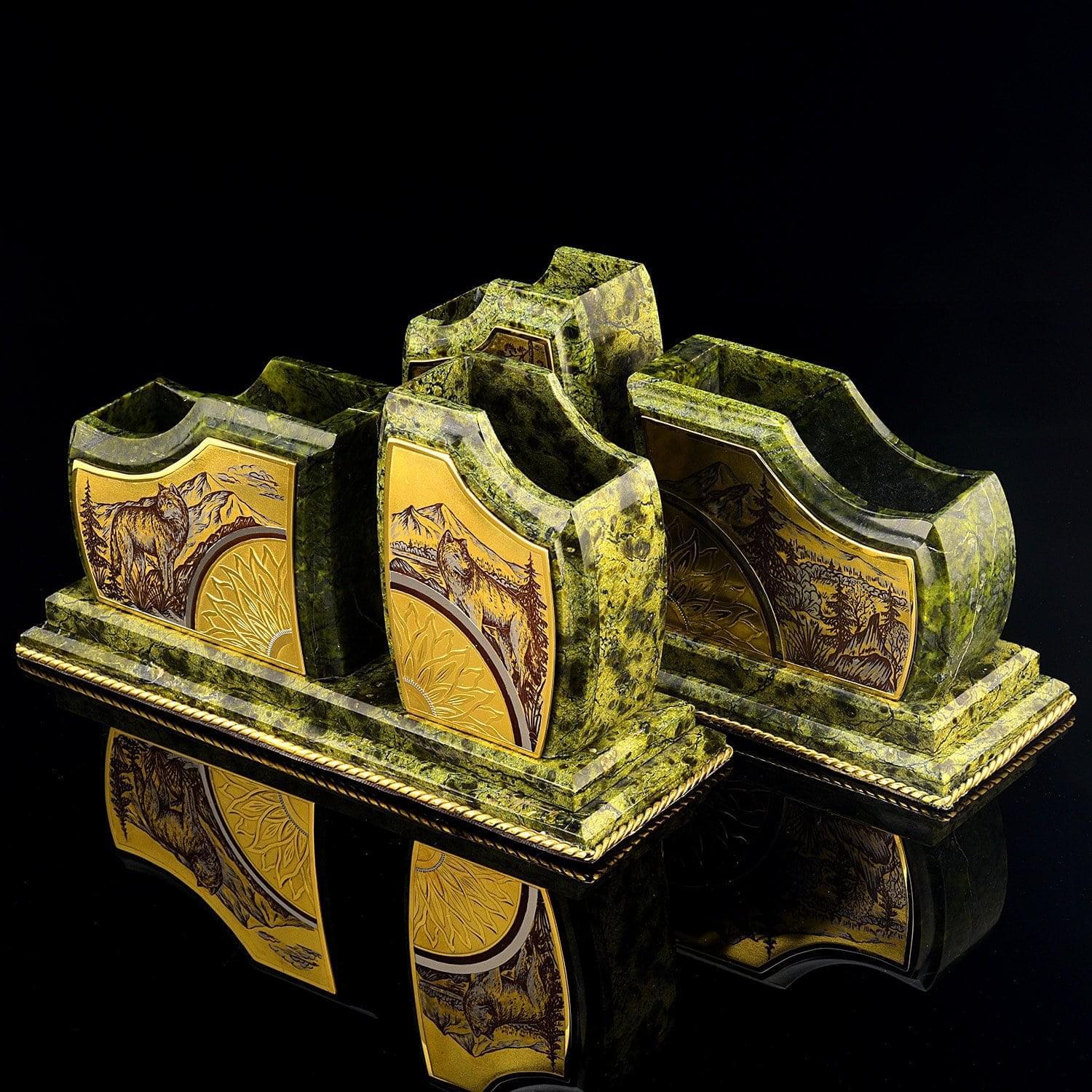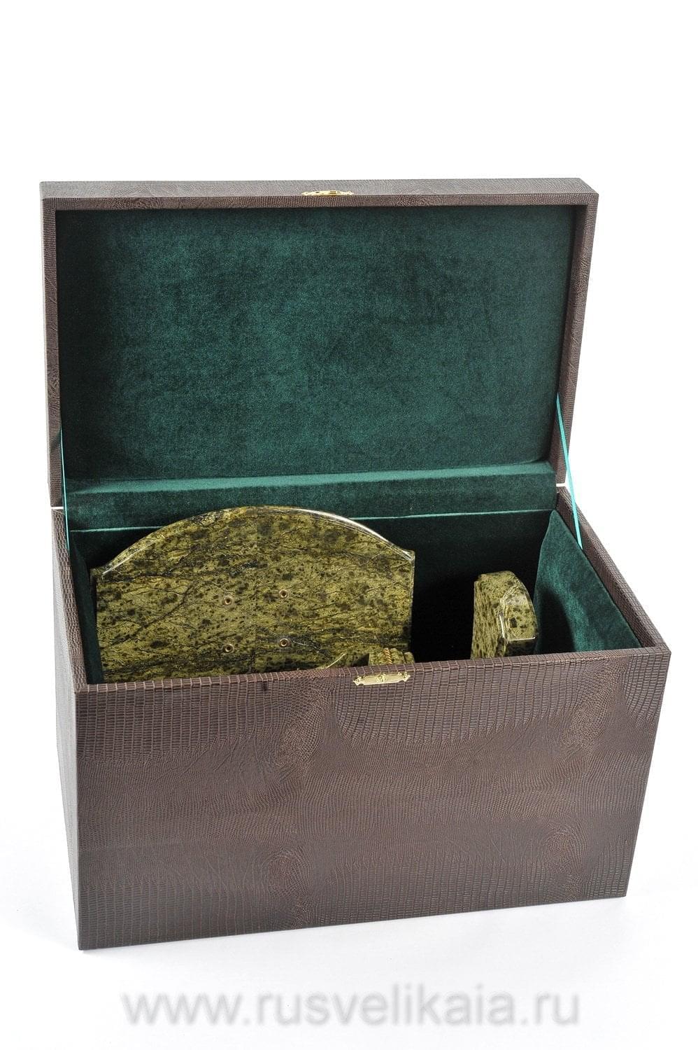 Чарующая красота этого письменного набора не оставит равнодушным даже самогон придирчивого и избирательного человека. Композиция ручной работы создана в лучших традициях старинного декоративно-прикладного искусства командой российских мастеров из Златоуста - специалистов по полудрагоценным камням. Основа всех элементов набора сделана из красивого природного камня змеевика. С давних времен этот материал высоко ценился художниками по всему миру за свою красоту, универсальность и лечебные свойства. Змеевик - камень сильных, независимых людей.Декоративные элементы письменного набора созданы из сплава никеля и латуни и покрыты золотом. Набор включает в себя часы, пепельницу, перекидной календарь, накопители для бумаг, карандашницы. Каждый элемент набора проработан мастерами вручную, отточен до мельчайших подробностей. Роскошный письменный набор из змеевика, выполненный в строгом и одновременно элегантном стиле, послужит чудесным украшением рабочего кабинета делового человека, неравнодушного к красивым интерьерным аксессуарам.