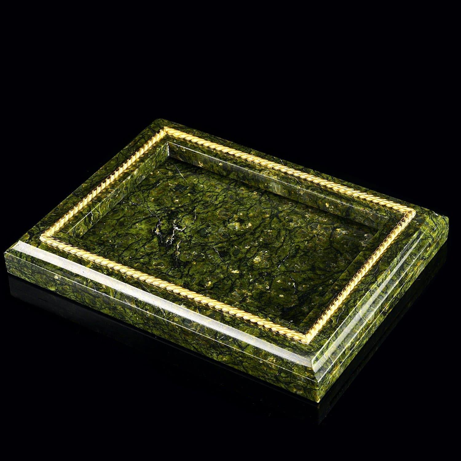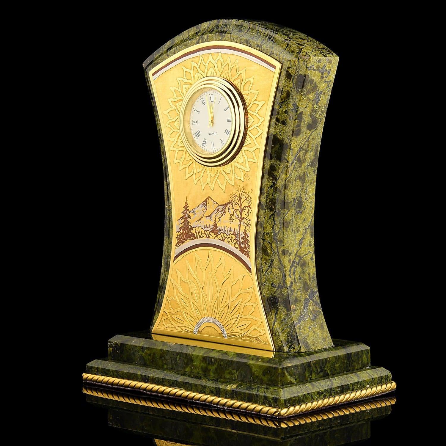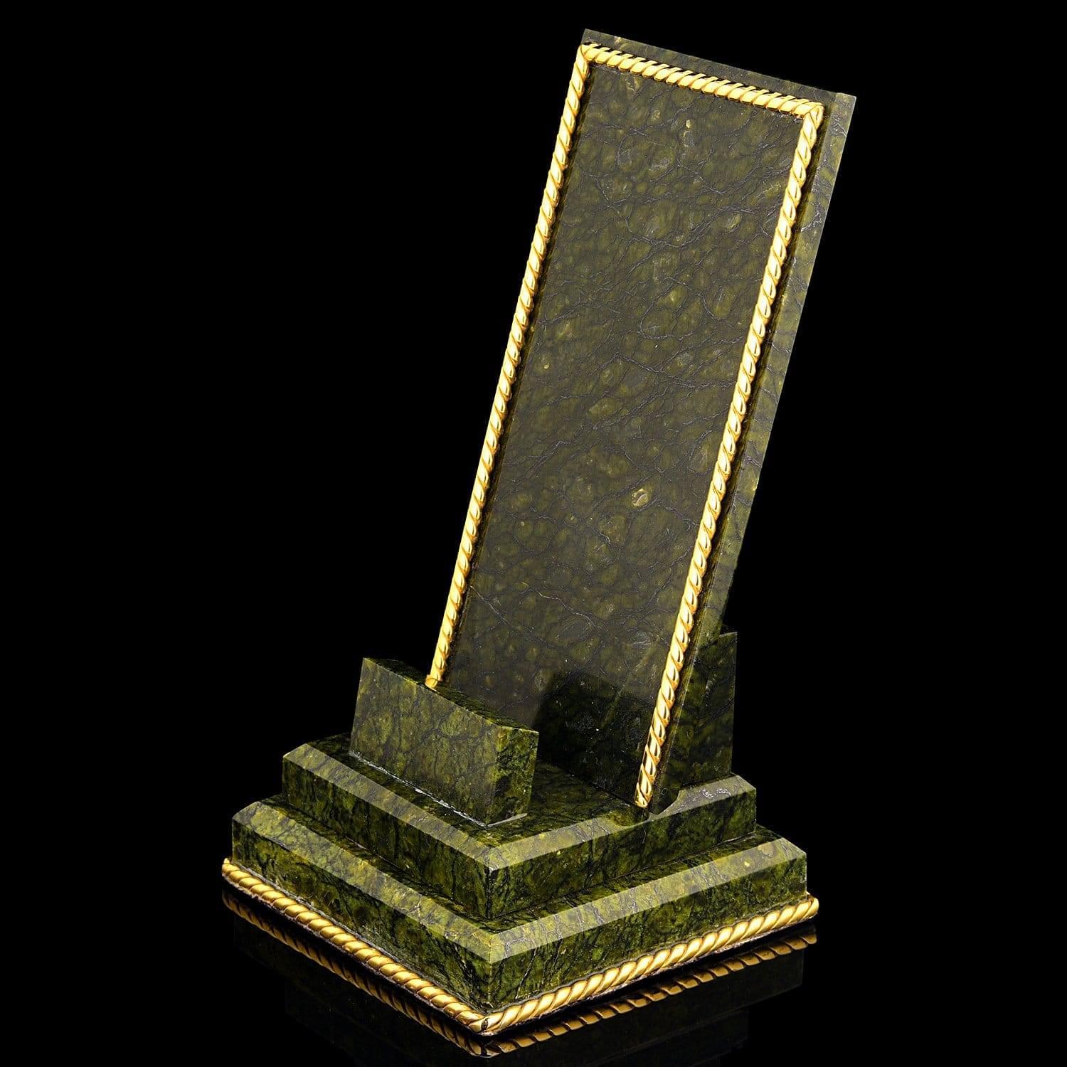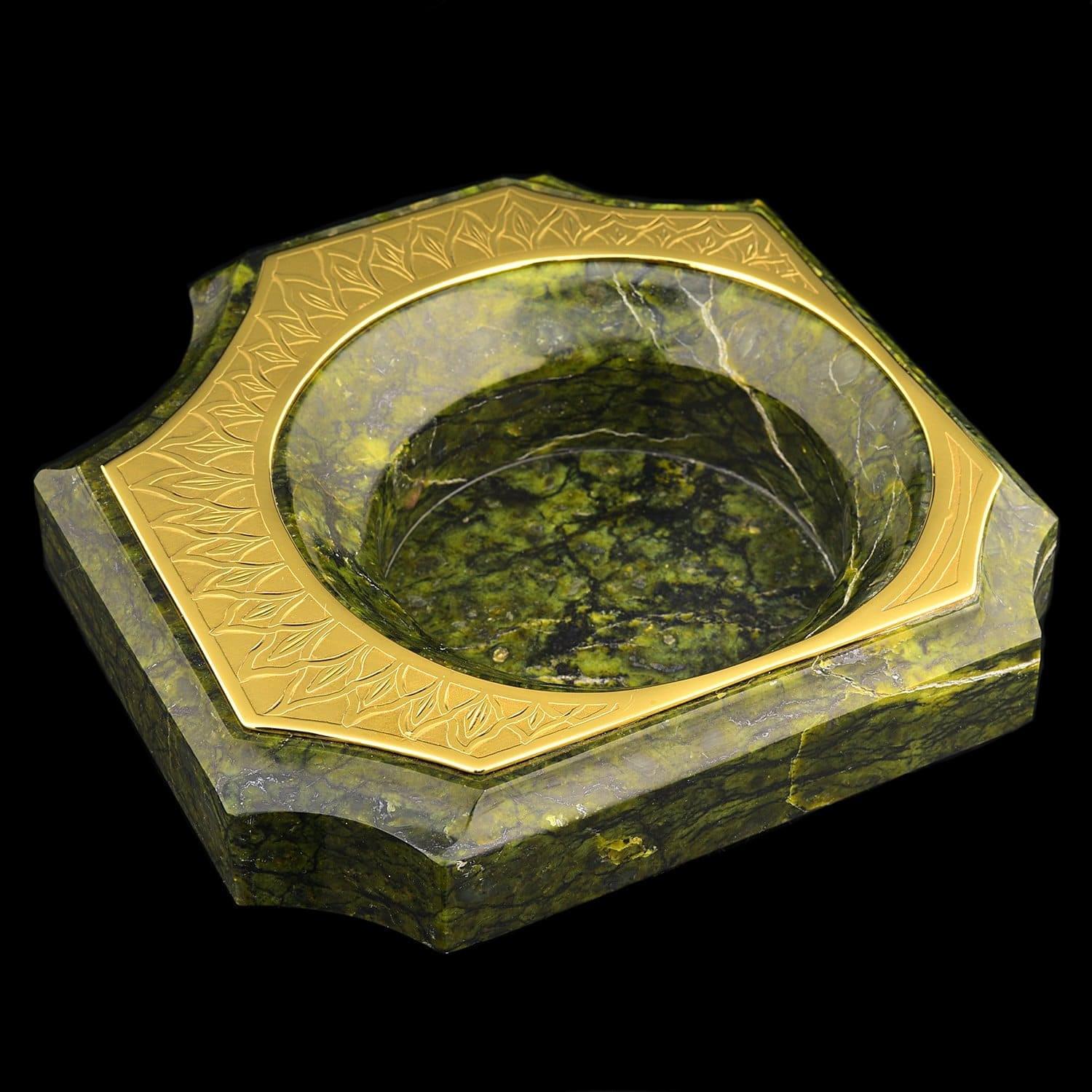 Чарующая красота этого письменного набора не оставит равнодушным даже самогон придирчивого и избирательного человека. Композиция ручной работы создана в лучших традициях старинного декоративно-прикладного искусства командой российских мастеров из Златоуста - специалистов по полудрагоценным камням. Основа всех элементов набора сделана из красивого природного камня змеевика. С давних времен этот материал высоко ценился художниками по всему миру за свою красоту, универсальность и лечебные свойства. Змеевик - камень сильных, независимых людей.Декоративные элементы письменного набора созданы из сплава никеля и латуни и покрыты золотом. Набор включает в себя часы, пепельницу, перекидной календарь, накопители для бумаг, карандашницы. Каждый элемент набора проработан мастерами вручную, отточен до мельчайших подробностей. Роскошный письменный набор из змеевика, выполненный в строгом и одновременно элегантном стиле, послужит чудесным украшением рабочего кабинета делового человека, неравнодушного к красивым интерьерным аксессуарам.