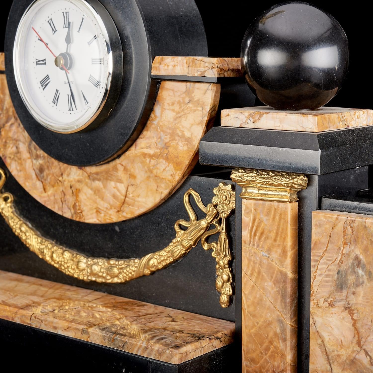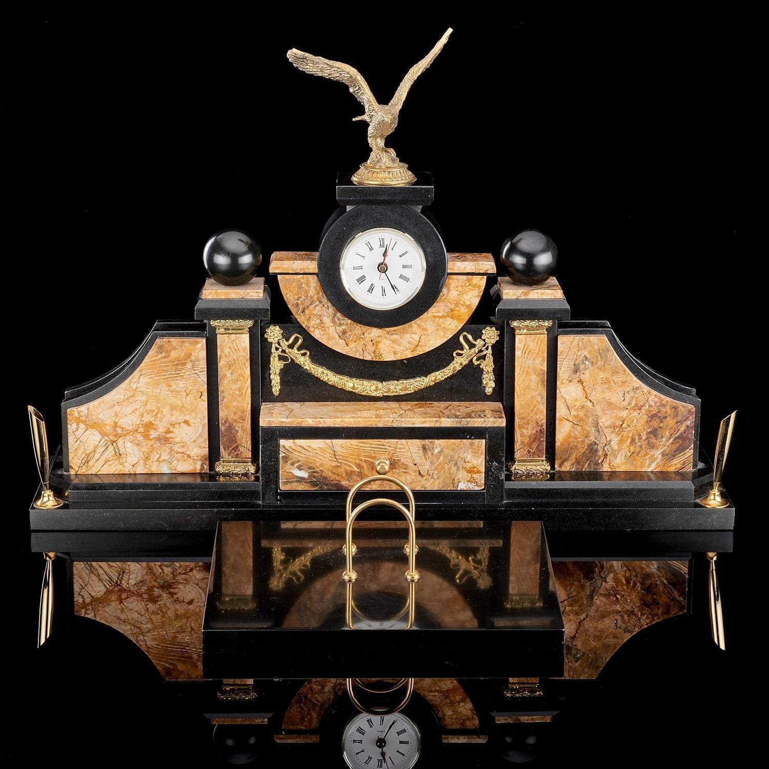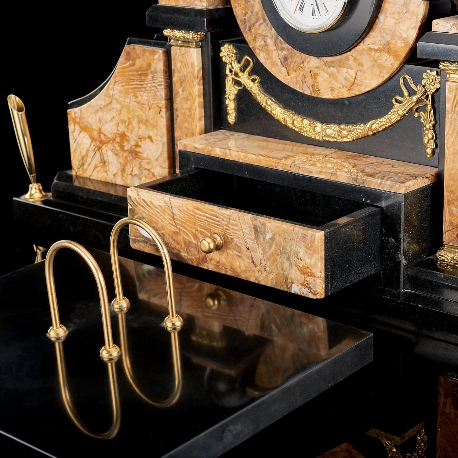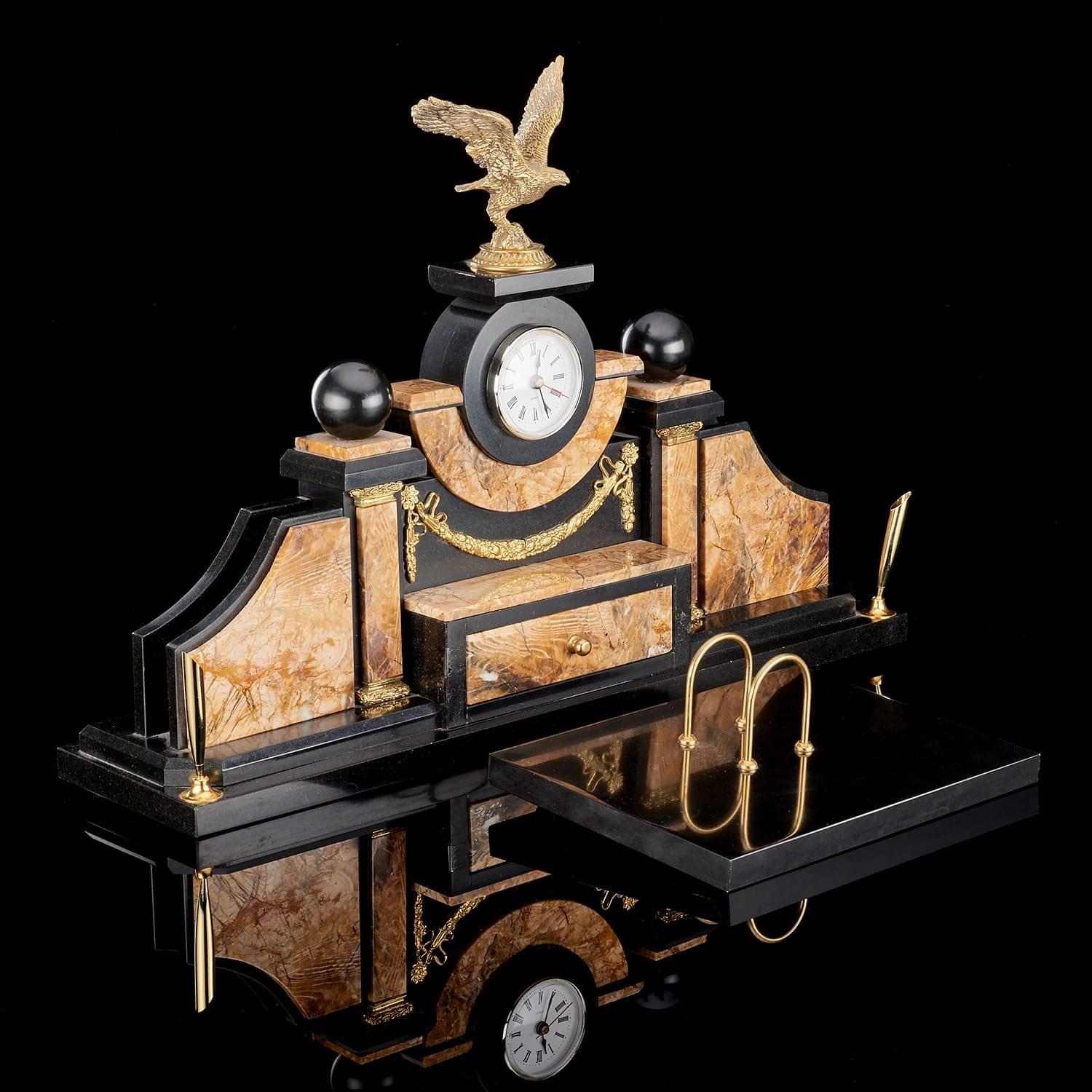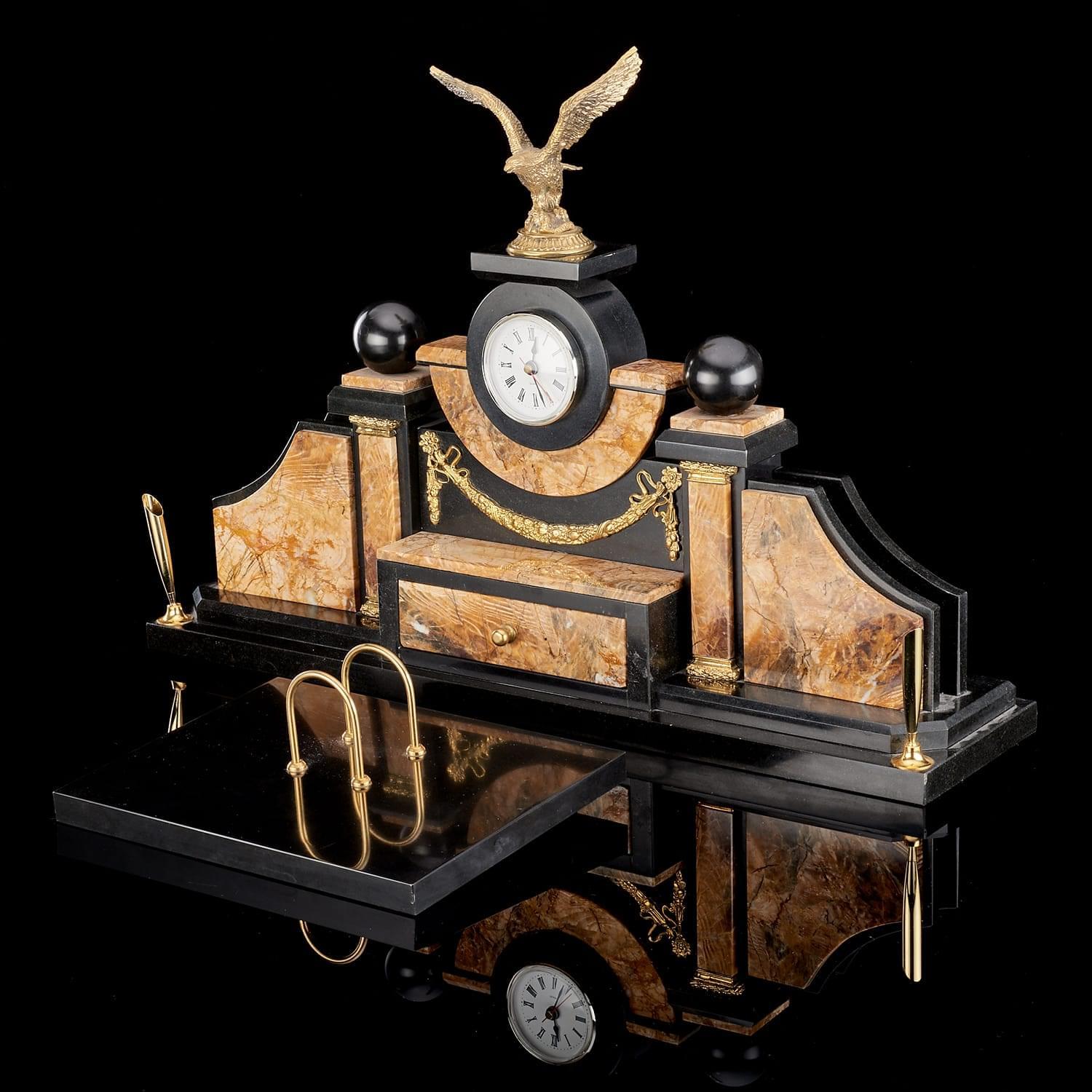 В центральный корпус из камня вставлен часовой механизм, который представлен круглым белым циферблатом в оправе. По бокам - две визитницы и подставки под ручки. Отдельно располагается подкалендарница. Металлические элементы декорированы резцом, их поверхности покрыты позолотой.