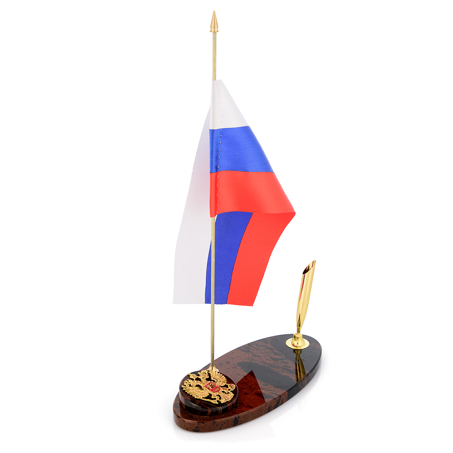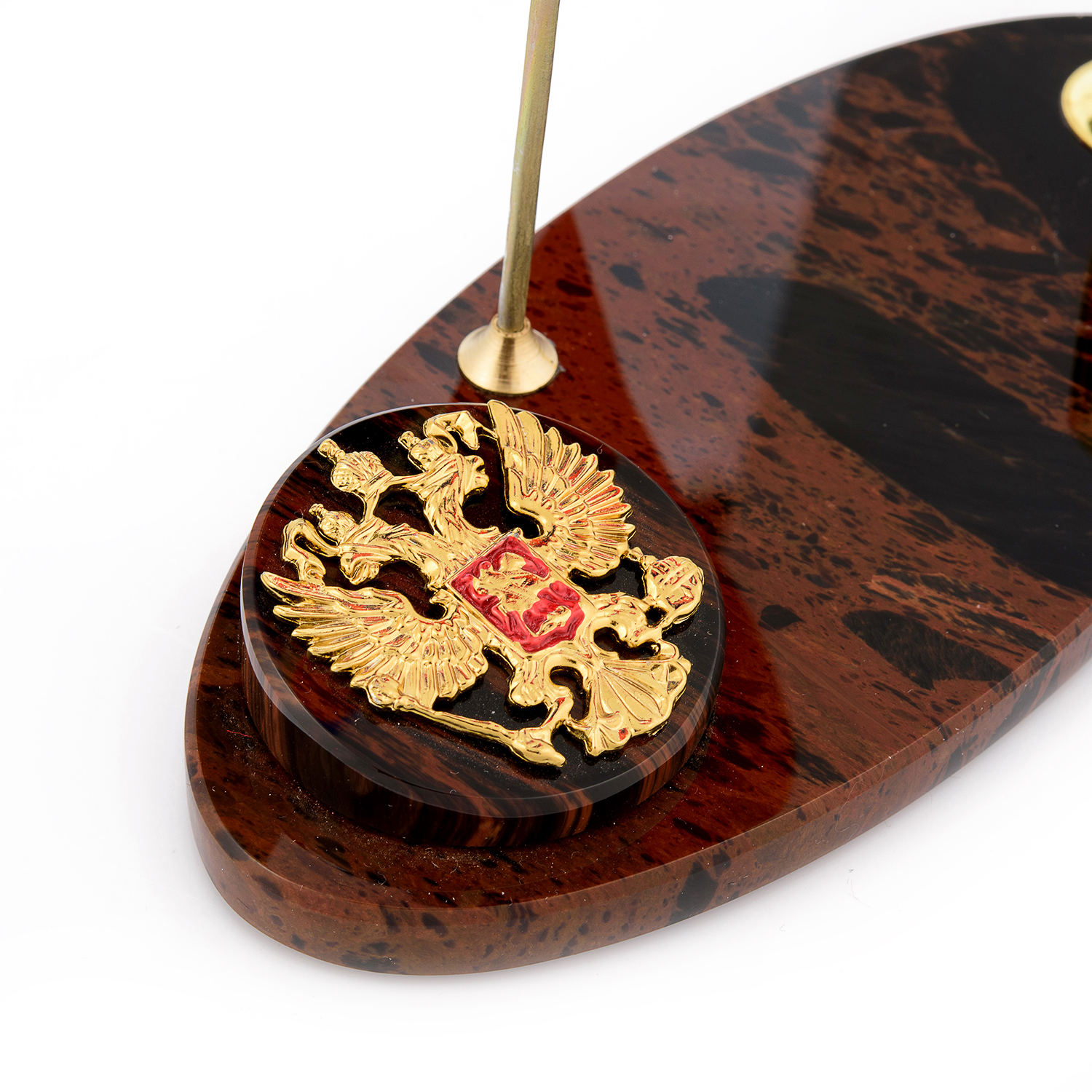 Подставка под ручку овальной формы из обсидиана с флагштоком и гербом РФ
