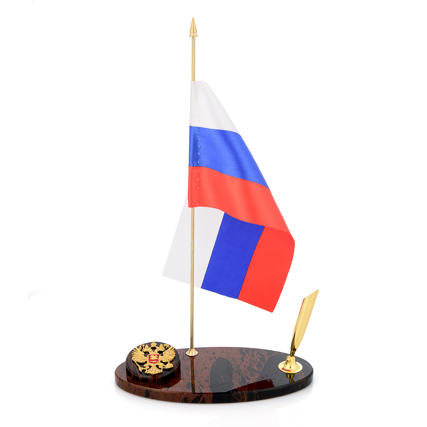Русские подарки и сувениры → Настольные принадлежности → Настольные наборы → Подставка под ручку овальной формы из обсидиана с флагштоком и гербом РФ