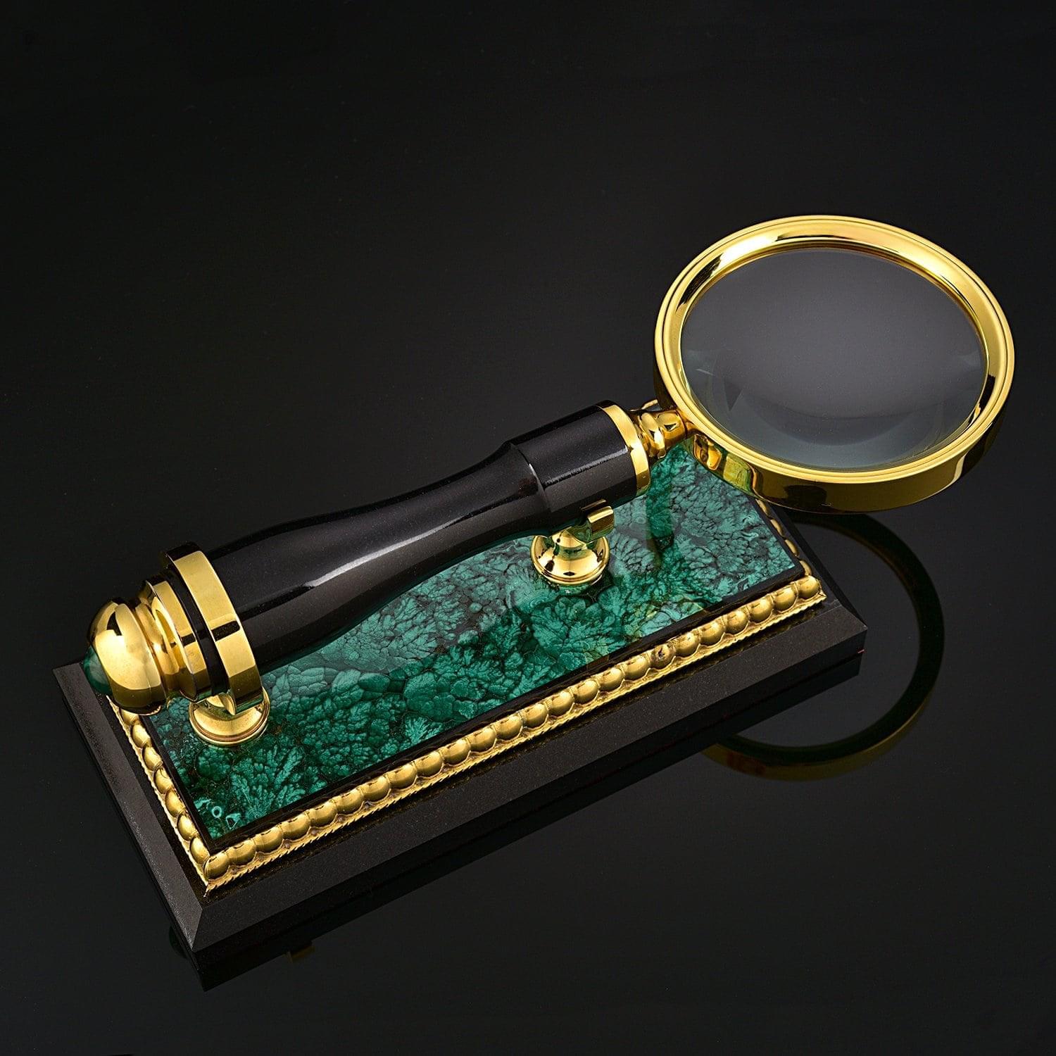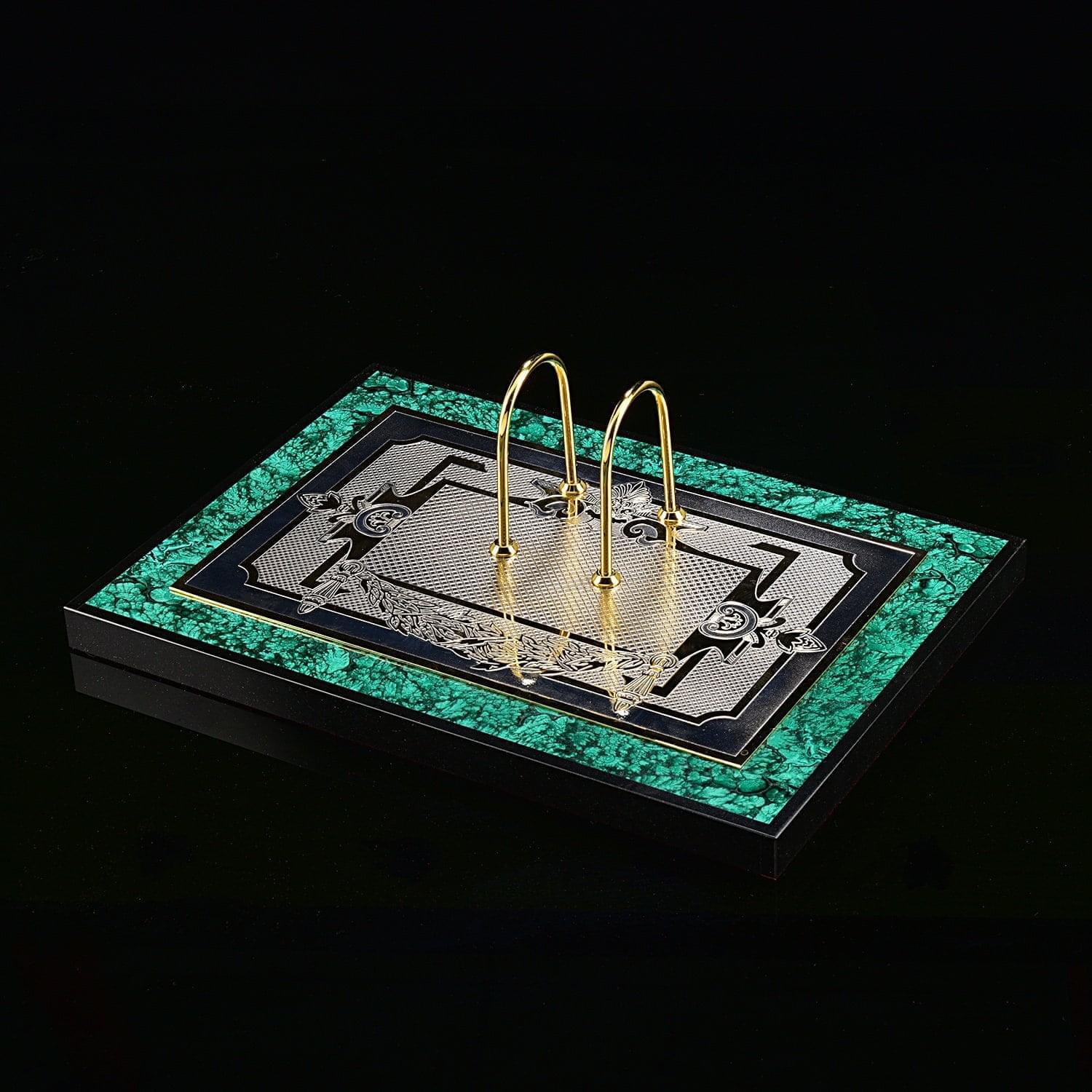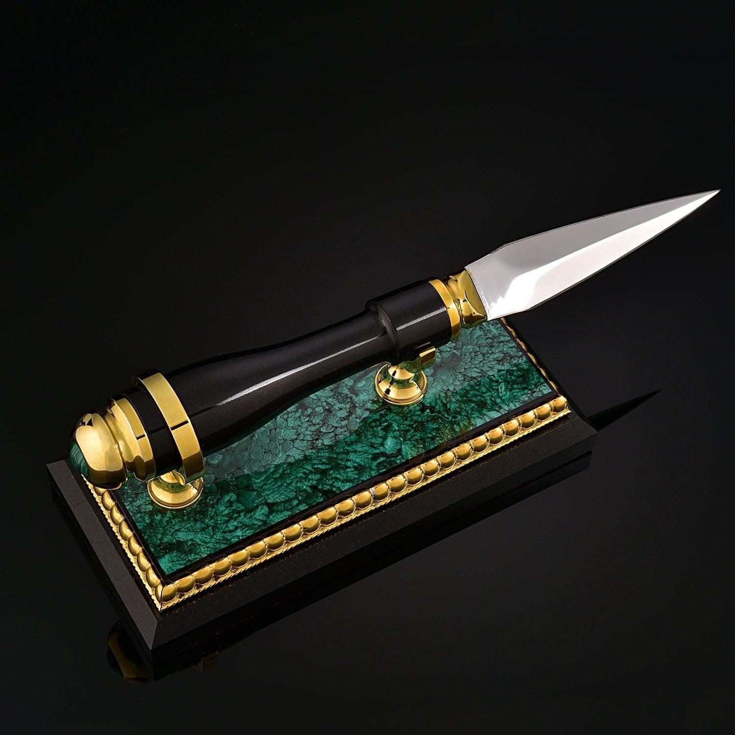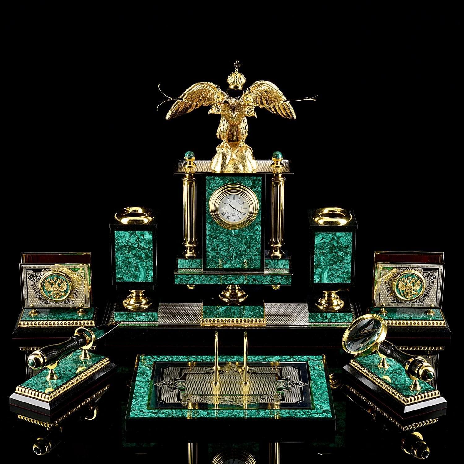 Пафосный настольный набор сделан из малахита, зеленого минерала с богатой историей (свыше 19 тысяч лет). В древности камень считали символом исполнения желаний. В эпоху неолита и до железного века изготавливали бытовые предметы, украшения, краску, стекло, медь. Им украшали античные парадные залы. Древнеегипетские красавицы малахитовый порошок наносили на веки в качестве теней. Название минерал получил благодаря окраске цвета листьев мальвы. В средние века из малахита изготавливали амулеты и талисманы, посуду, кубки, предметы культа. Зеленый цвет камня олицетворял жизнь и рост. Минерал отгонял злых духов. В России малахит известен с середины 18 века. Колонны Исаакиевского собора, Малахитовый и Георгиевские залы в Зимнем дворце сделаны из камня. В 1851 году для Лондонской выставки на камнерезной фабрике Демидовых изготовили двери, напольные вазы, камин, столы, стулья, подставки для часов из малахита. Эксклюзивная работа мастеров Златоуста. Материал: бронза, латунь, малахит, долерит, золото, никель, стекло. ....