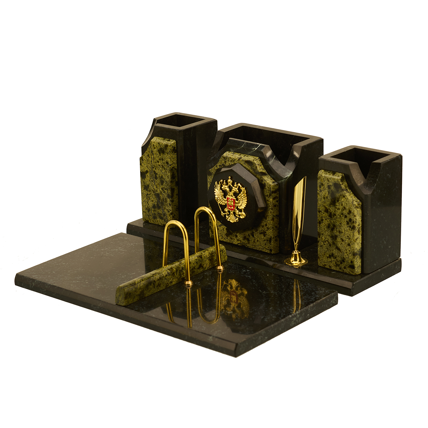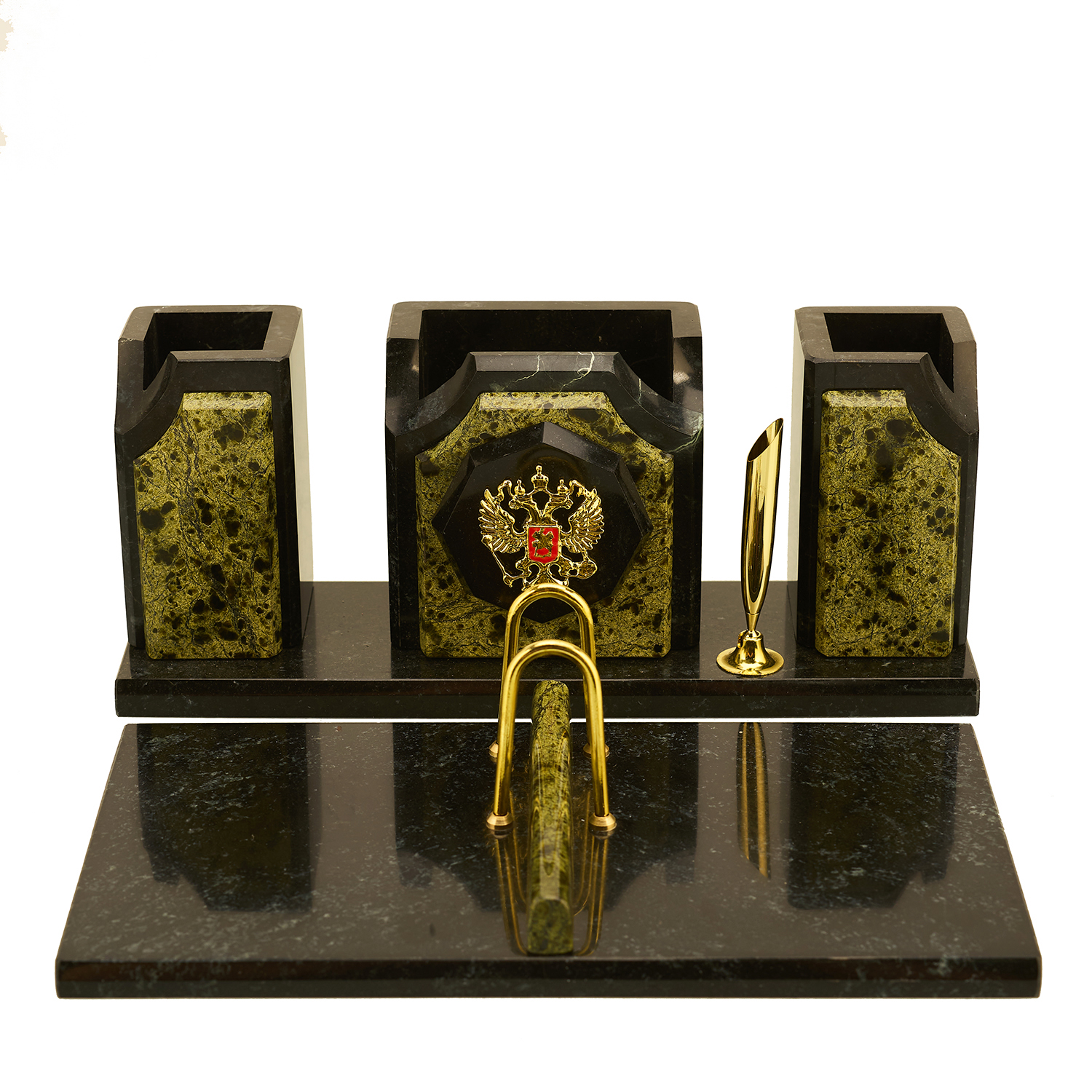 Настольный письменный набор из камня "Герб РФ".Материалы: змеевик, латунь, золочение, эмаль.