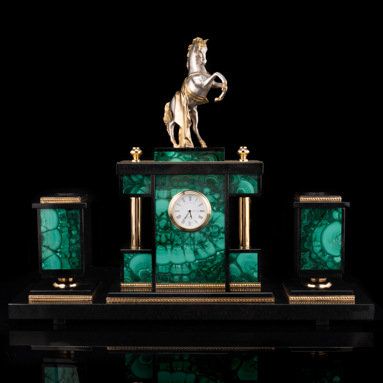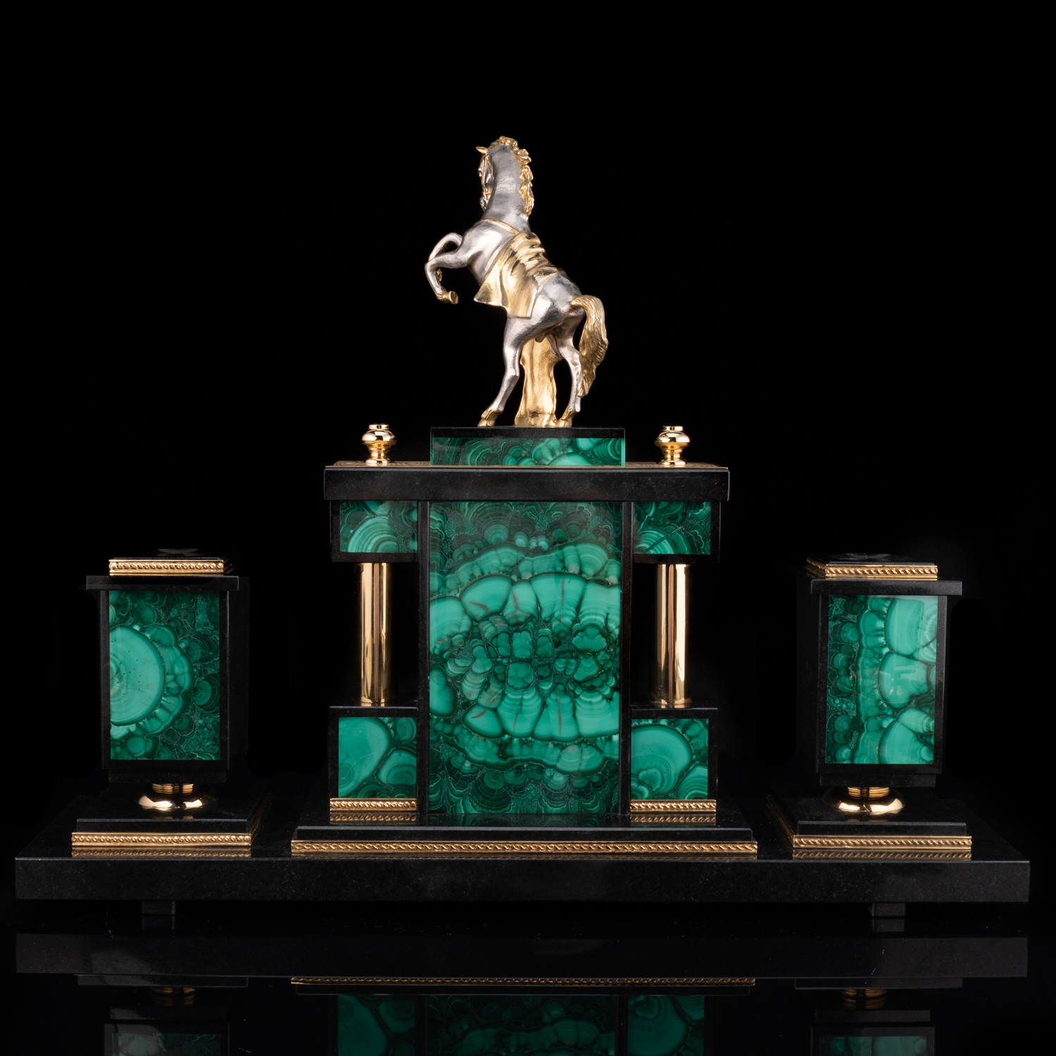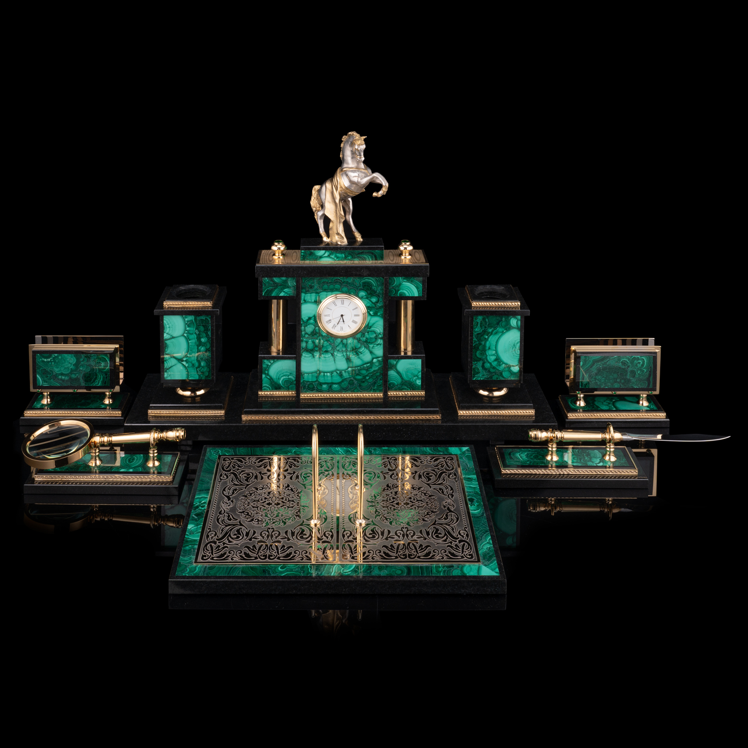 Настольный письменный набор из малахита "Конь". Златоуст.Материалы: малахит, бронза, латунь, никель, золото 999,9*.