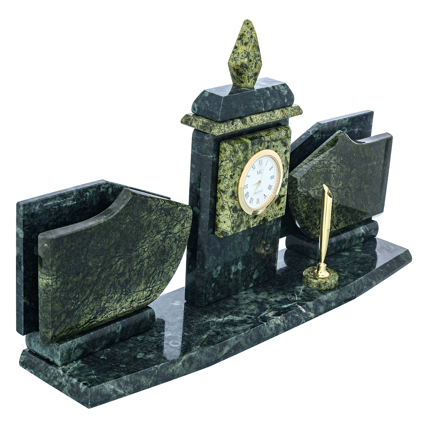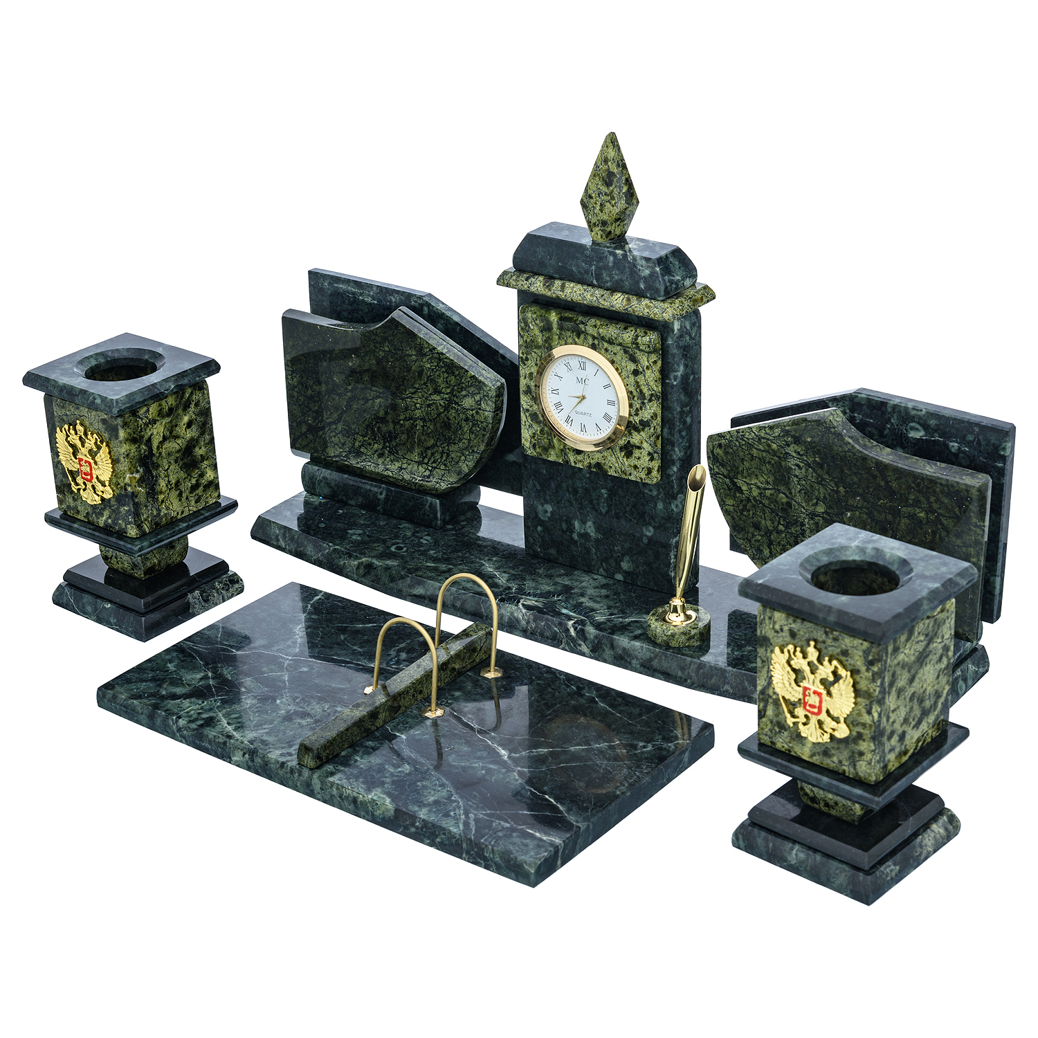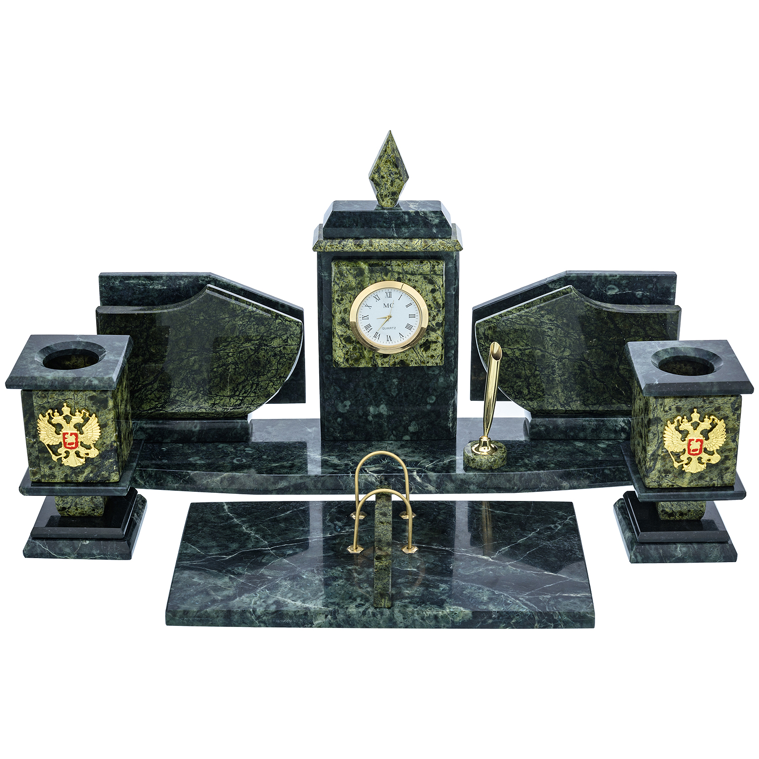 Русские подарки и сувениры → Настольные принадлежности → Настольные наборы → Письменный набор из натурального камня "Герб РФ"