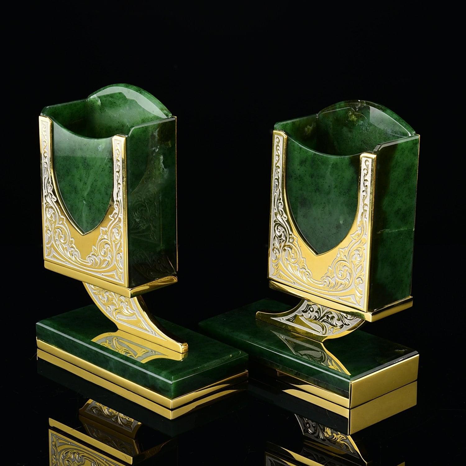 Набор изготовлен мастерами Златоуста - поставщиками посуды, холодного оружия и элементов декора ручной работы для главной резиденции президента России, Московского Кремля. Он представляет собой монументальную композицию  с корпусами, которые  выточены токарем из   нефрита, с элементами, отлитыми из латуни и декорированными в техниках Златоустовской гравюры на металле.