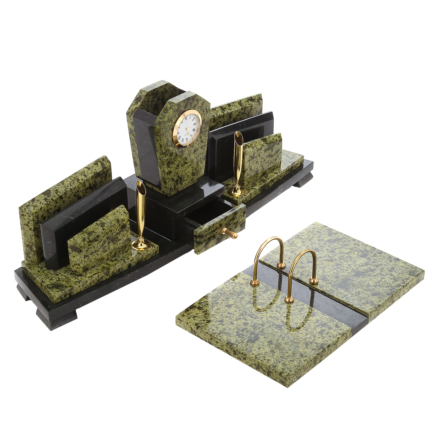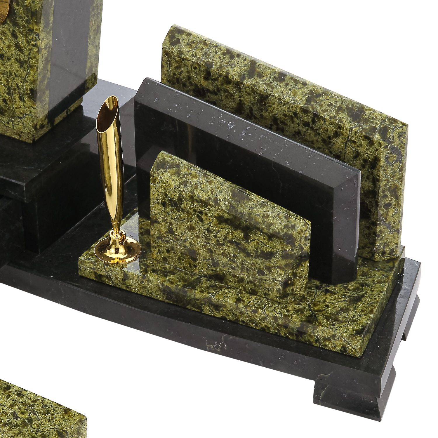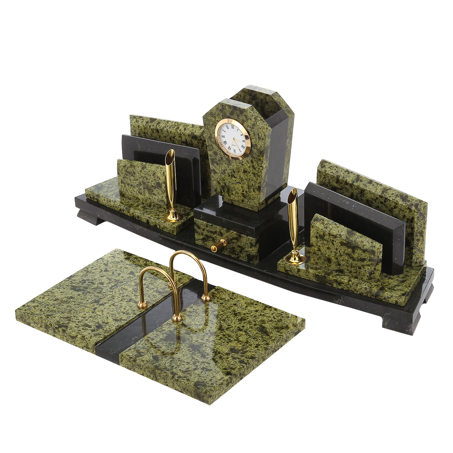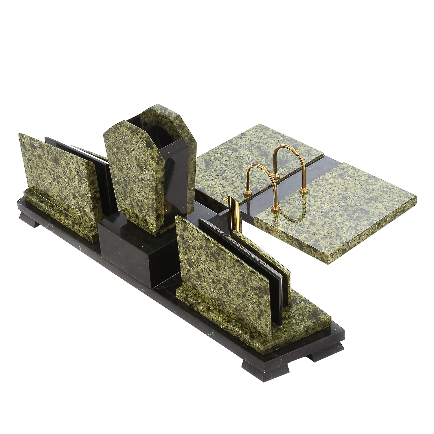 Письменный набор также включает подставку под календарь, визитницы, отделения для мелких бумаг и ручки, отлитые из металлического медного сплава латуни, оформленной стойкой эффектной позолотой. Он станет источником живительной энергии, свойственной природному минералу, и подчеркнет статус руководителя. Эксклюзивная интерьерная работа, письменный набор с календарем из камня офиокальцита станет отличным презентом боссу, коллеге или партнеру по бизнесу.