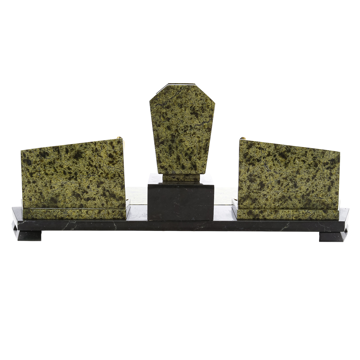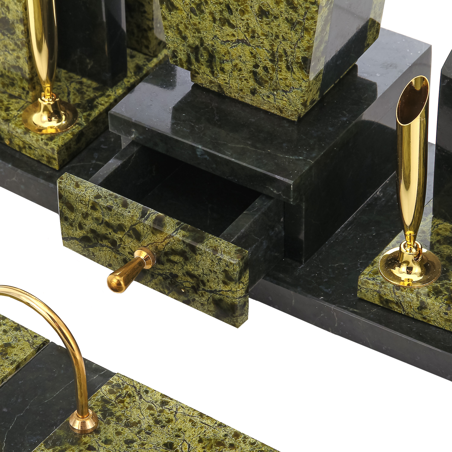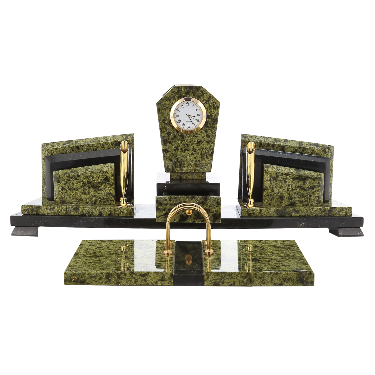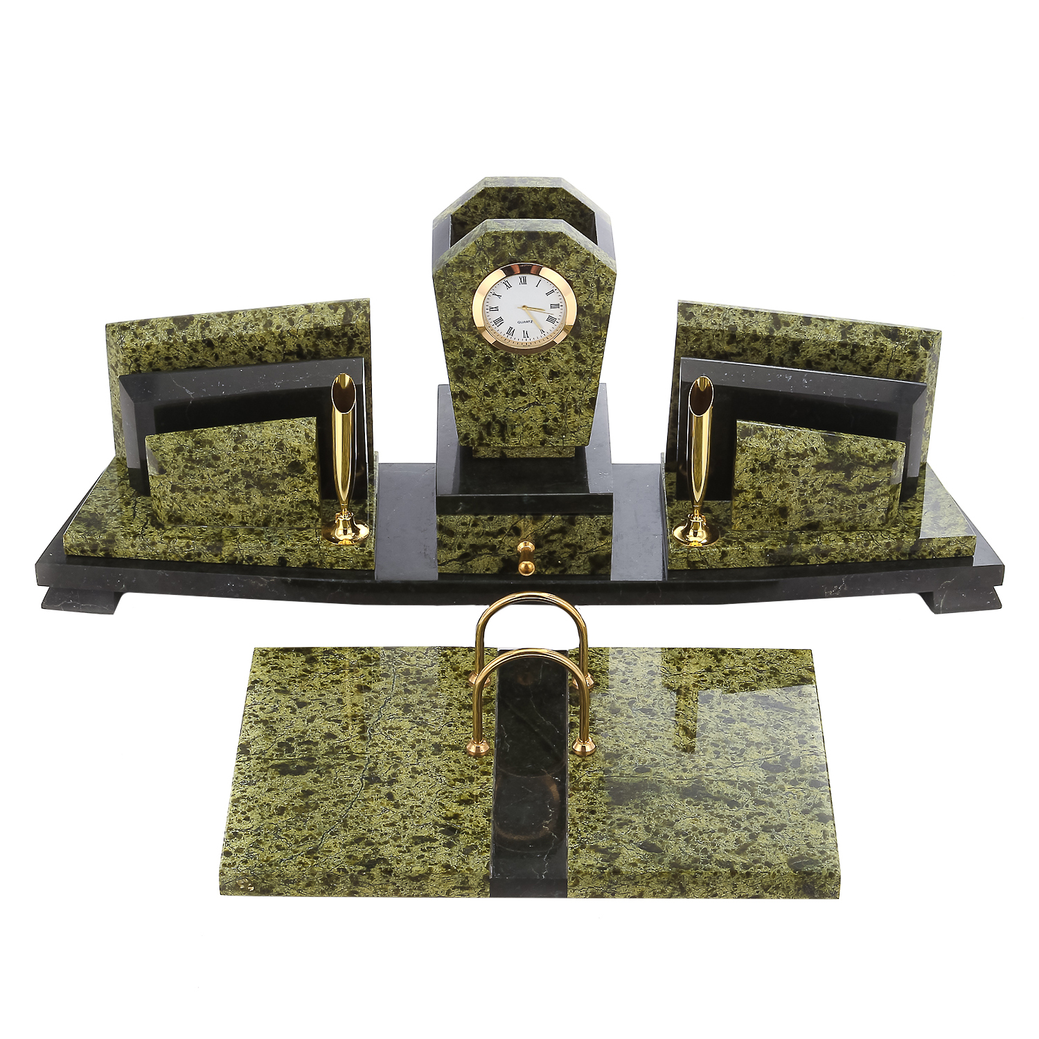 Письменный набор также включает подставку под календарь, визитницы, отделения для мелких бумаг и ручки, отлитые из металлического медного сплава латуни, оформленной стойкой эффектной позолотой. Он станет источником живительной энергии, свойственной природному минералу, и подчеркнет статус руководителя. Эксклюзивная интерьерная работа, письменный набор с календарем из камня офиокальцита станет отличным презентом боссу, коллеге или партнеру по бизнесу.