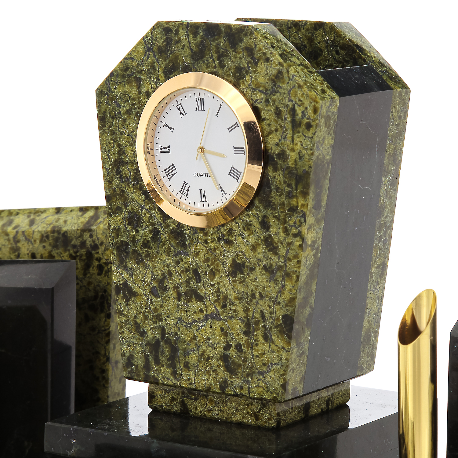 Это набор представлен в виде композиции из множества фигурных элементов. Посреди нее возвышается корпус из камня-самоцвета офиокальцит, внутрь которого вмонтирован часовой механизм и круглый циферблат. Напомним, что этот красивый древний камень в далекие времена Византийской империи украшал дворцы и храмы. просторные виллы в предместьях Древнего Рима. 25 веков тому назад этот камень пользовался особой популярностью среди скульпторов-камнерезов.