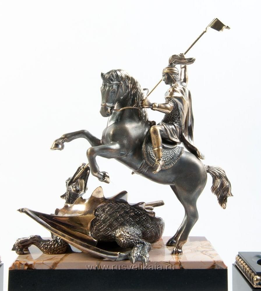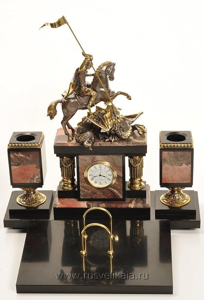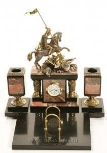 Натуральный камень помогает человеку стать более собранным, помогает концентрировать силы, оттачивает остроту мысли. Набор из натурального камня с элементами в имперском стиле и образом Святого Георгия станет предметом силы в интерьере. Известна яшма или яспис (с турецкого - пестрый или крапчатый камень) с палеолита, из него предки изготавливали орудия труда, печатки и амулеты, оберегавшие от расстройств зрения и засухи. Екатерина Вторая развивала камнерезное дело и создала заводы по обработке яшмы. В творениях Фаберже, включая пасхальные яйца, применялась яшма. Среди 88 предметов, приобретенных императрицей Марией Федоровной в 1891-1898 годах, 5 были сделаны из яшмы. В 1912 году фирма заказала у Екатеринбургской гранильной фабрики сотни пудов колканской, николаевской и самой дорогой орской яшм. ....Извините, товар отсутствует
