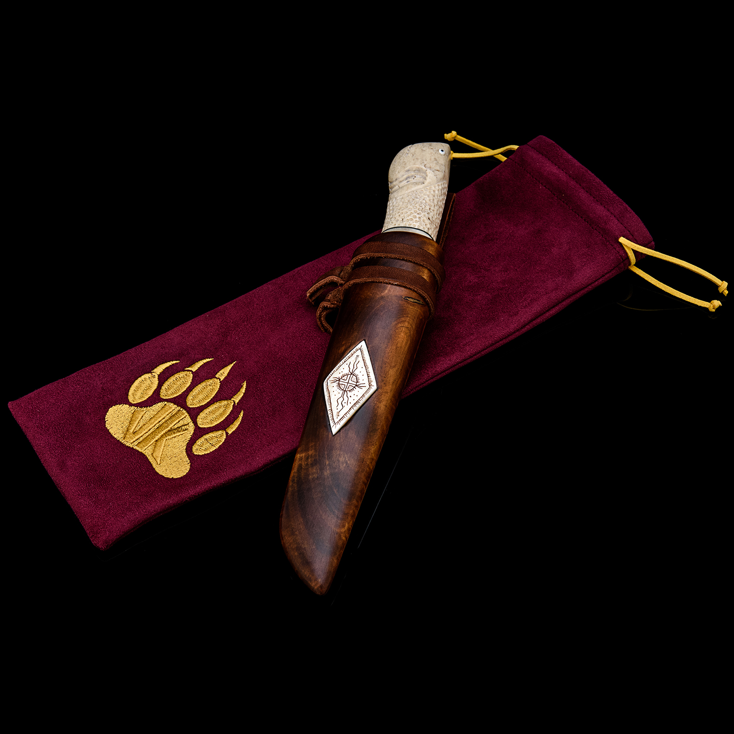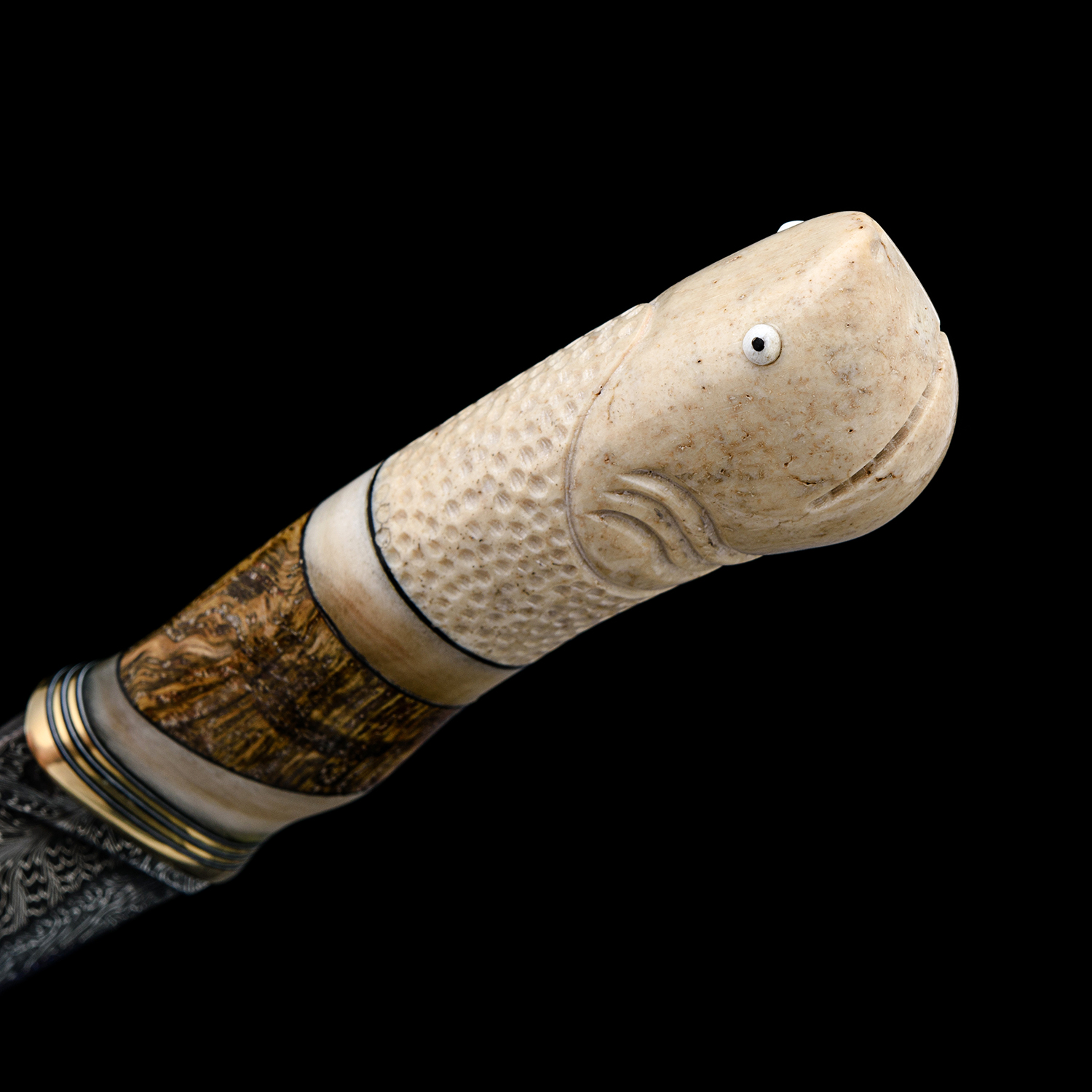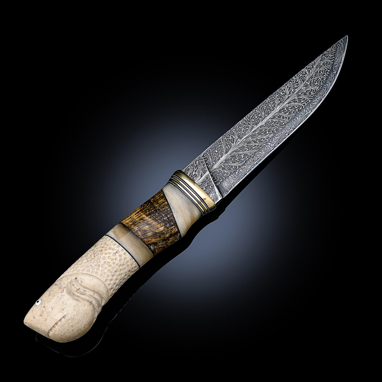 Нож сувенирный с рукоятью из кости "Акула".Материалы: дамасская сталь, ребро коровы Стеллера, клык моржа, кожа.