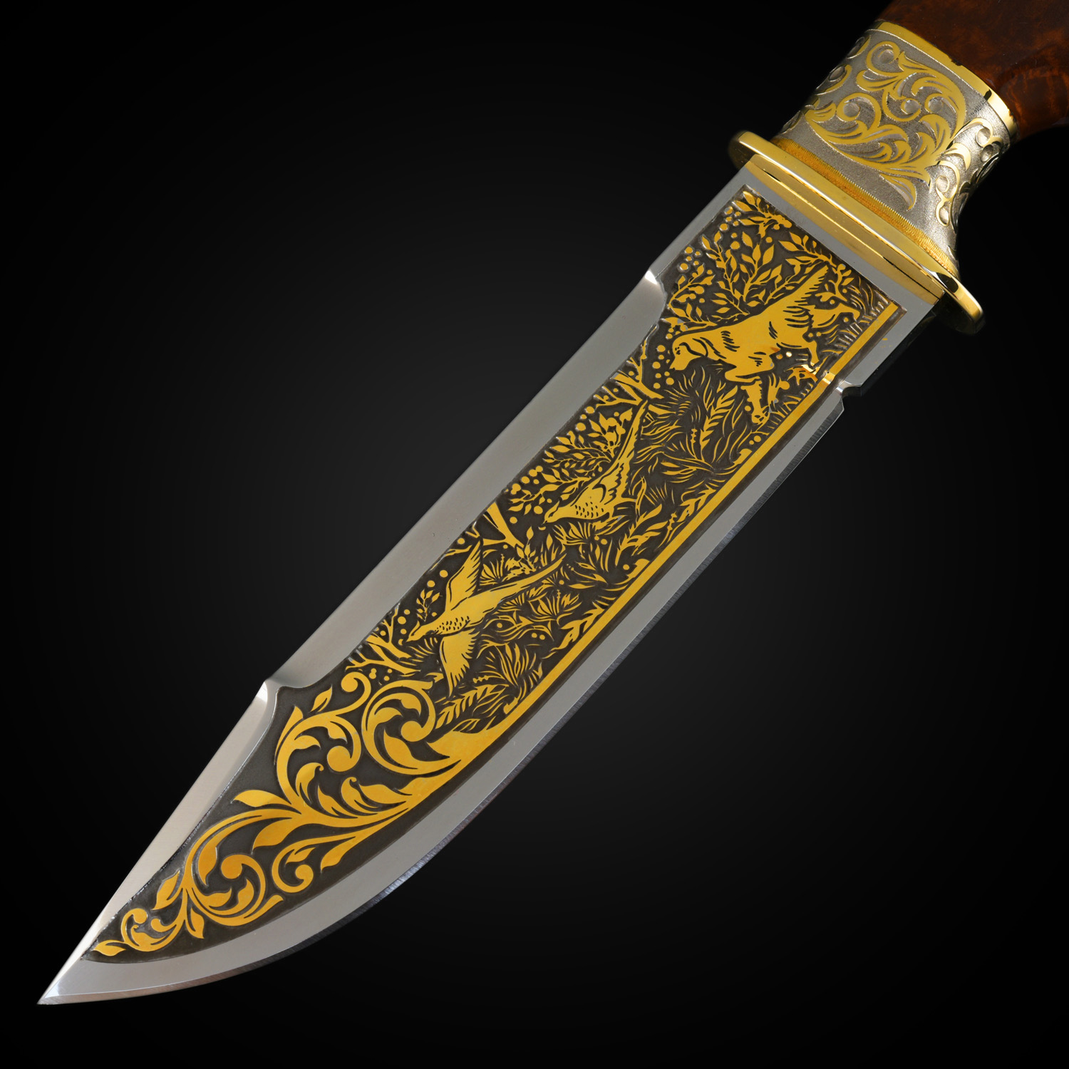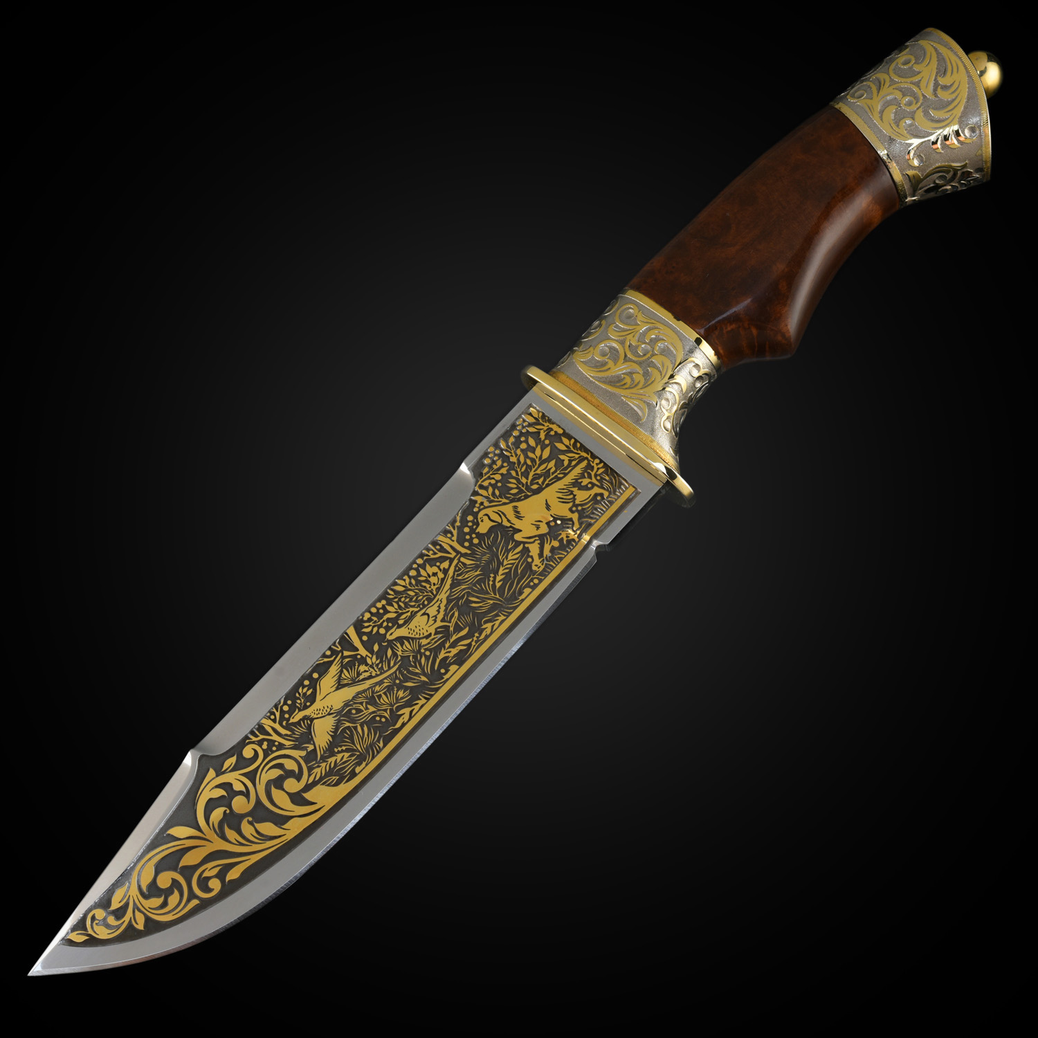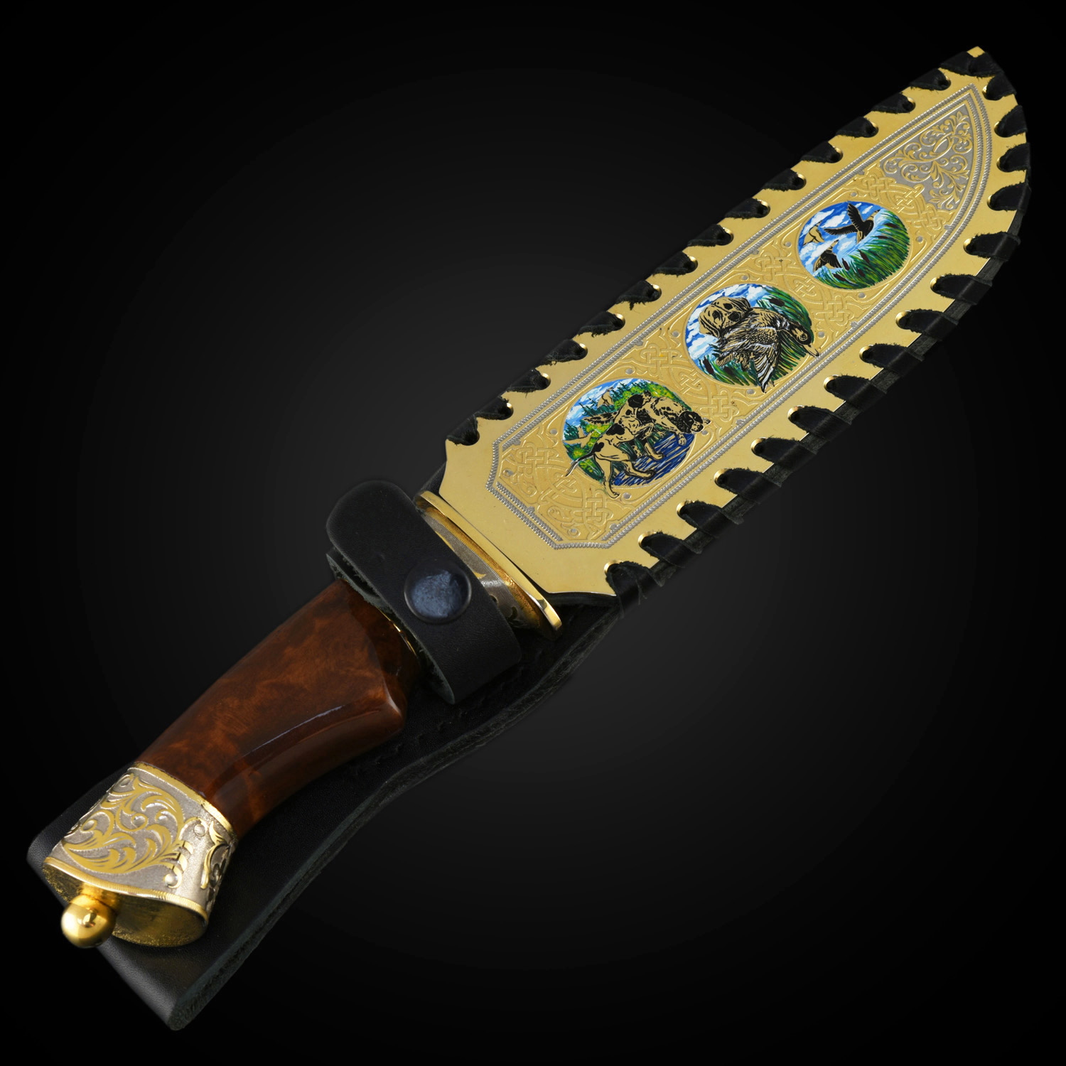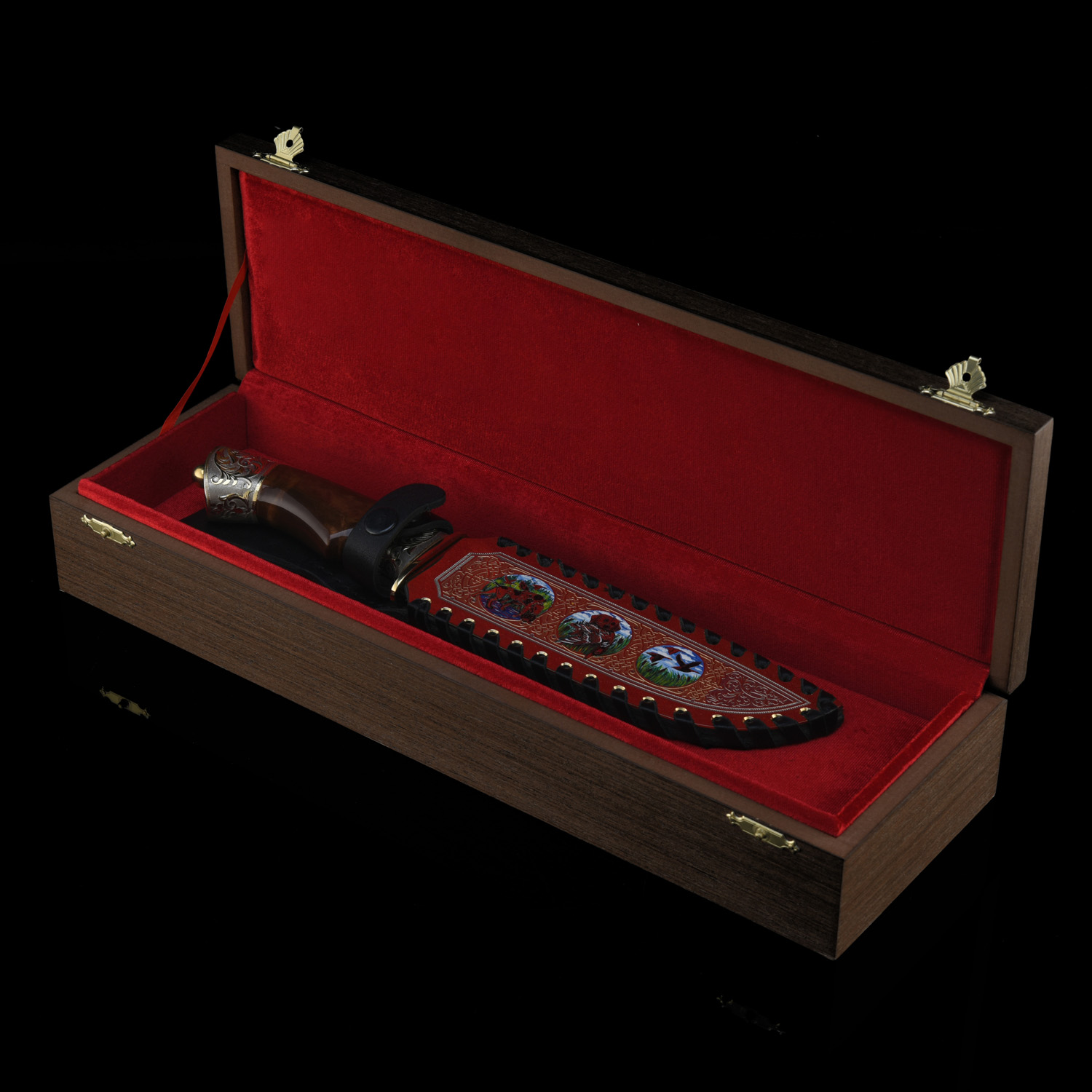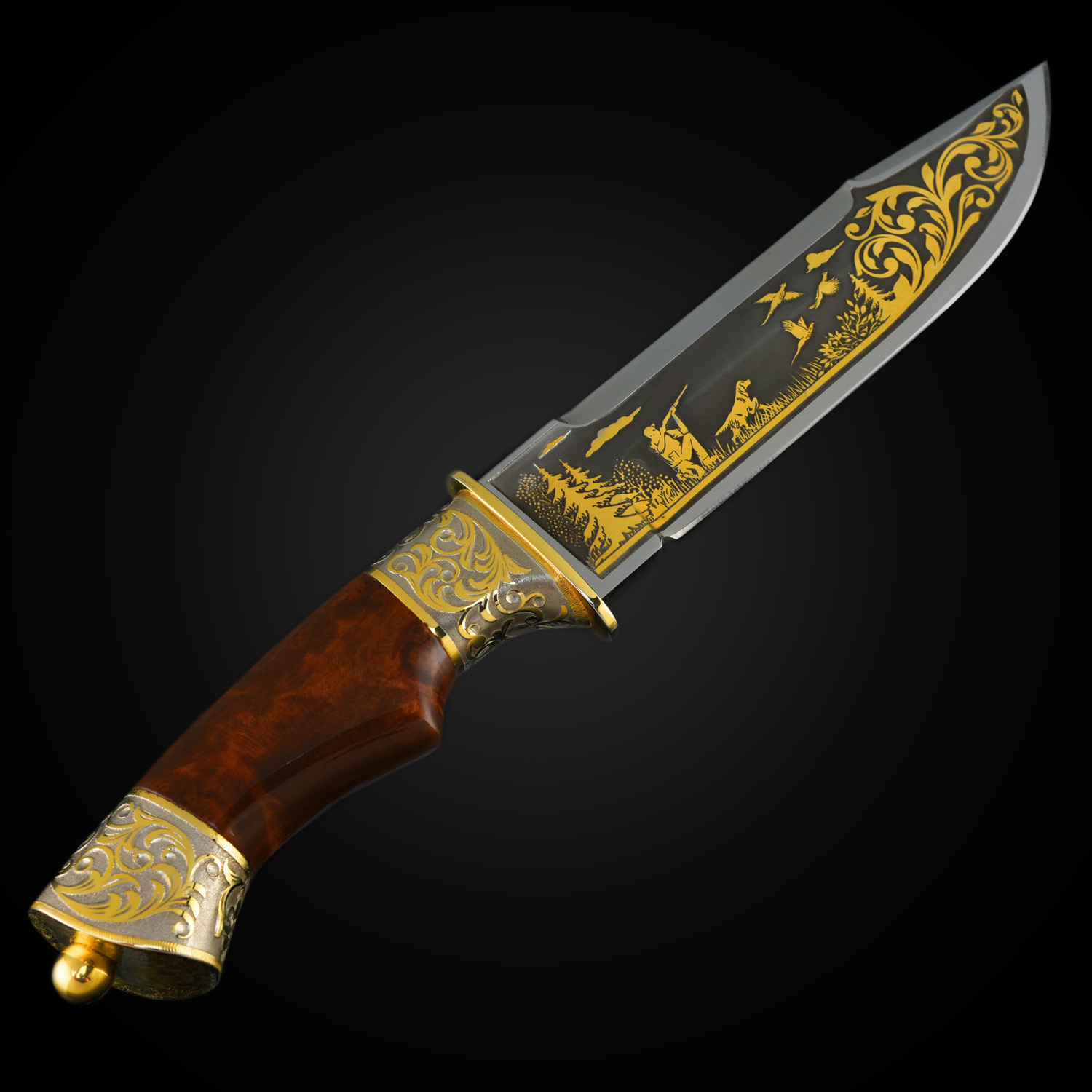 Нож сувенирный "Охота". Златоуст.Материалы: сталь ЭИ-107, латунь, никель, золото 999,9*, эмаль, дерево, кожа.