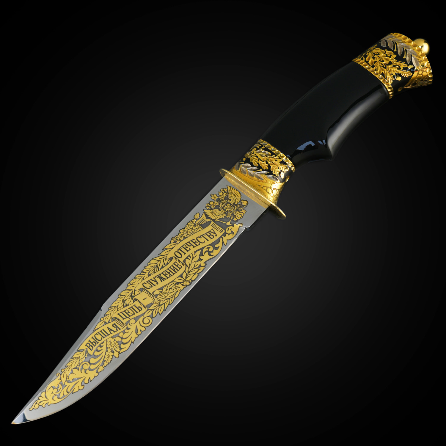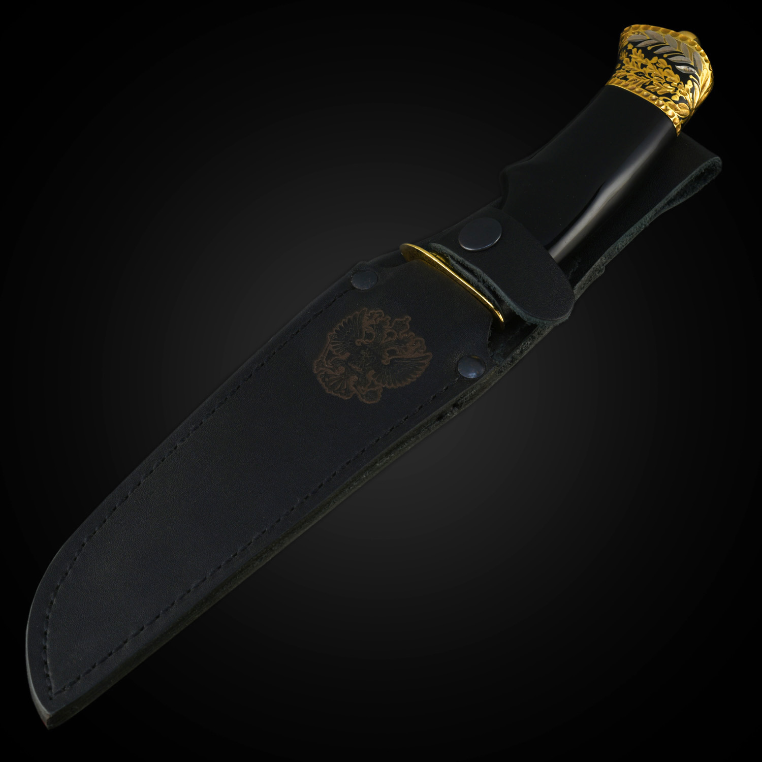 Нож сувенирный "Таежный". Златоуст.Материалы: сталь ЭИ-107, латунь, никель, золото 999,9*, дерево, кожа.